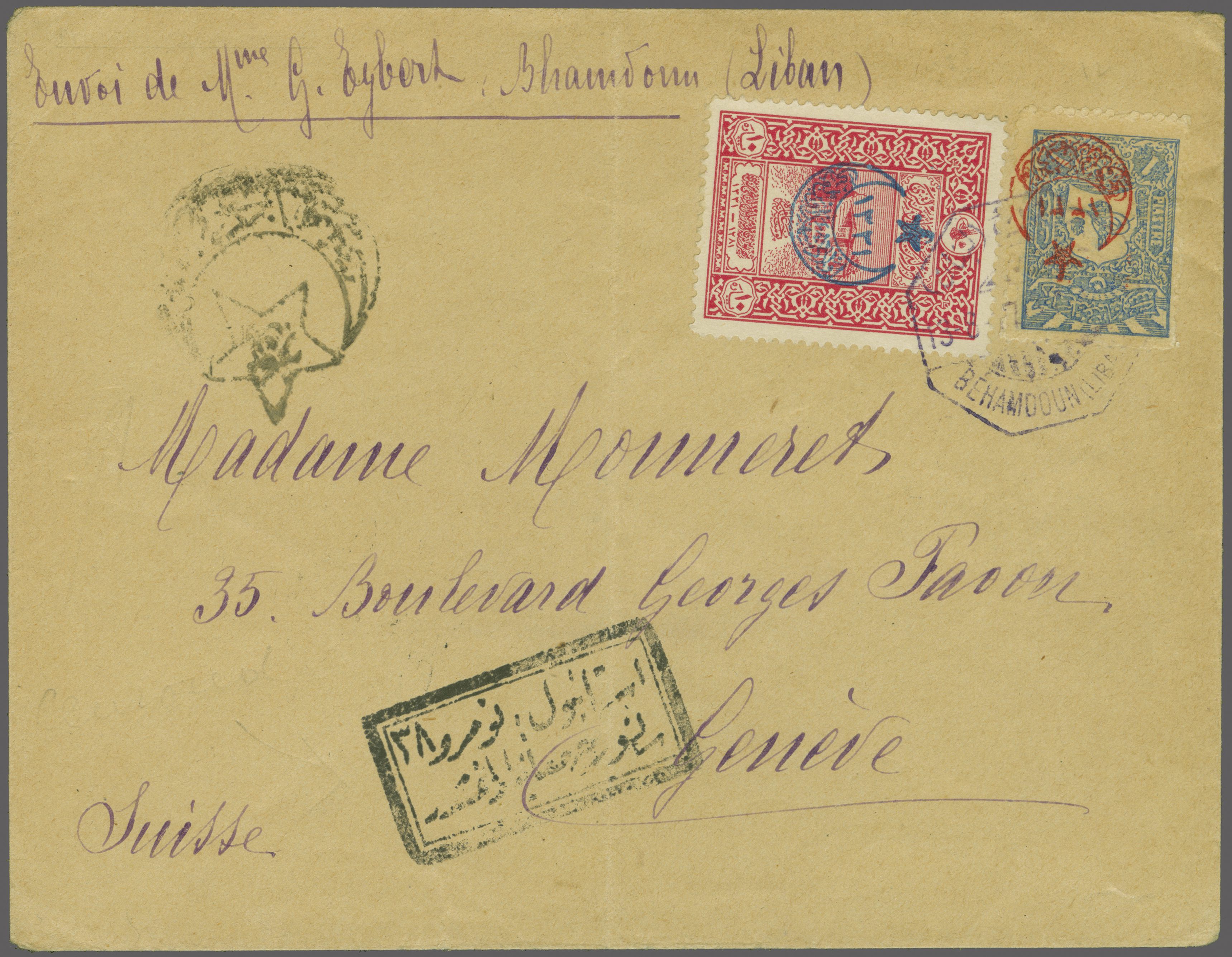 Sanjak of Djebel Lubnan - Behamdoun / Bhamdun 1916: Turkey 1 pi. blue and 10 pa. red used on 1917 censored cover to Geneva, Switzerland tied by bilingual octagonal "BÉHAMDOUN (LIBAN)" datestamp (Aug 13) in black (Coles &