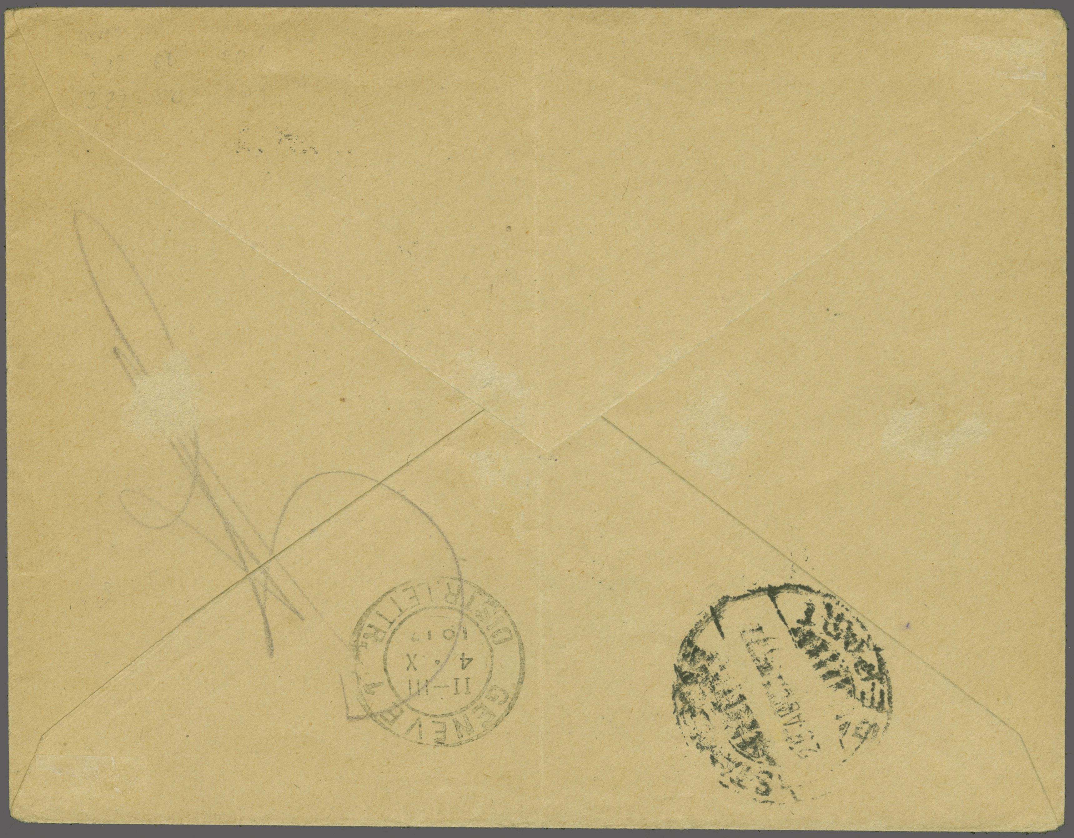 Walker fig. 175, Ziya fig. 2 - rated 'RRR'). Star and Crescent and framed Censor handstamps in black at left and reverse with Stamboul transit and Geneva arrival (Oct 4). File fold away from the adhesives, a fine cover. Provenance: Collection Herry
