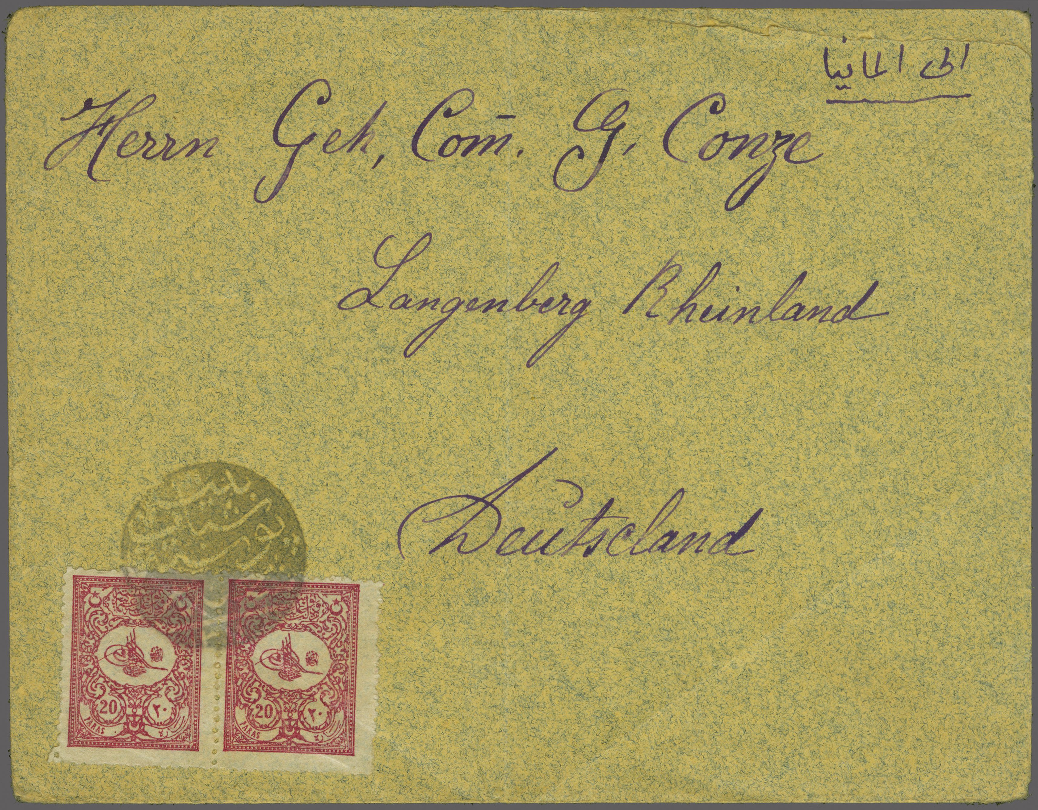 Sanjak of Djebel Lubnan - Beit Chebab / Bait Sabab / Beyt Şebab 1901: Turkey 20 pa. lilac-rose, a horizontal pair used on 1904 cover to Langenburg, Germany tied by superb strike of circular "BEIT CHEBAB POST SHUBESI - 314"