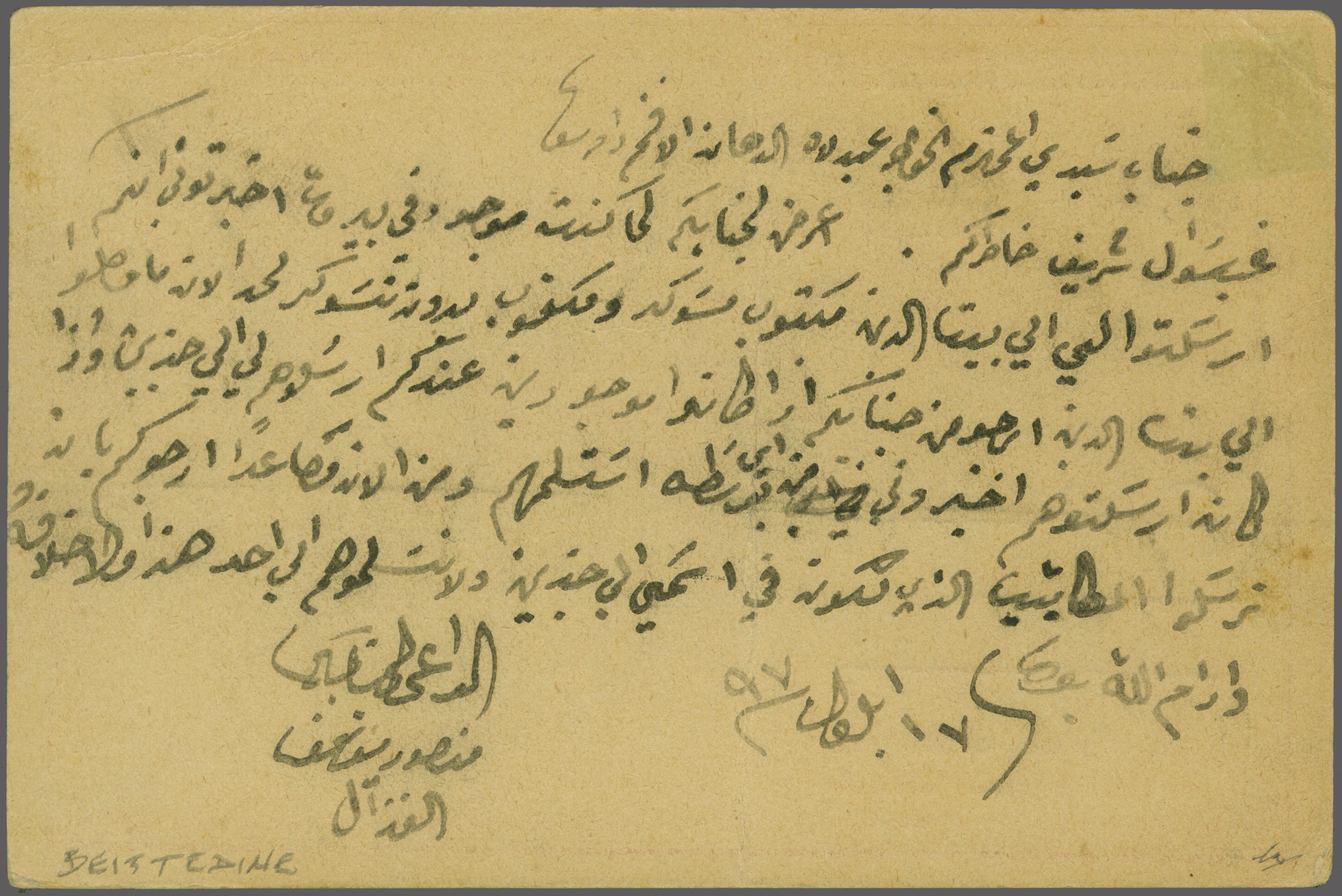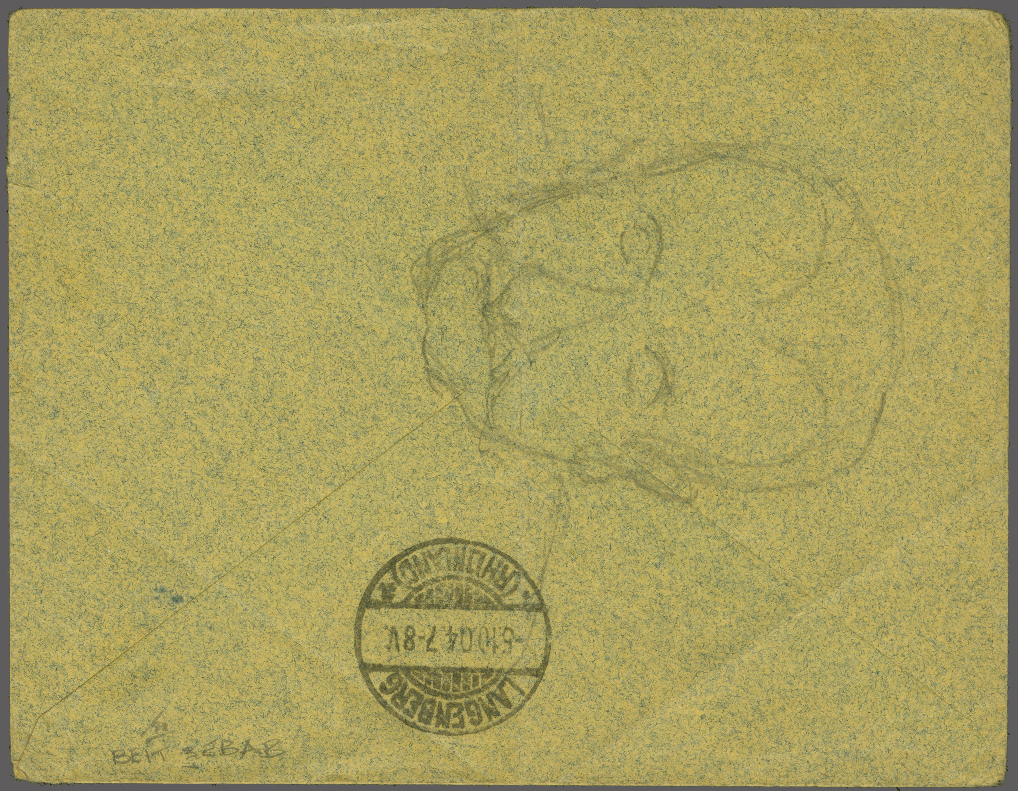 negative seal handstamp (Beit Chebab Branch Office 1898) in black (Coles & Walker fig. 65, Ziya fig. 1 - rated 'RRR*' - unrecorded on letter). Reverse with Langenburg arrival cds (Oct 5) together with a pencil drawing. Exceptional and of great