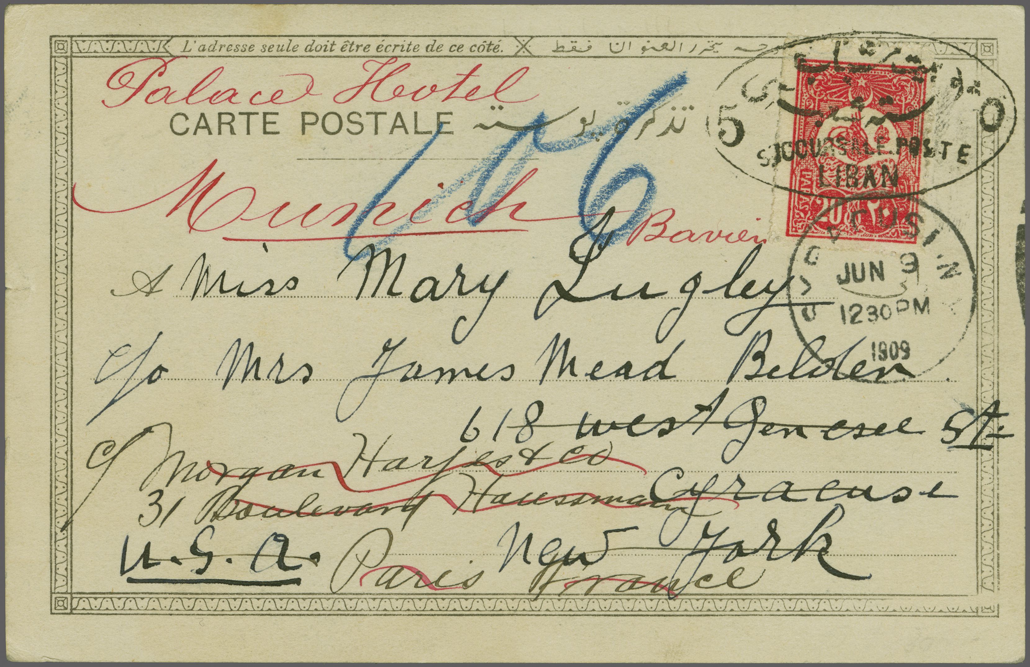 LIBAN" bilingual handstamp (Beit Chabab Postal Branch No. 5) in black (Coles & Walker fig. 66, Ziya fig. 2 - rated 'RRR'). Syracuse arrival (June 9). A fine strike of a scarce cancellation (Image 1)