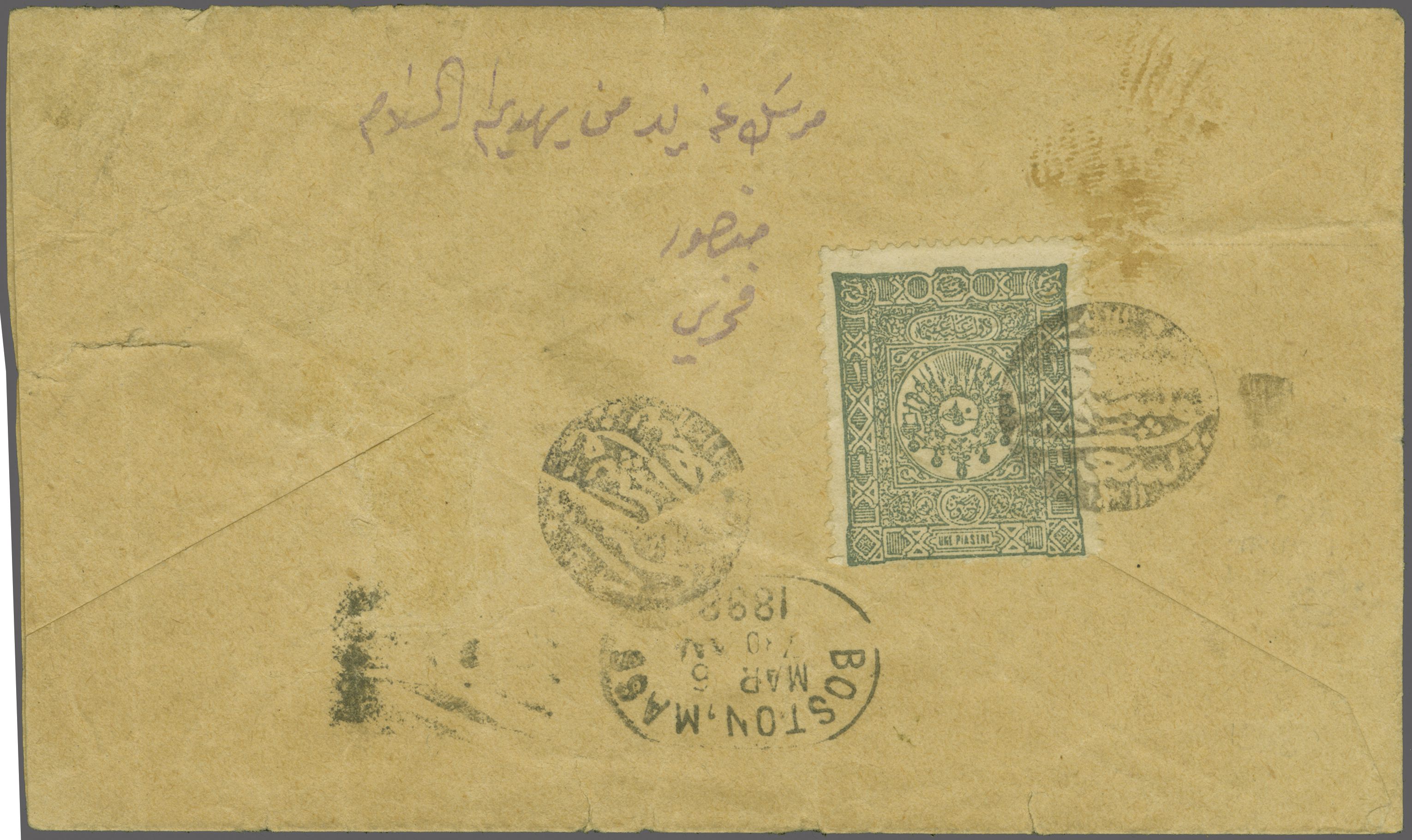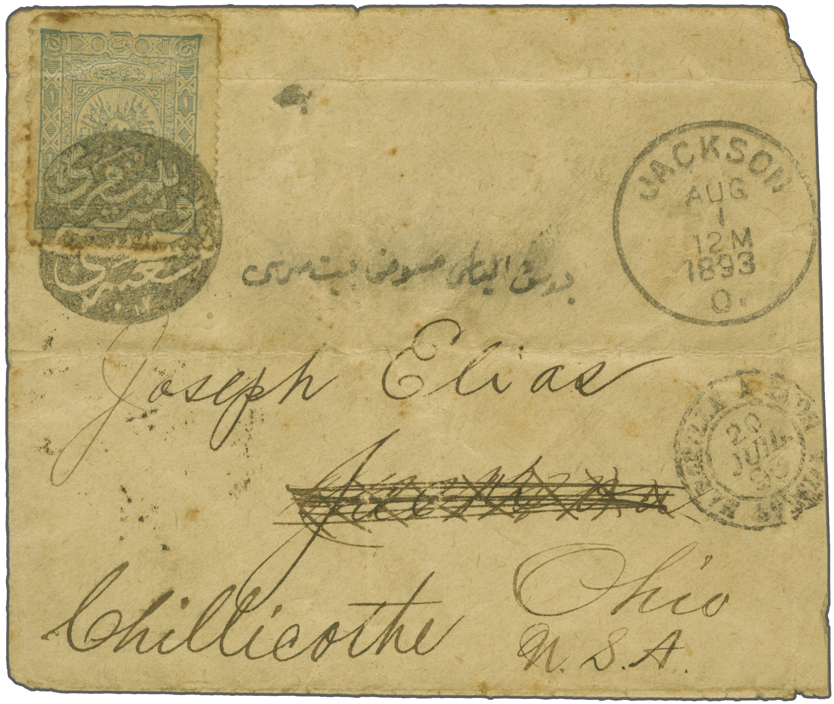 handstamp (Beir Meri Postal Branch - 1893) in black (Coles & Walker fig. 163, Ziya fig. 1, - rated 'RRR'). Mailed via France with Marseille cds (July 20), New York transit and readdressed upon arrival (Aug 1) to Chiliconthe. Faults but one of