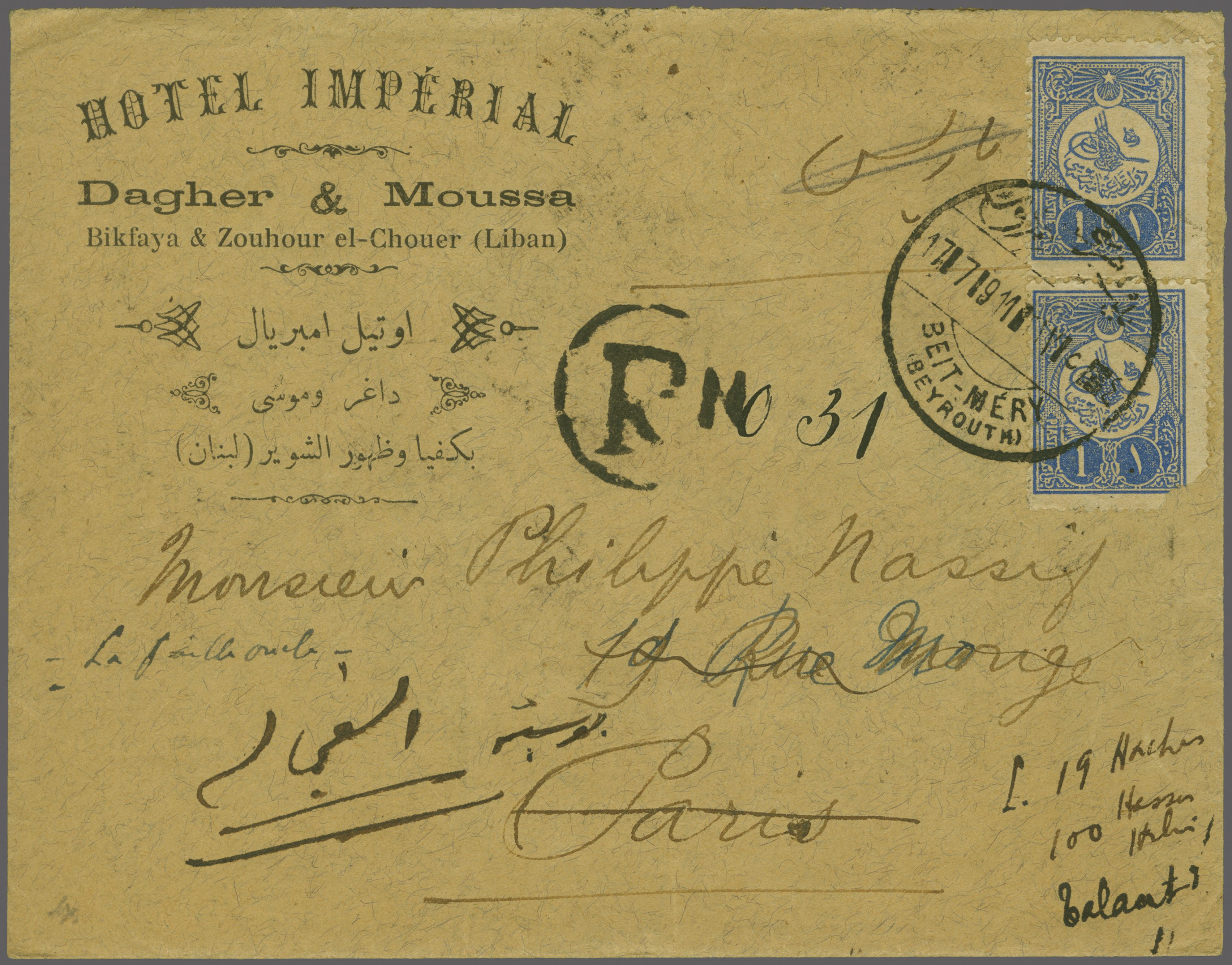 Sanjak of Djebel Lubnan - Beit Meri / Bait Mari / Beyt Meri 1909: 1 pi. blue, a vertical pair, used on registered 1911 cover with contents to Paris and readdressed upon arrival to Egypt, tied by bilingual circular "BEIT-MÉRY /