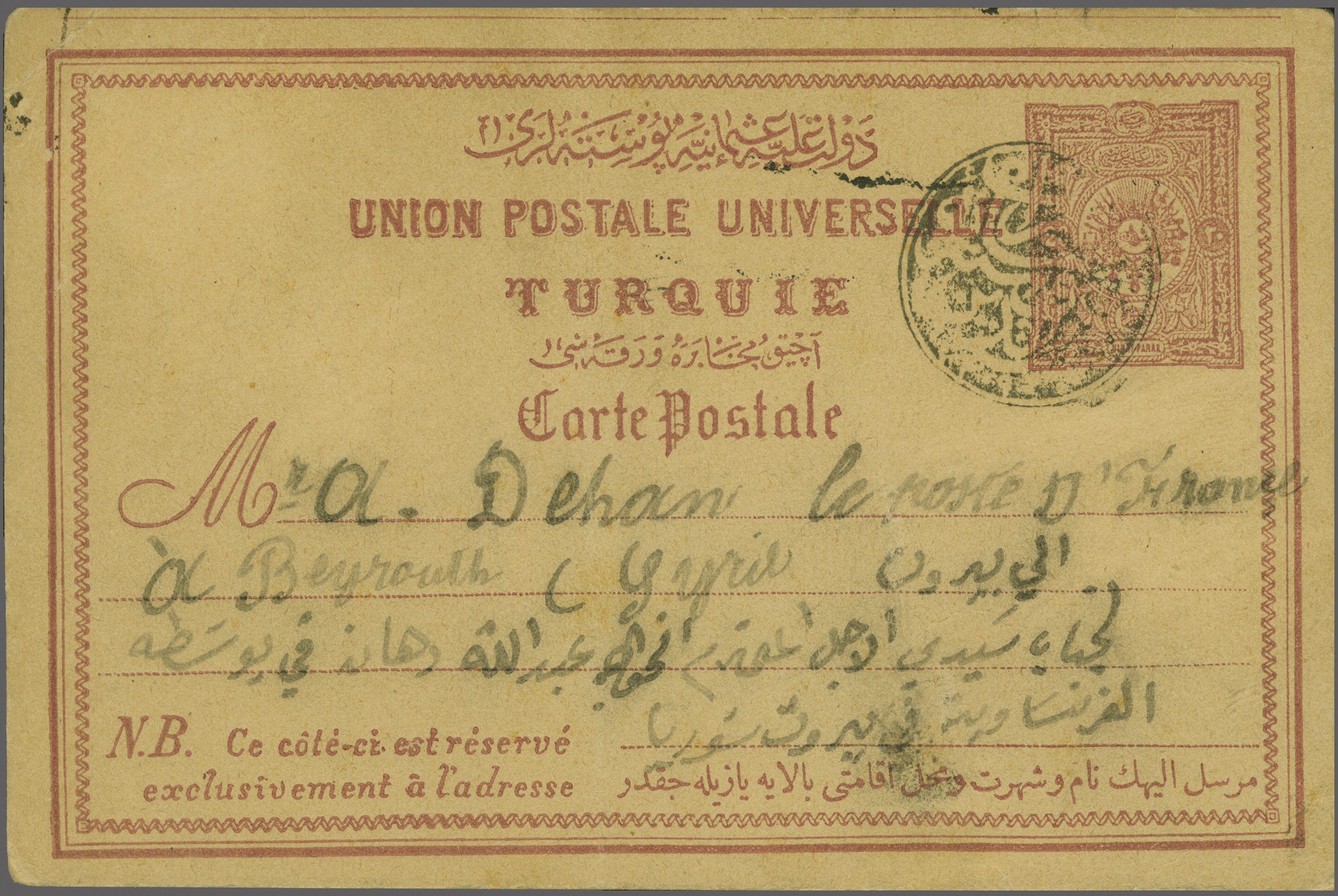Sanjak of Djebel Lubnan - Beittedine / Bair ad-Din / Beyteddin 1892: Turkey 20 pa. claret postal stationery card ued to Beirut cancelled by circular "TELEGRAF VE POSTA HANE BEITTEDINE - 1310" negative seal handstamp (Telegraph