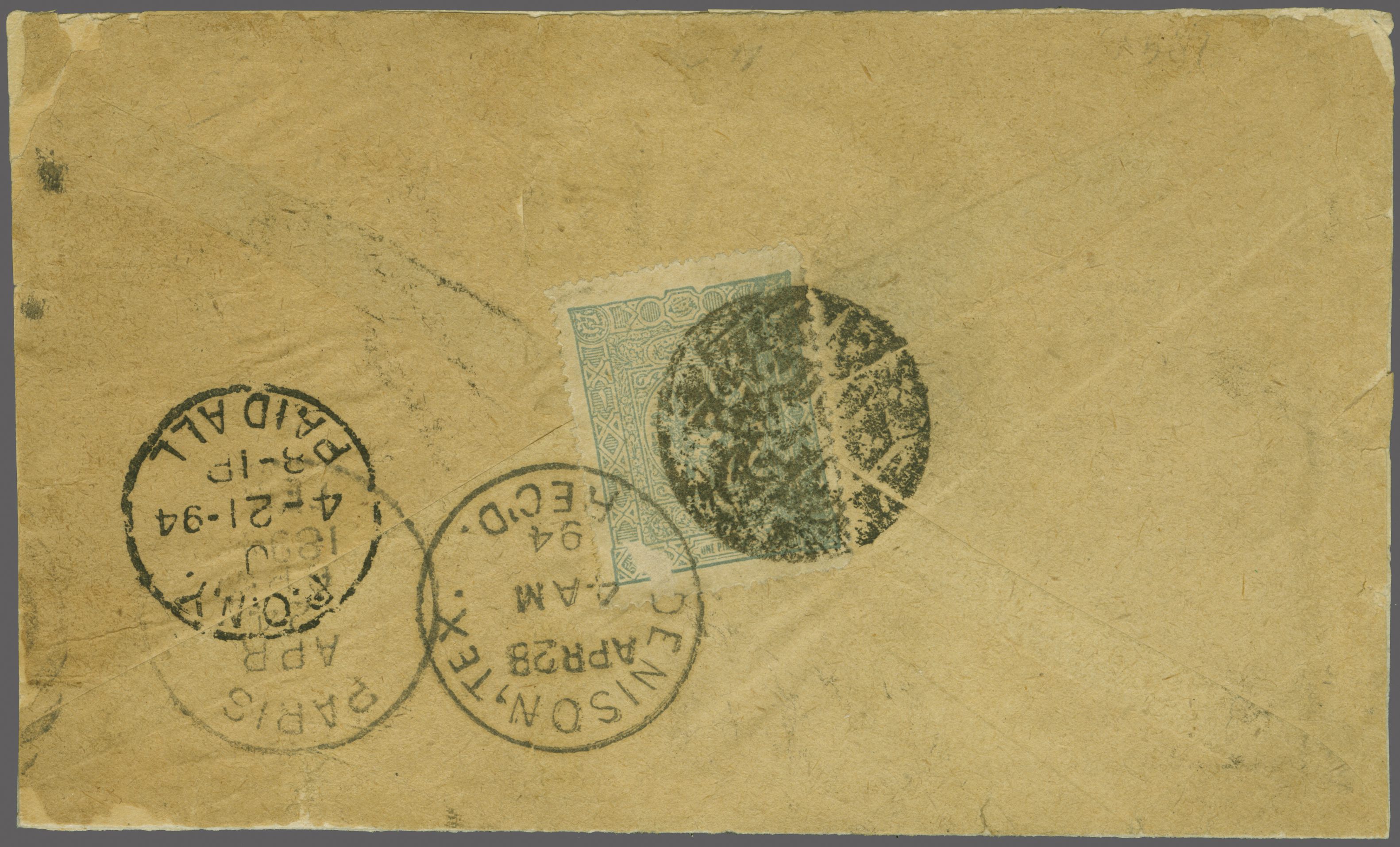 POSTA SHUBESI - 1308" negative seal handstamp (Bekfiya Postal Branch 1892) in black (Coles & Walker unlisted, Ziya fig. 1 - rated 'RRR'). The stamp also tied by Denison arrival cds (April 28) with New York transit and Paris (Texas) transits