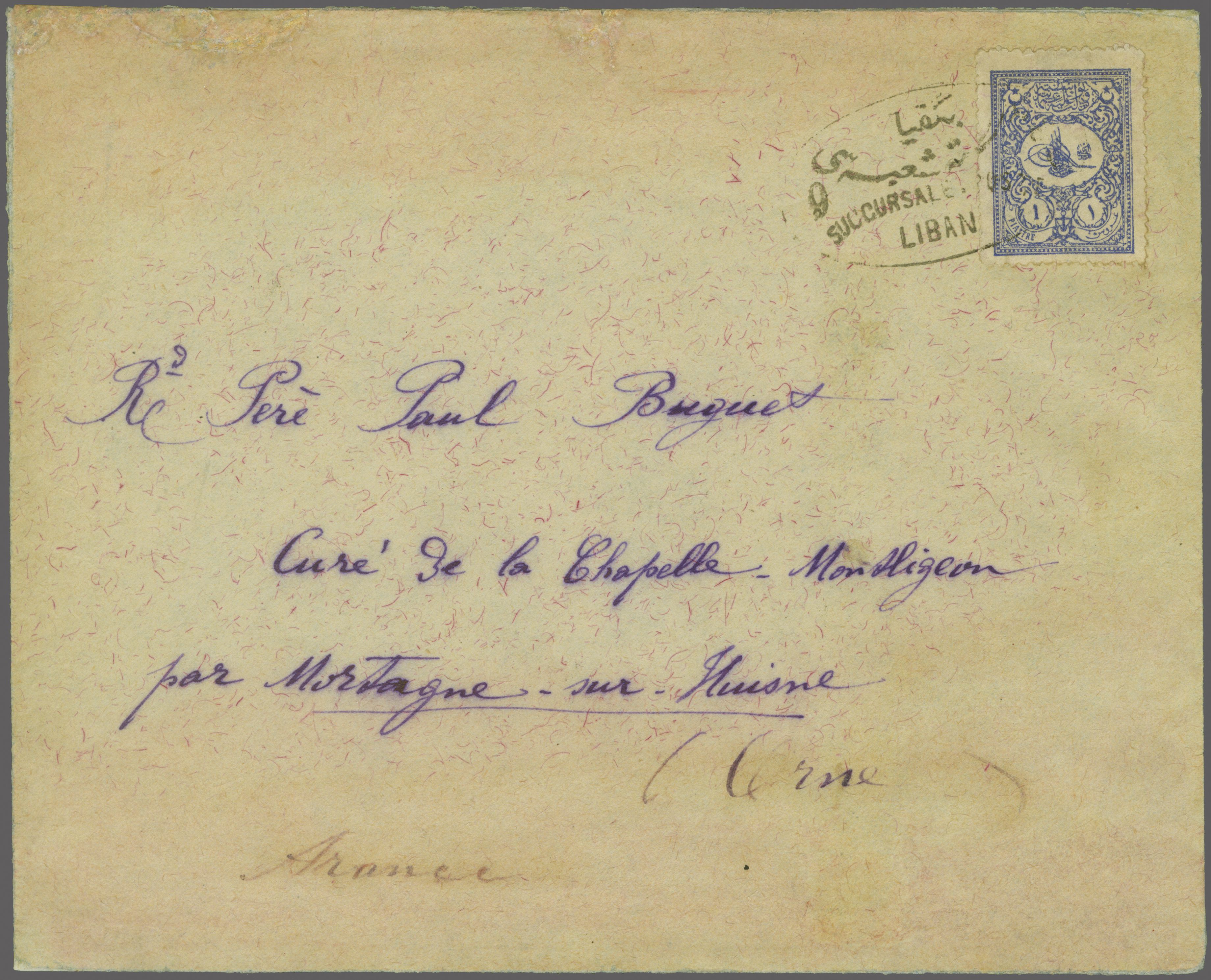 Sanjak of Djebel Lubnan - Bekfiya / Bikfayya / Bekfaya 1901: Turkey 1 pi. blue, a single example on cover to France tied by oval framed "9 BEKFIYA SUCCURSALE POSTE LIBAN" bilingual handstamp (Bekfiya Postal Branch No. 9) in