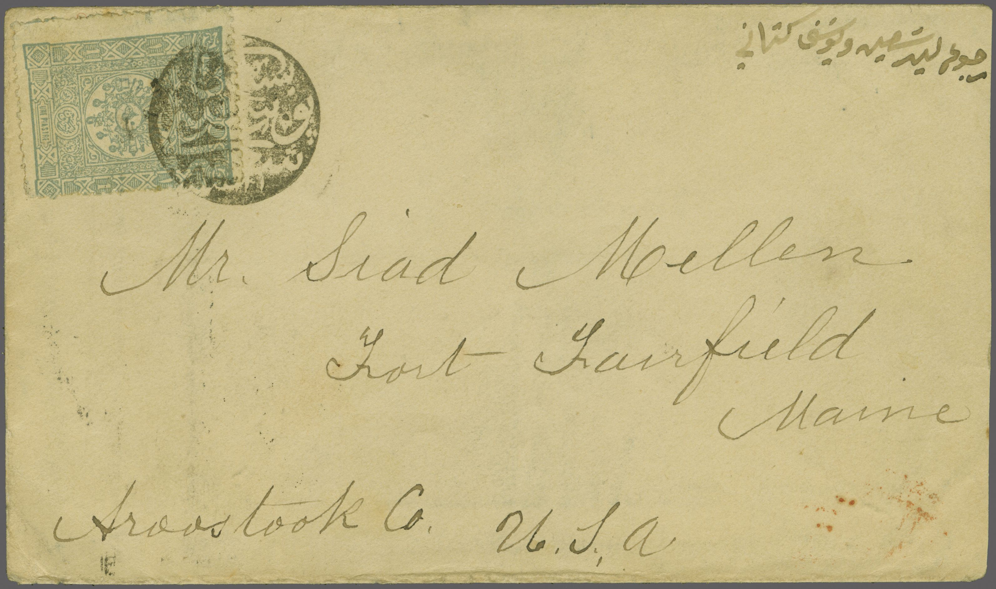 Sanjak of Djebel Lubnan - Beskinta / Beskenta 1892: Turkey 1 pi. grey-blue, a used example on 1896 cover to Fort Fairfield, Maine, USA tied by circular "BESKINTA POSTA SHUBESI" negative seal handstamp (Beskinta Postal Branch)