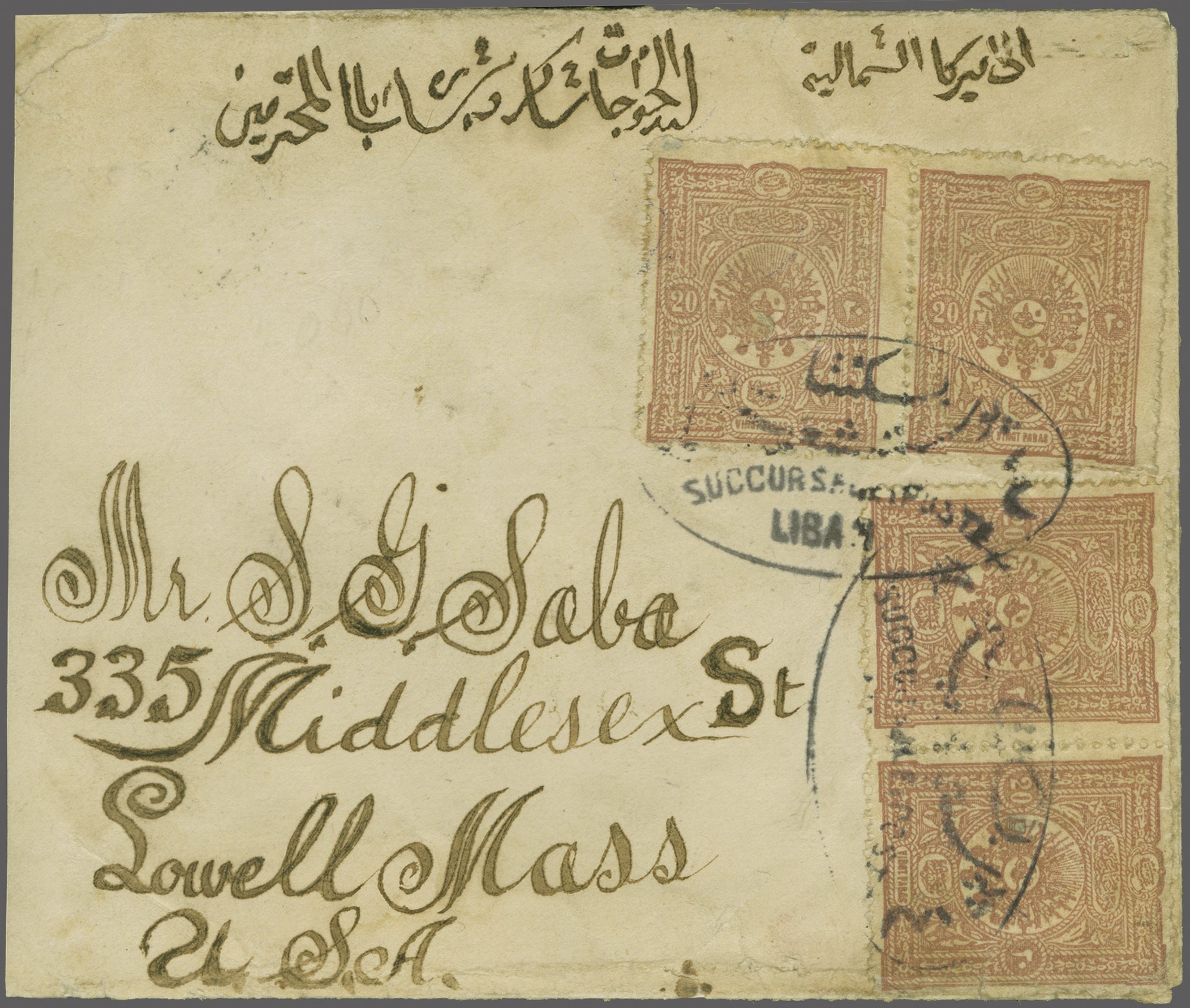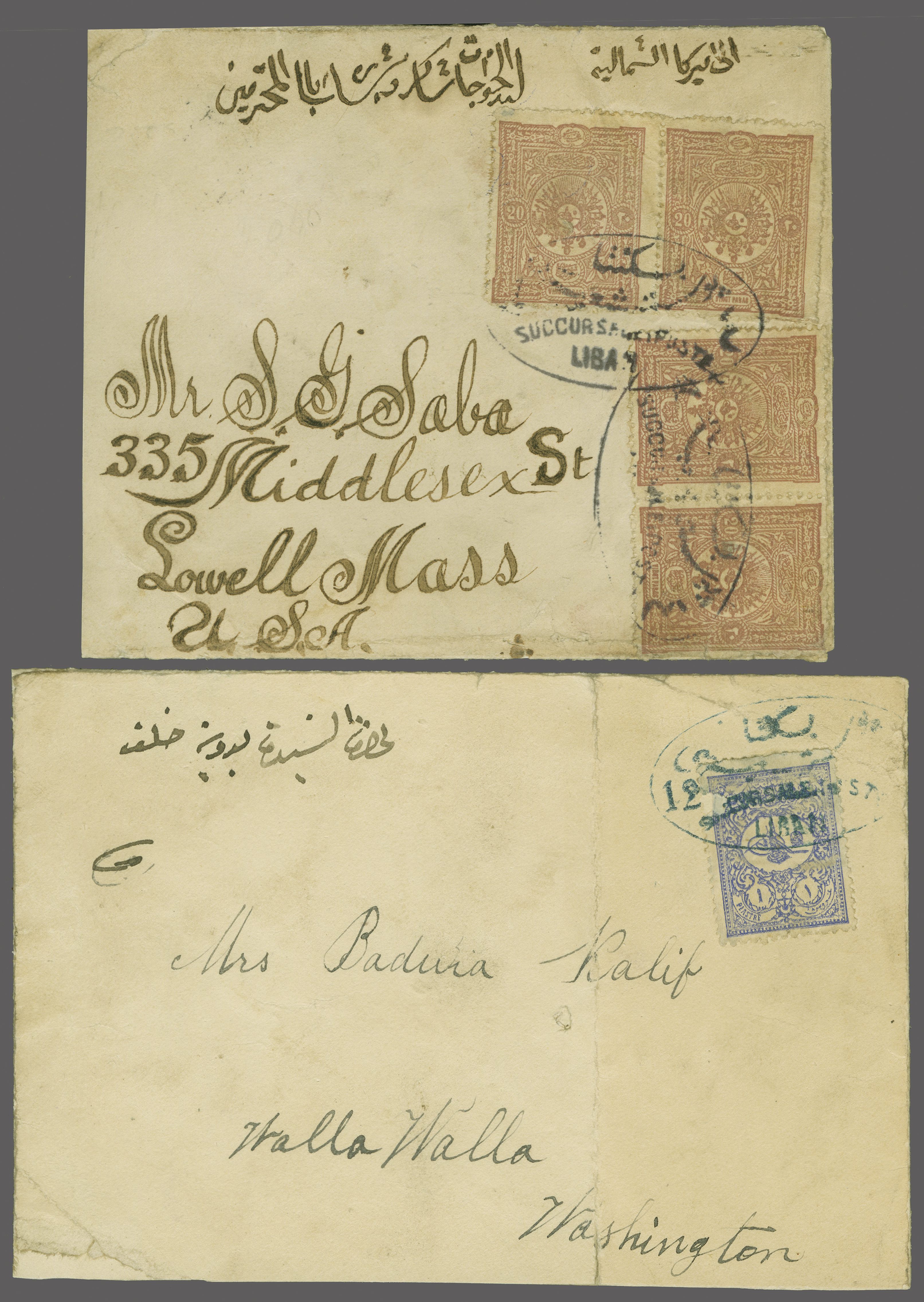 Sanjak of Djebel Lubnan - Beskinta / Beskenta 1900/1903: Covers (2), earlier 1900 cover franked by 1892 20 pa. claret (4) for double rate to Lowell, Mass., USA tied by framed oval bilingual "BESKINTA SUCCURSALE POSTE LIBAN No.