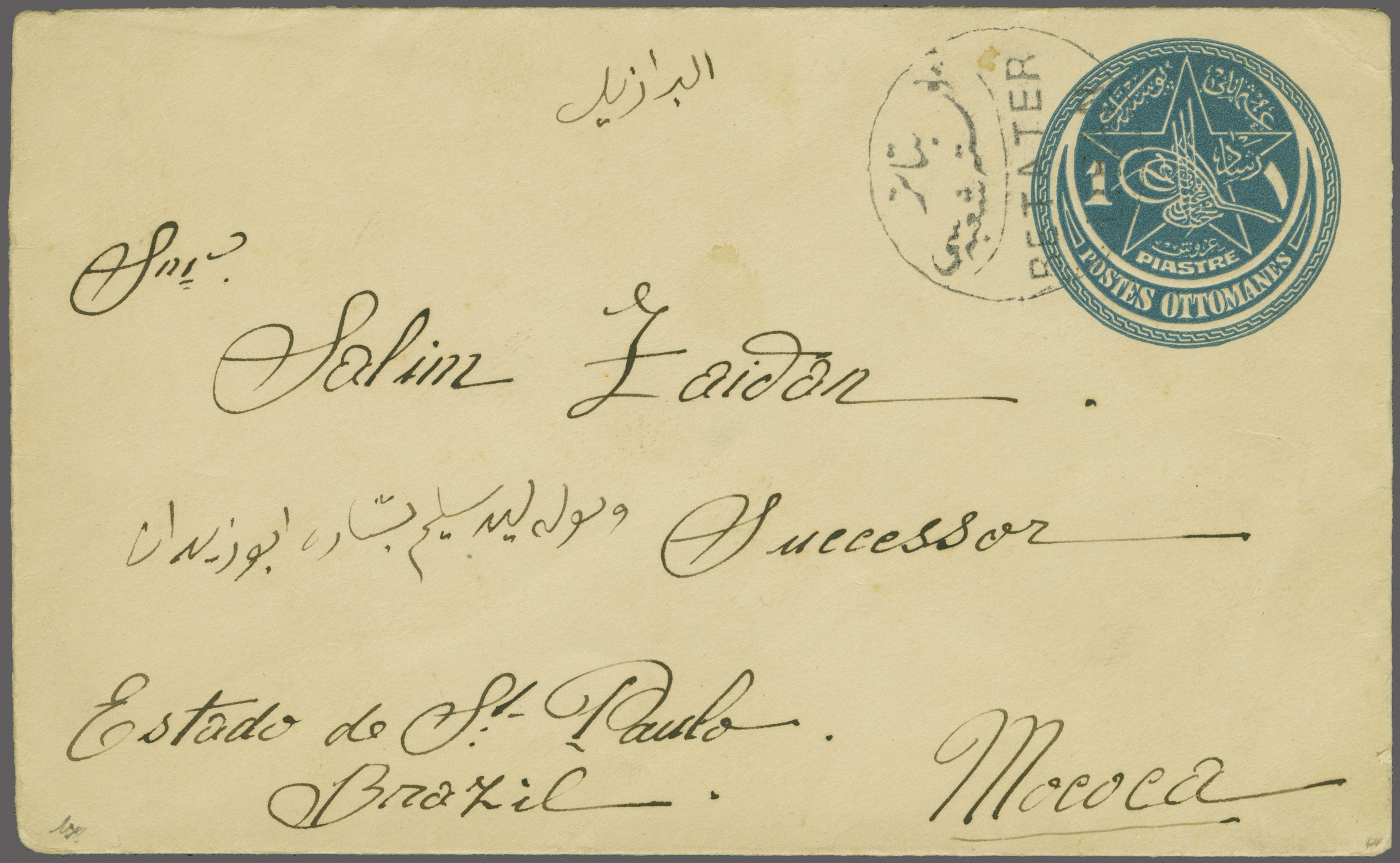 Sanjak of Djebel Lubnan - Betater / Btatir 1914: 1 pi. bluepostal stationery envelope used from Betater to Brazil cancelled by circular bilingual "BETATER" handstamp (uper half reads "Betater Post Shubesi") in black (Coles