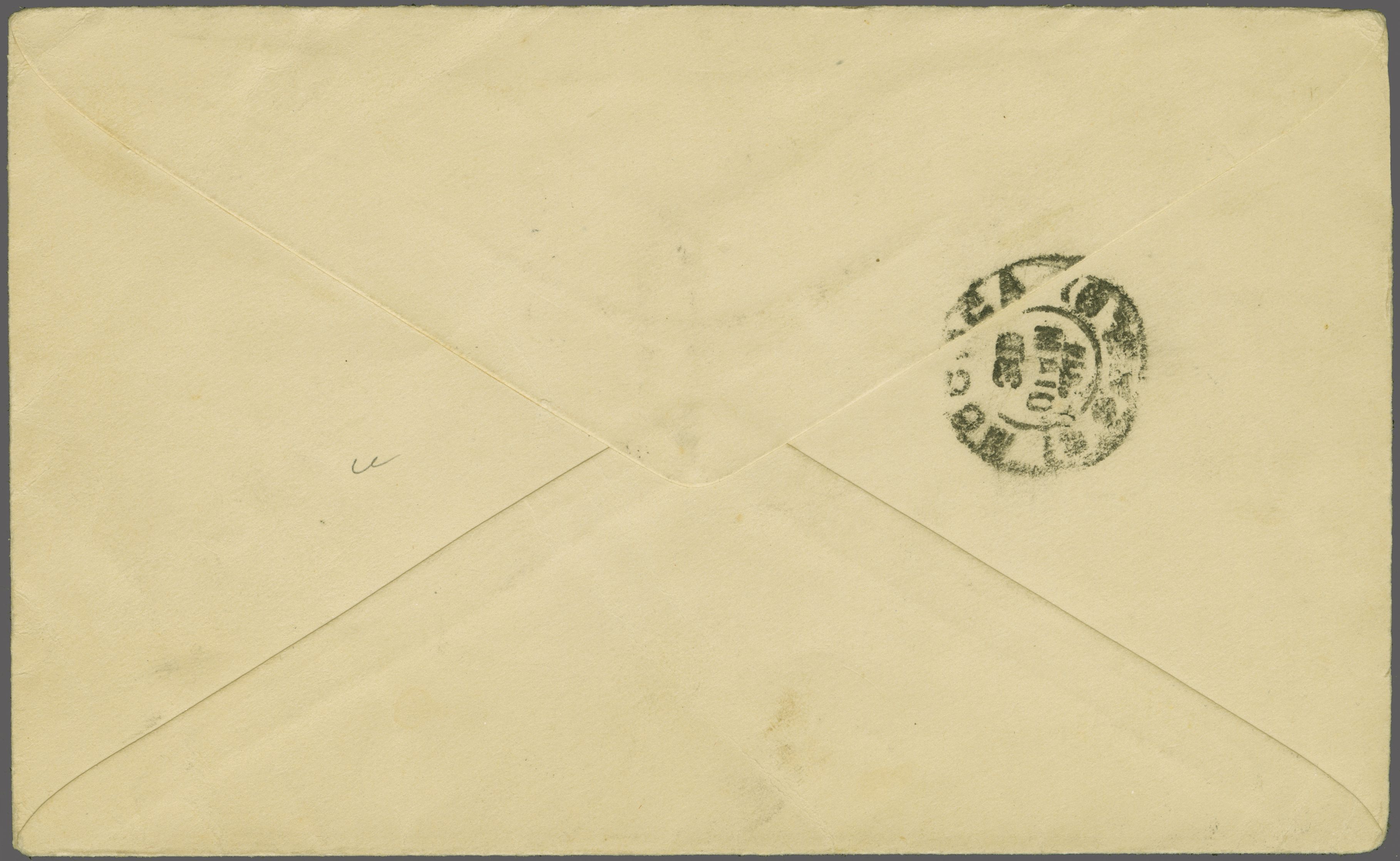 Branch 1893) in black (Coles & Walker fig. 75, Ziya fig. 1 - rated 'RRR'), superbly struck in black. Berlin arrival on reverse (Sept 1). Slight trim to envelope but a rare cover; sold together with a 1909 cover with 1908 1 pi. blue tied by