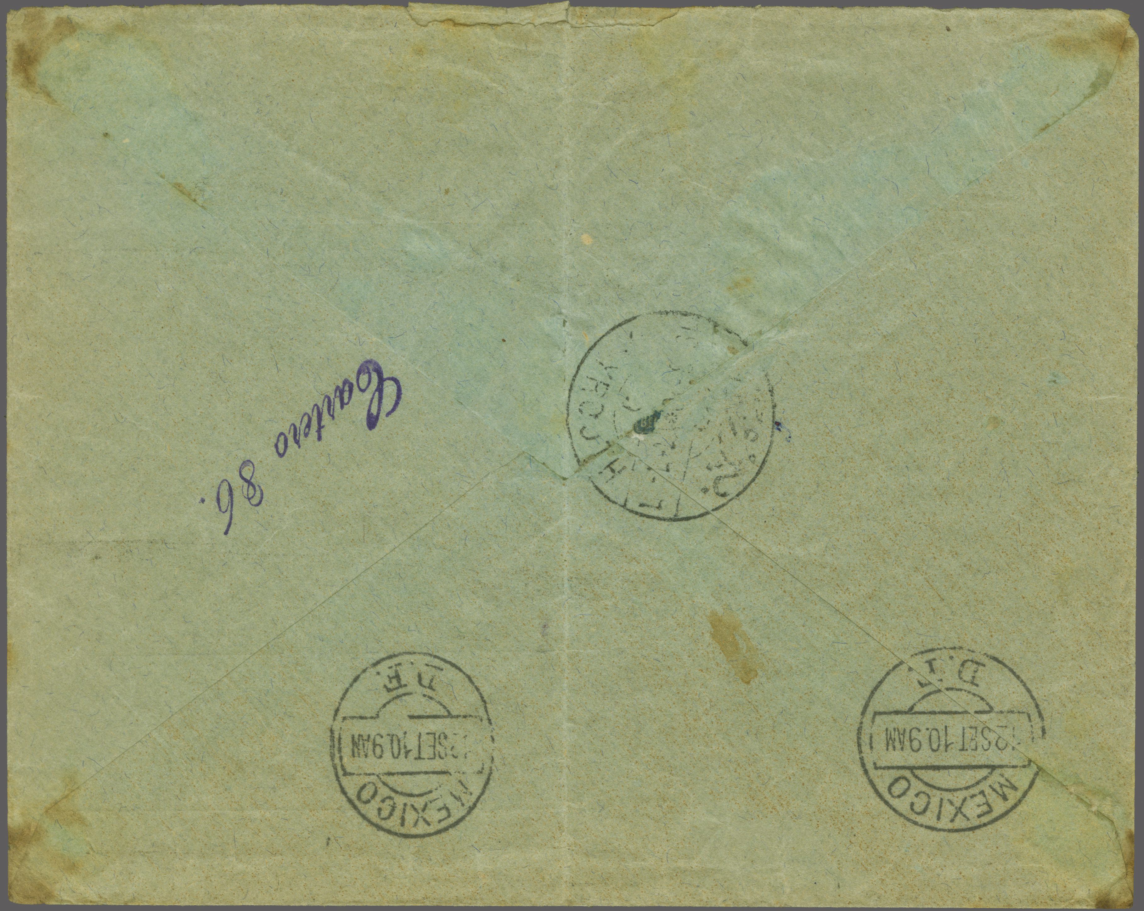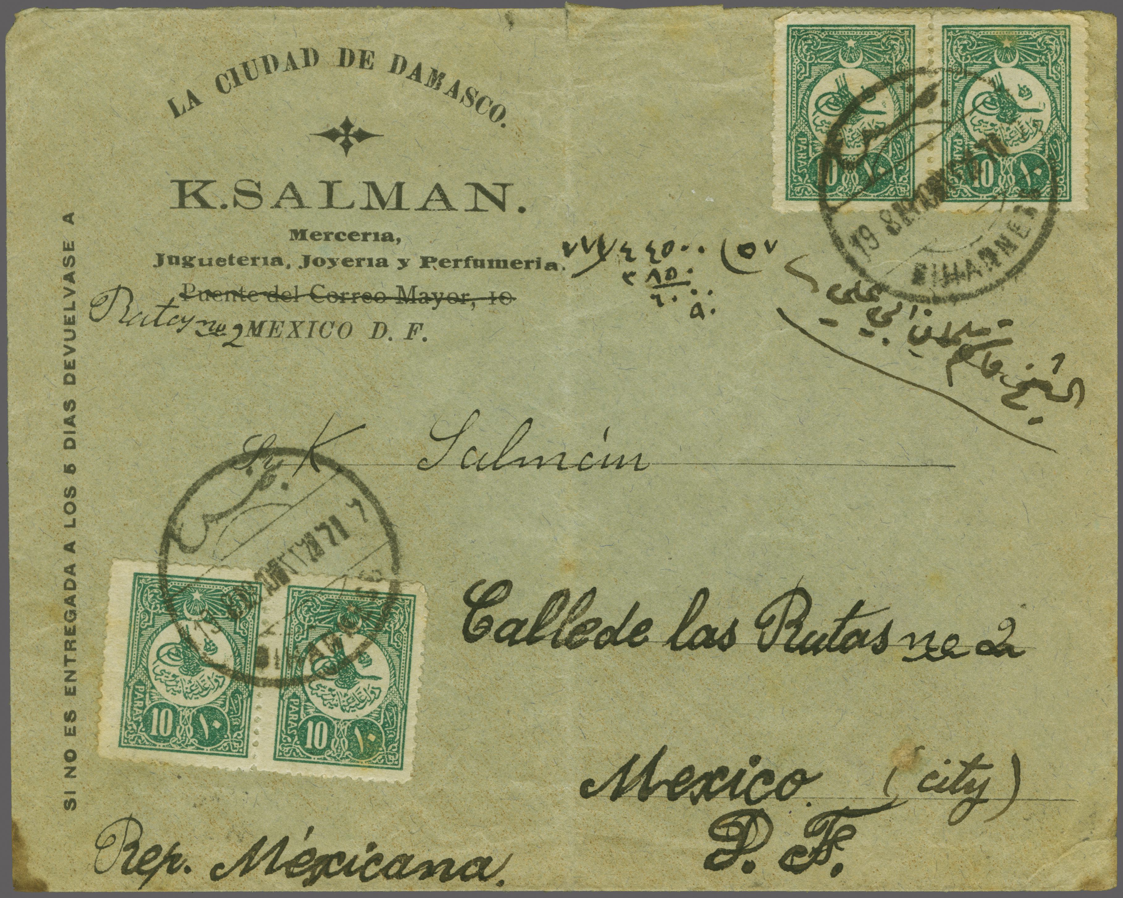 & Walker fig. 73, Ziya fig.1 - 'RR'). Reverse with Beyrouth transit cds and Mexico City (Sept 12) arrival. Central file fold away from the adhesives, a fine and scarce cover. Note: This cover is illustrated in Ziya catalogue 'B' on page 72.