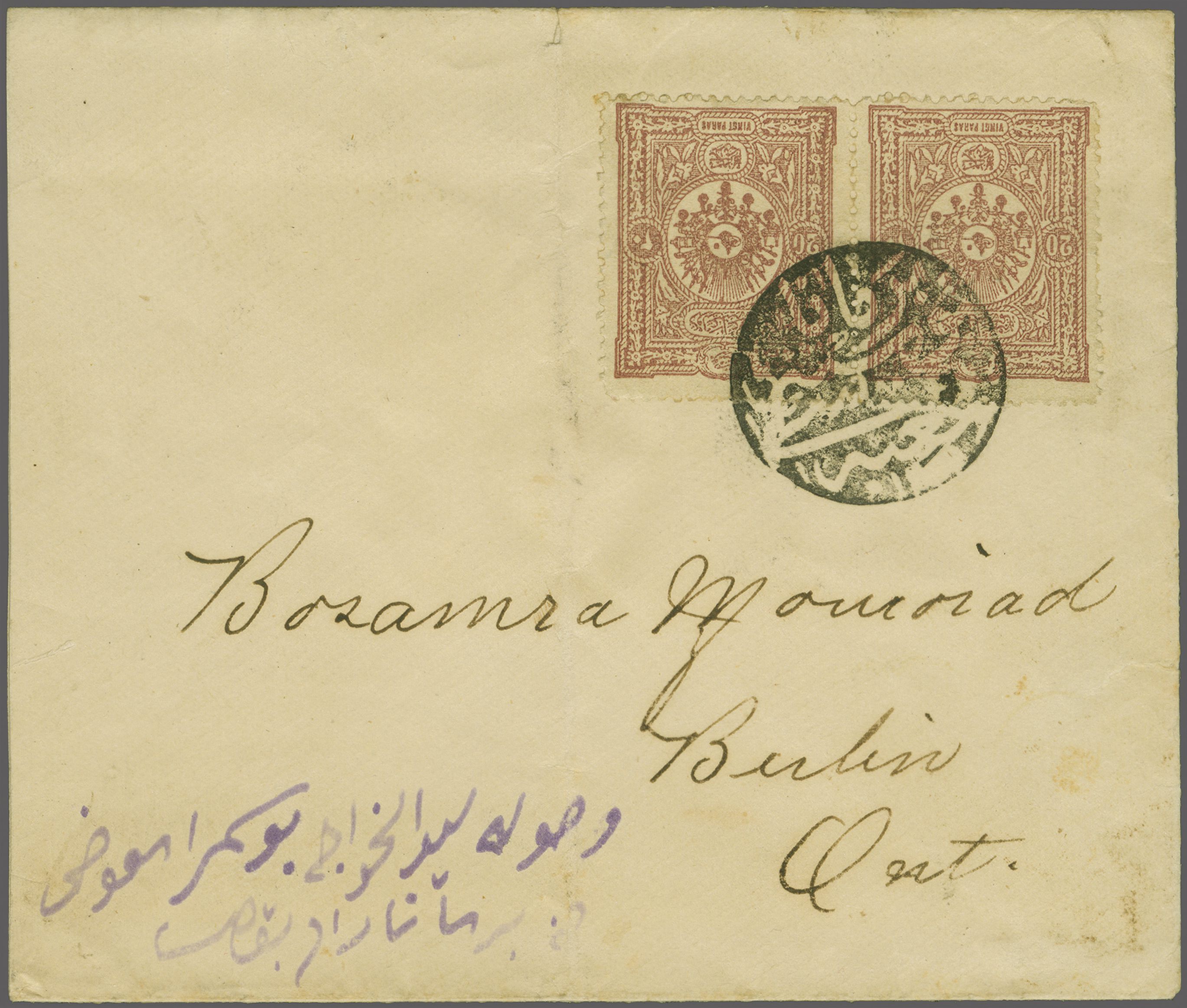 Sanjak of Djebel Lubnan - Broumana / Brumana 1892: Turkey 20 pa. claret horizontal pair used on 1899 cover to Berlin, Ontario, Canada tied by circular "BROUMANA POSTA SHUBESI - 1309" negative seal handstamp (Broumana Postal