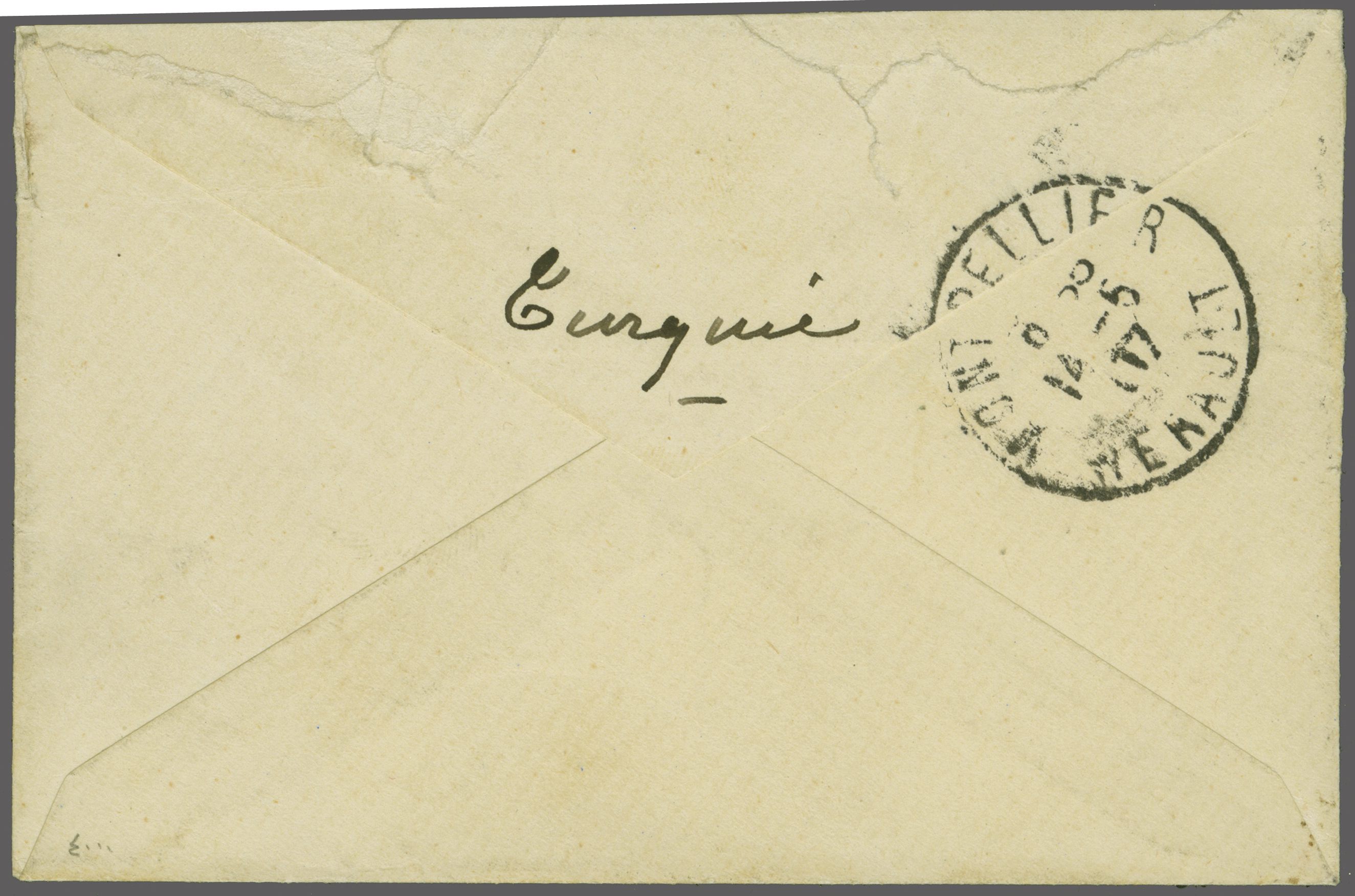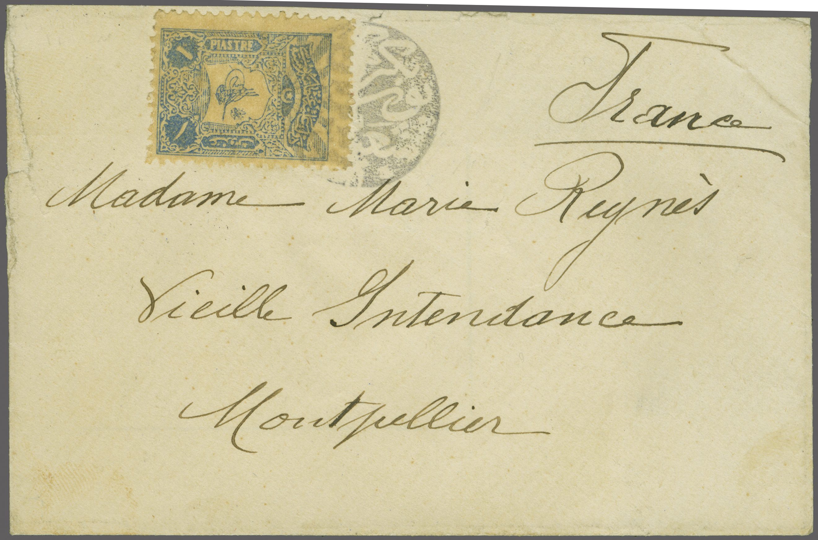 well struck in black (Coles & Walker unlisted, Ziya unlisted). Reverse with Montpellier (May 14) arrival cds. Tiny restoration to tears at left of envelope. Unique. Note: Bkerké is / was the winter residence of the Maronite Patriarch (Image 1)