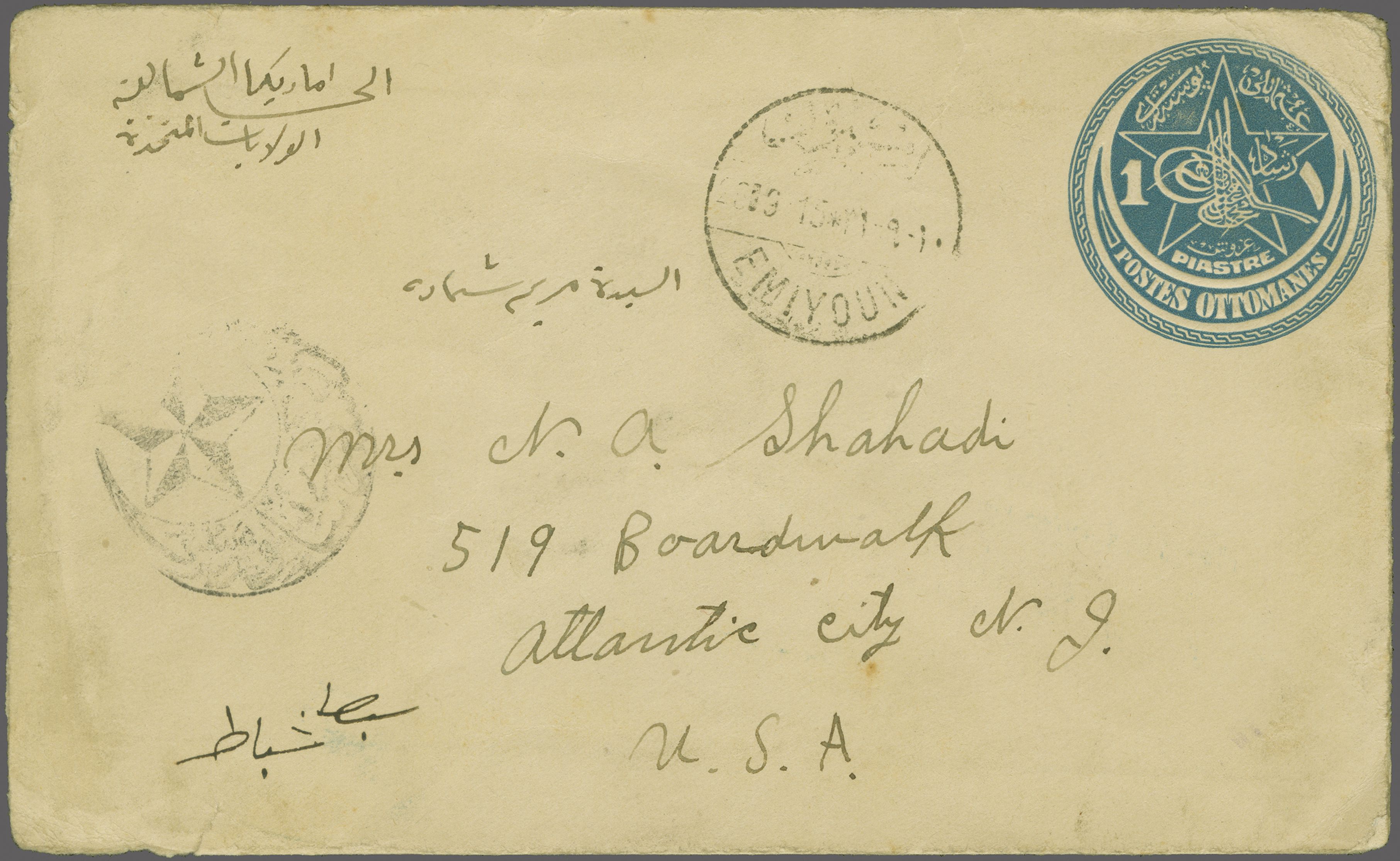 Sanjak of Djebel Lubnan - Emiyoun / Emiyun 1915: 1 pi. blue postal stationery envelope used to Atlantic City, USA cancelled by small circular "EMIYOUN" bilingual datestamp (Sept 20) in black (Coles & Walker fig. 146, Ziya