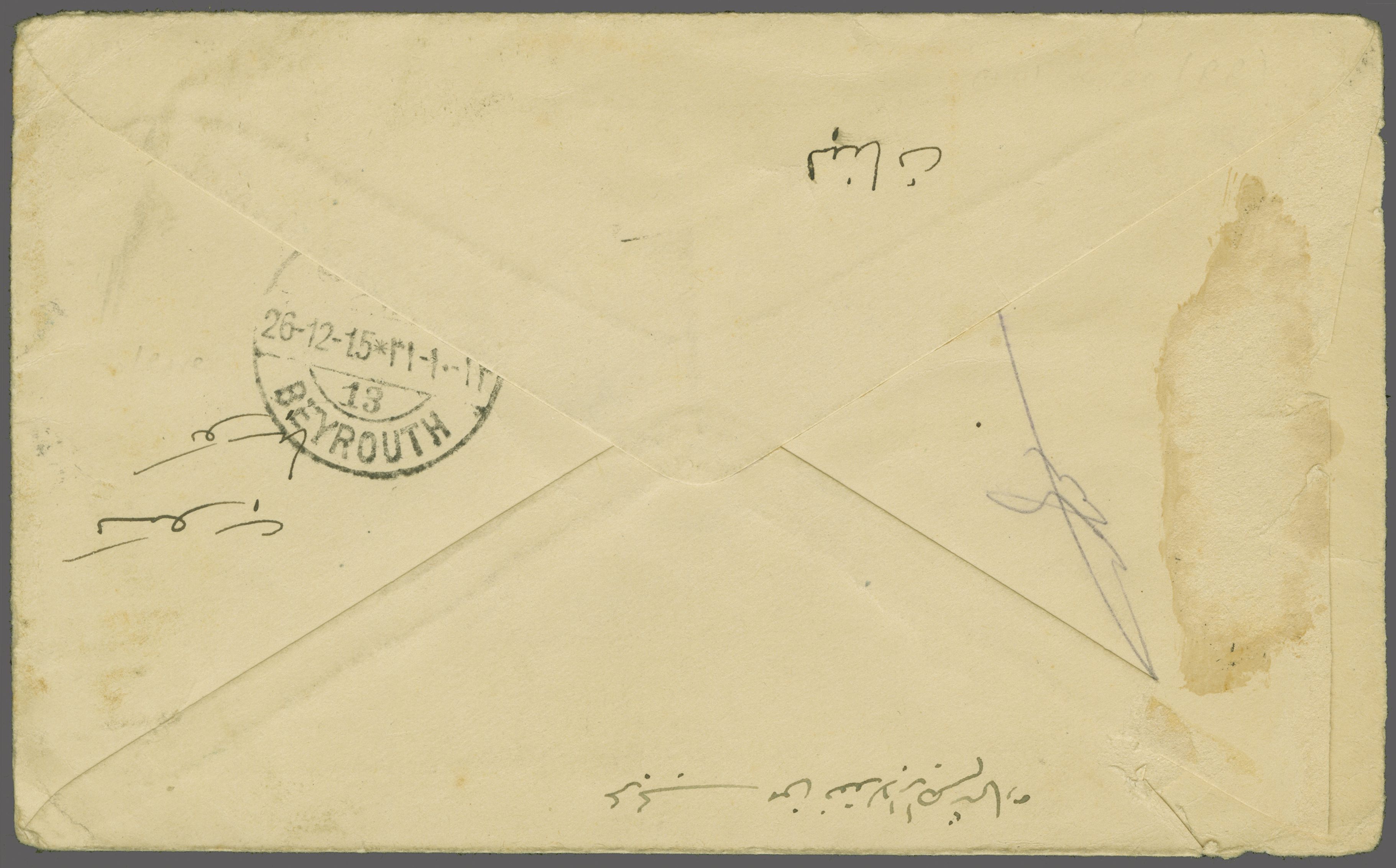 reading "MASASIR-ECHOUF 2") well struck in black (Coles & Walker unlisted, Ziya fig. 3 - rated 'RRR'). Star and Crescent Beirut Censor at right with reverse showing "Beittedine" (Feb 5) cds and Beirut transit cds's. File fold away from the