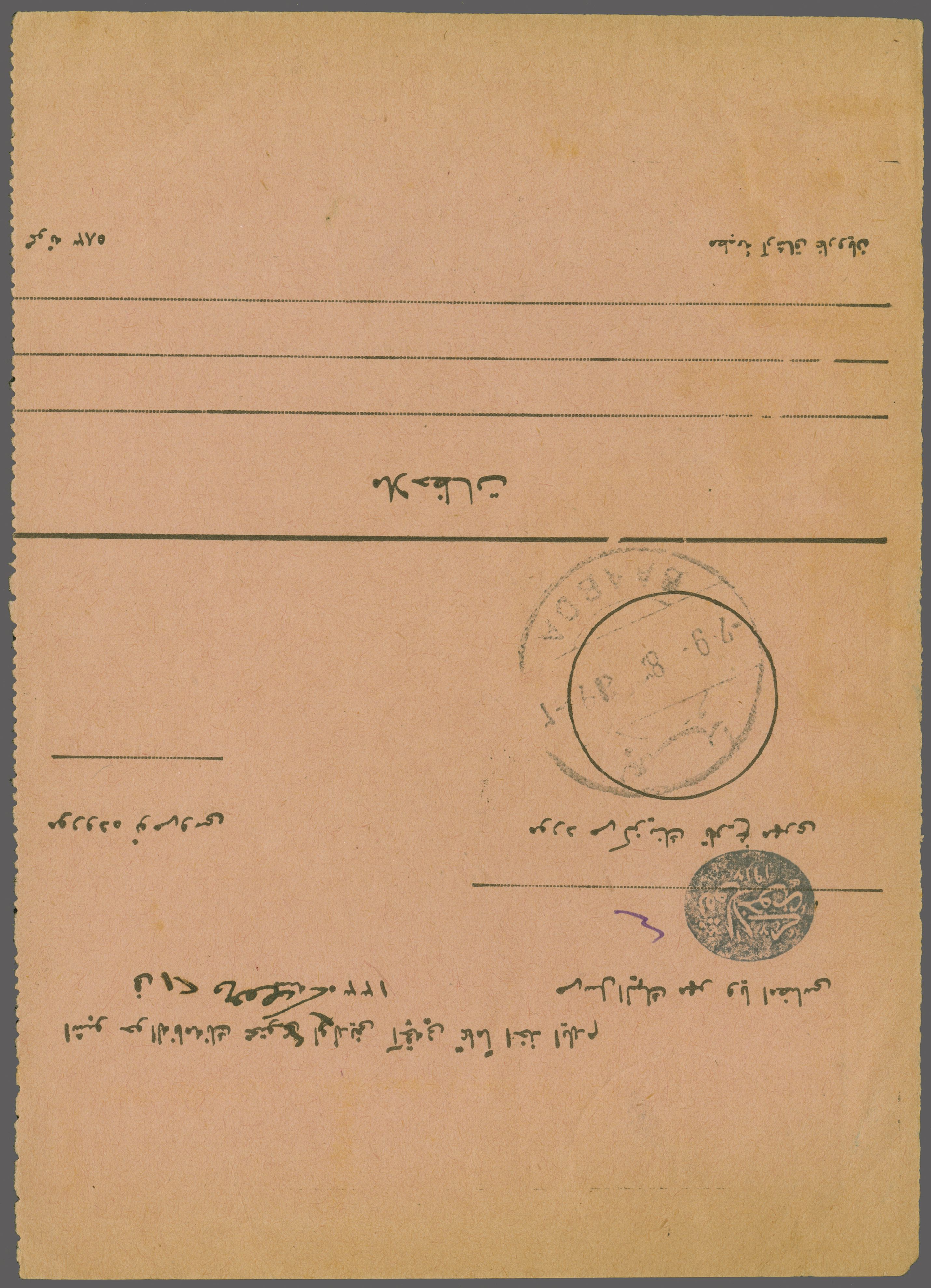 the cover was used in 1899 - therefore the manufacturer of the handstamp was using the Muslim Lunar Calendar in which the year 1316 covers the period May 22, 1898 until May 11, 1899. Note 2: This cover is illustrated in the Ziya catalogue 'E - G' on
