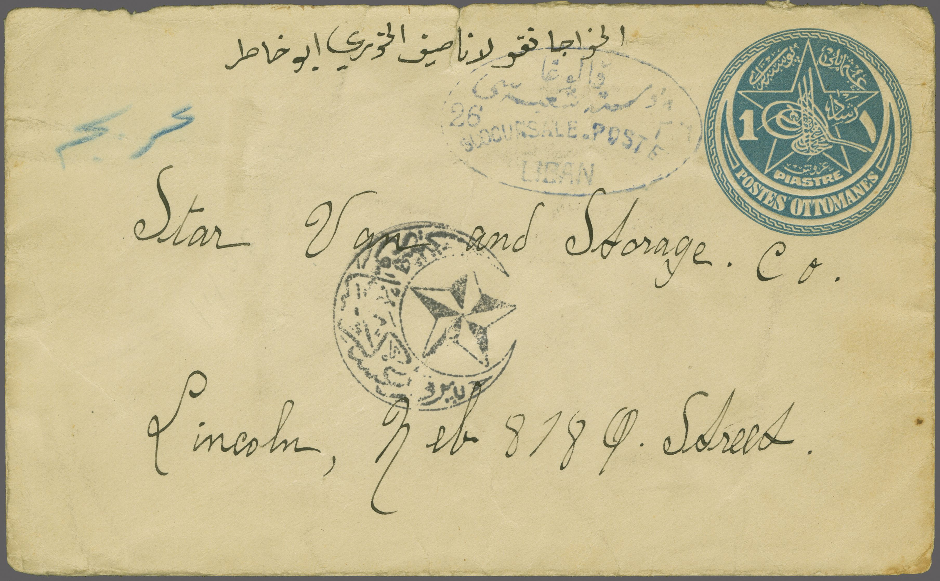 Sanjak of Djebel Lubnan - Falougha / Faluga 1915: 1 pi. blue postal stationery envelope used from Falougha to Lincoln, Nebraska, USA cancelled by fine oval framed "FALOUGHA SUCCURSALE POSTE LIBAN 26" bilingual handstamp