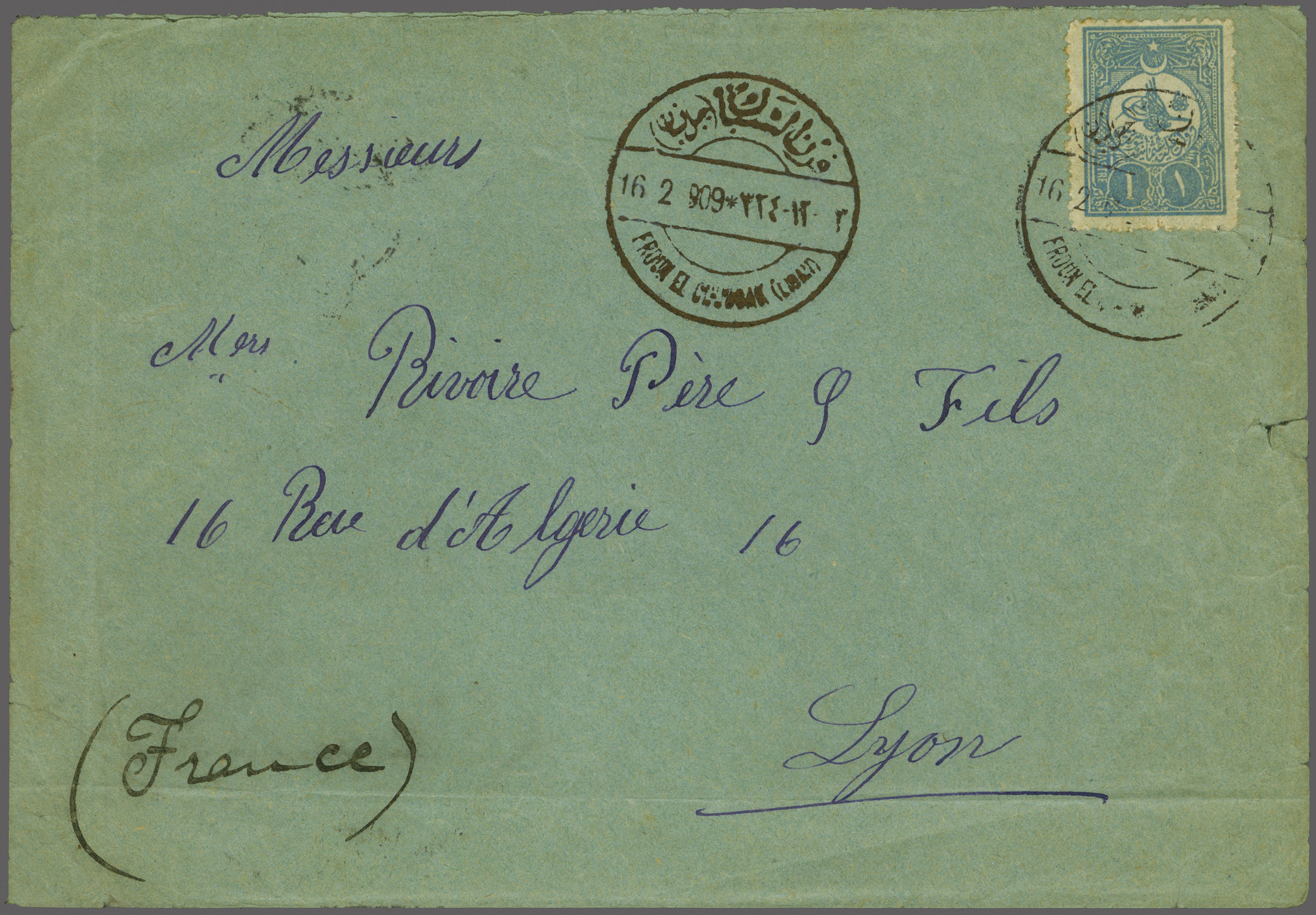 Sanjak of Djebel Lubnan - Furn el Chebbak / Fern Eşşebak 1908: Turkey 1 pi. blue used on 1909 cover to Lyon, France tied by bilingual circular "FROUN EL CHUBBAK (LIBAN)" datestamp in black (Feb 16) with information strike