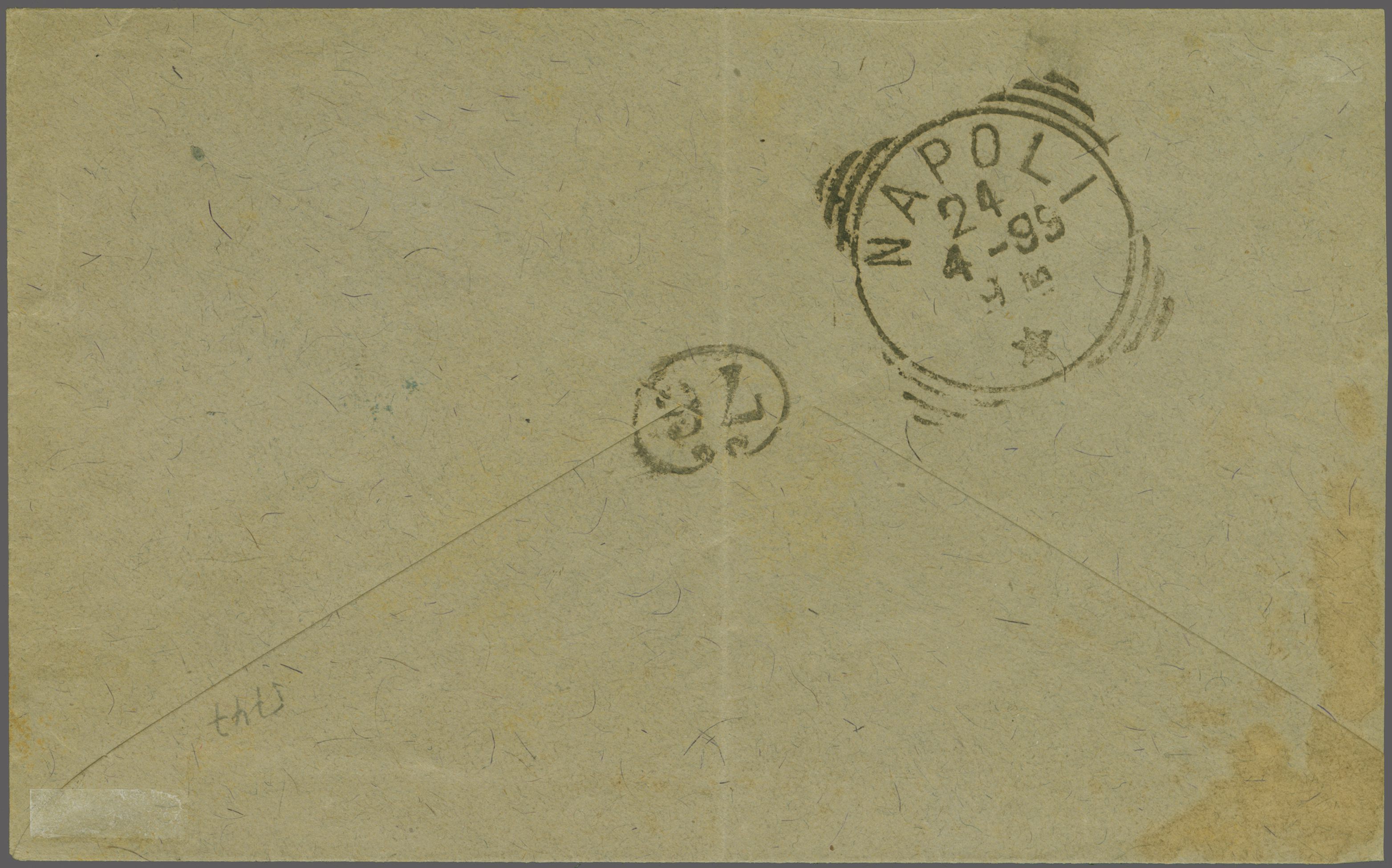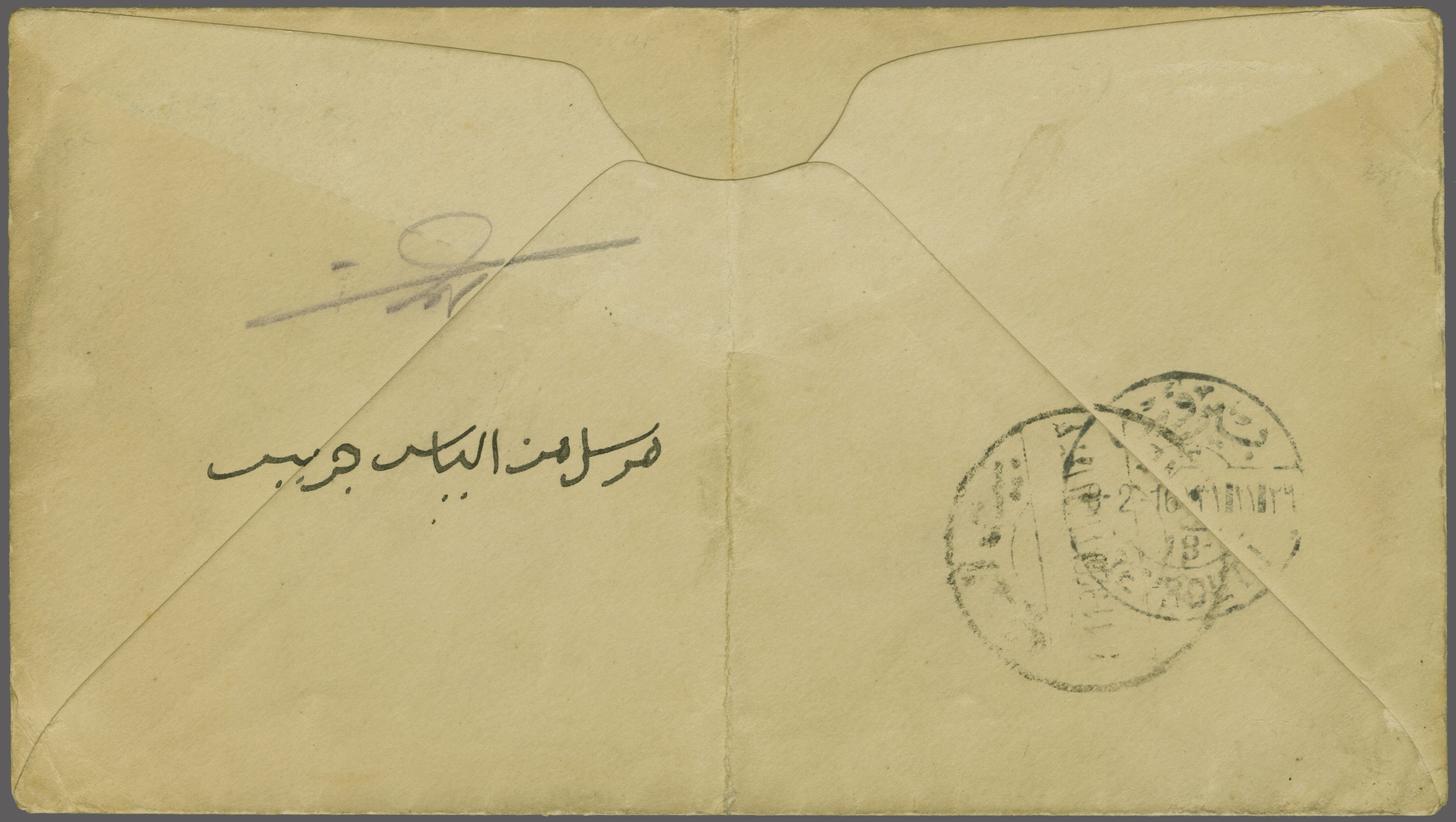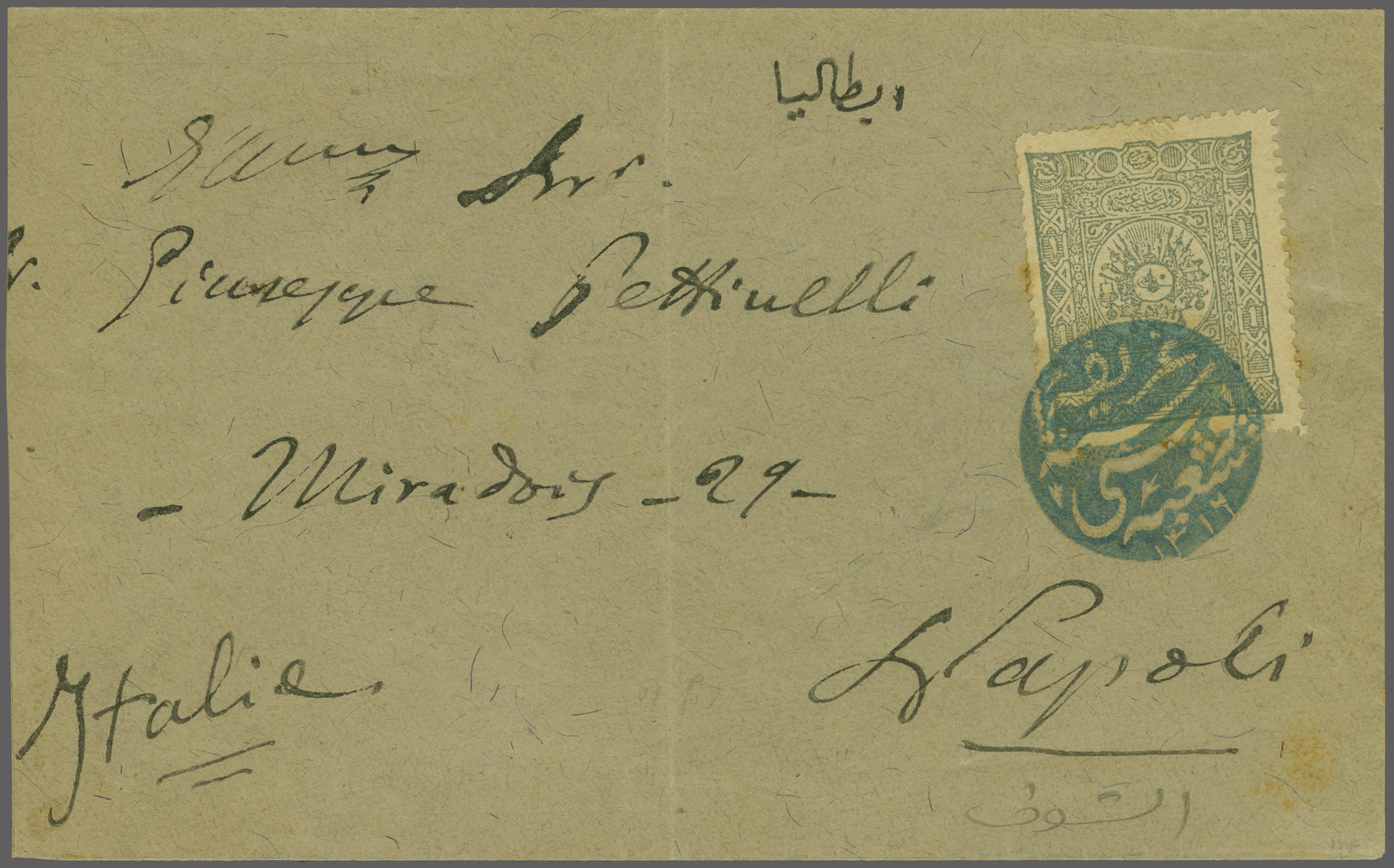 struck in blue (Coles & Walker unlisted, Ziya fig. 1 - rated 'RRR*'). Naples arrival on reverse (April 24). Slight trim to envelope at left, a splendid cover. Unique. Note 1: The Arabic date in the cancellation reads 1316 + 584 = 1900. However