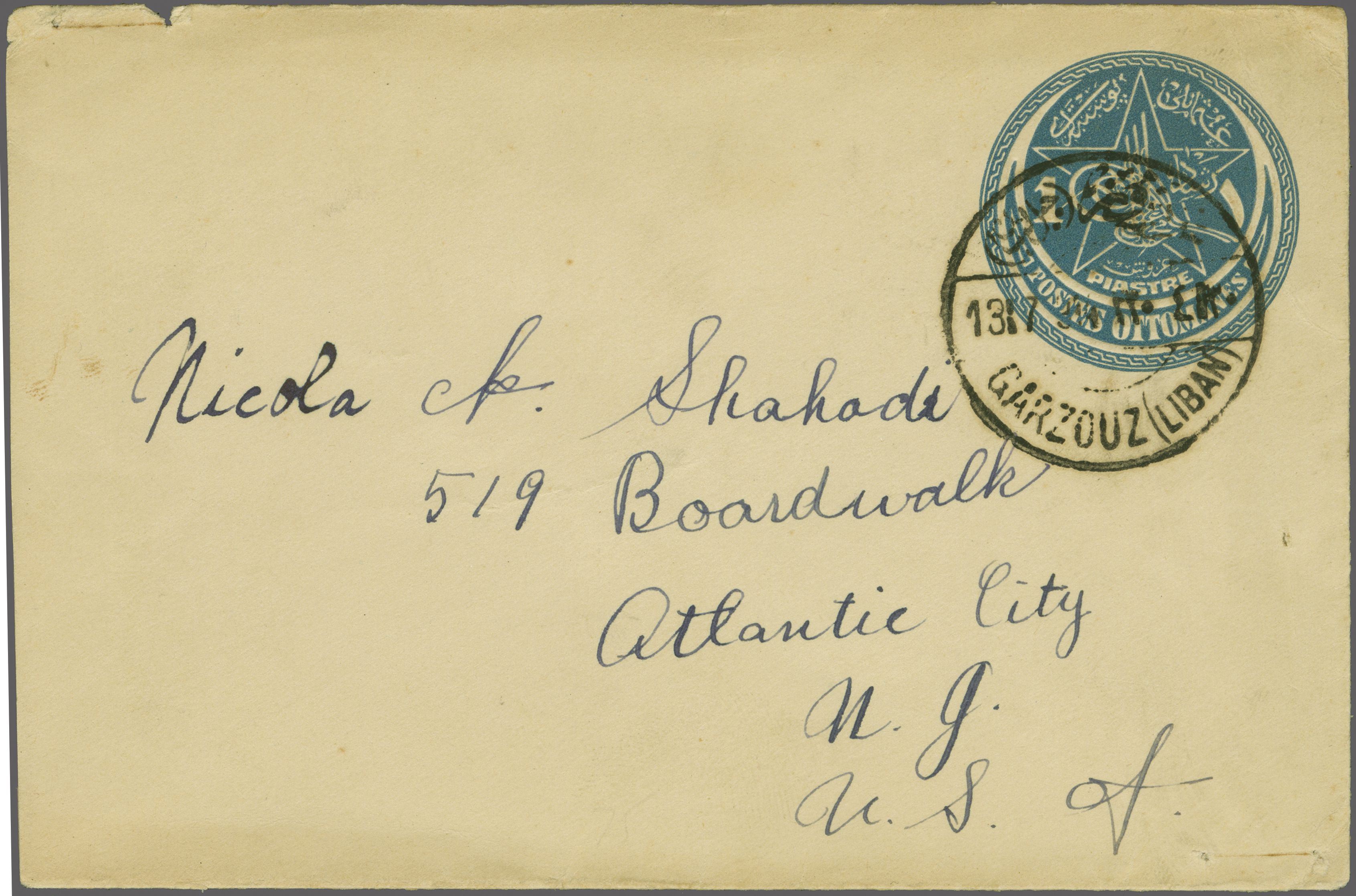 Sanjak of Djebel Lubnan - Garzouz / Garzûz 1914: 1 pi. blue postal stationery envelope used to Atlantic City, USA tied by bilingual circular "GARZOUZ (LIBAN)" datestamp (July 13) superbly struck in black (Coles & Walker