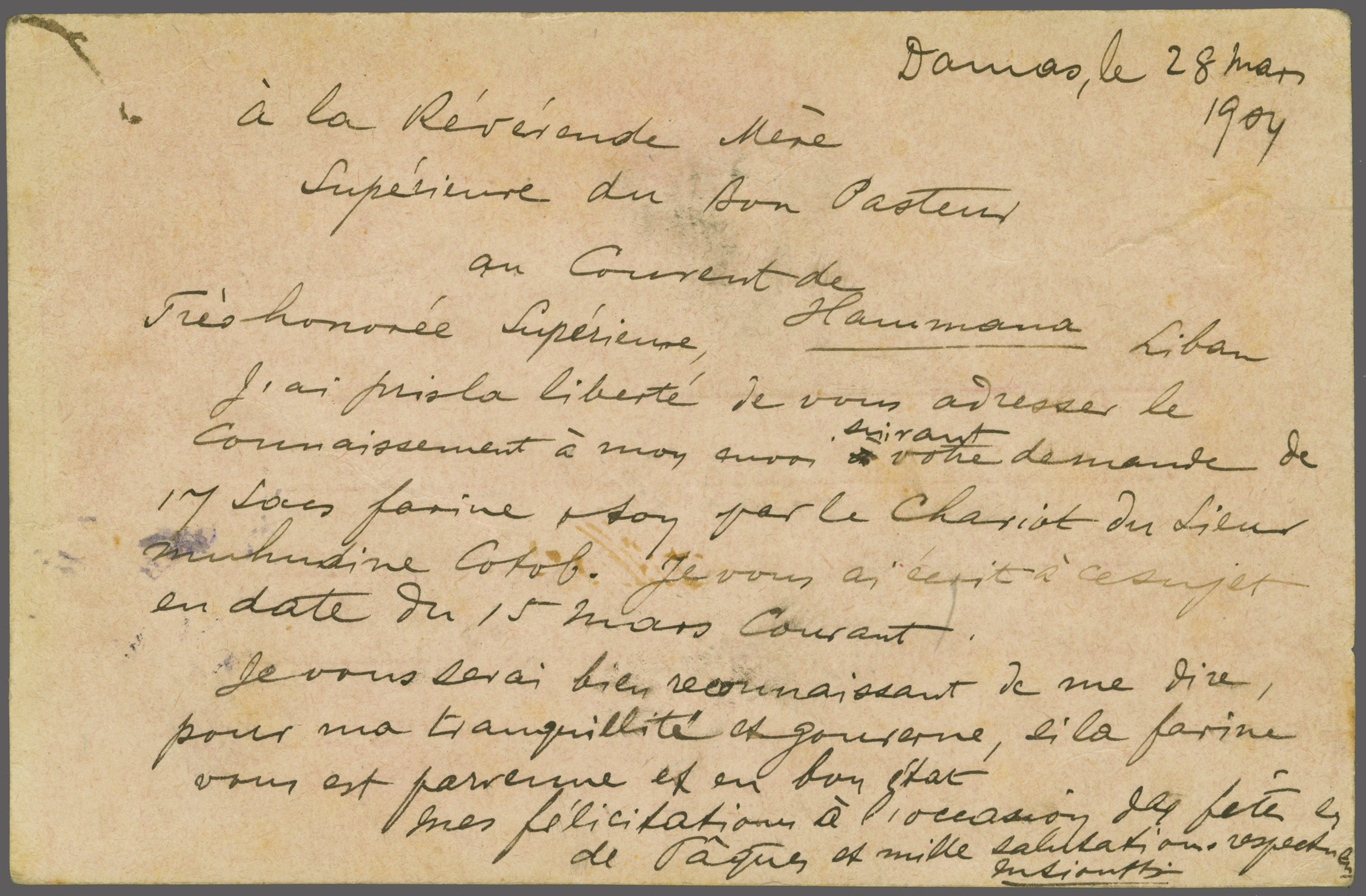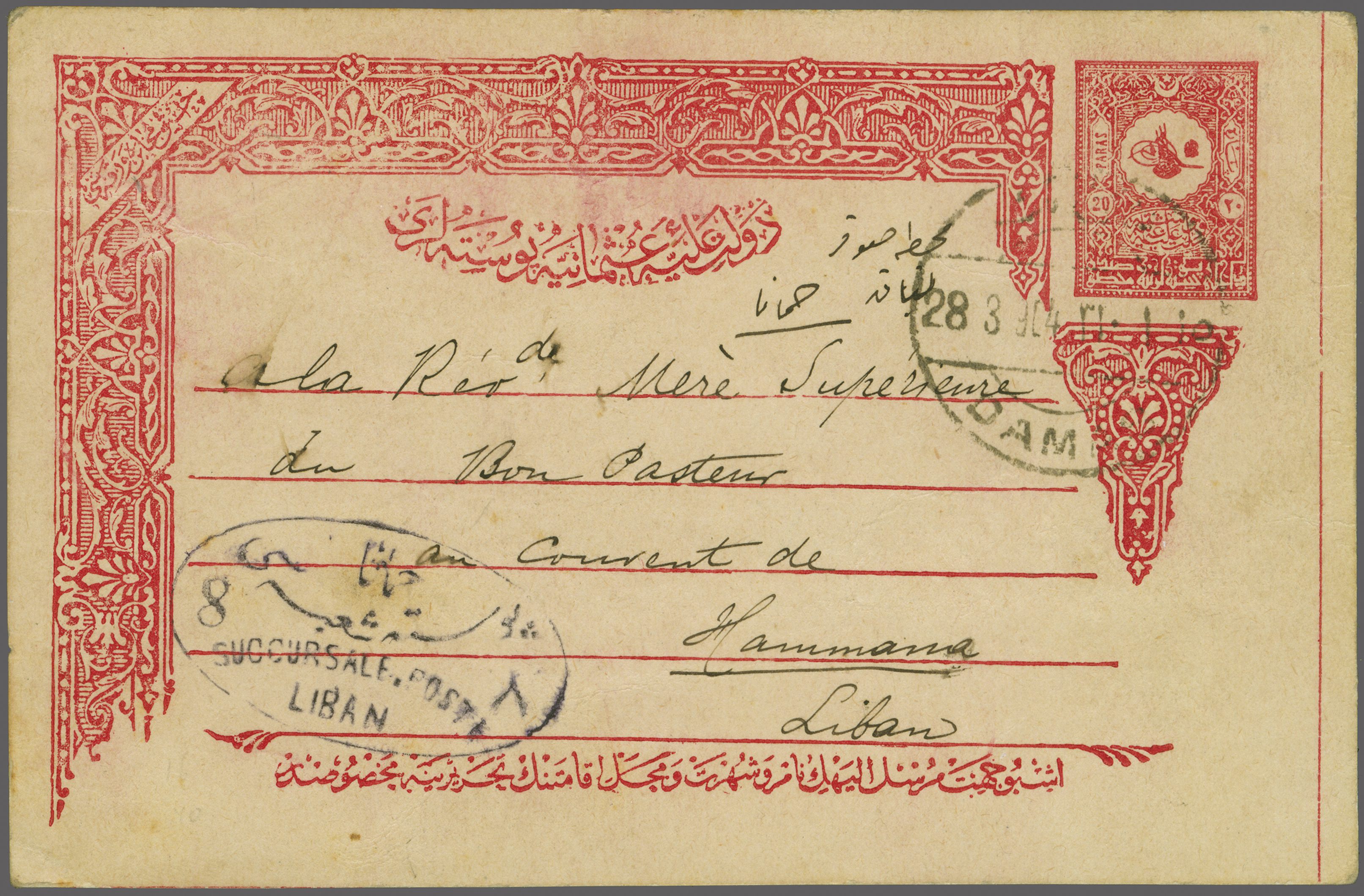 Sanjak of Djebel Lubnan - Hammana / Hamana 1901: 20 pa. red postal stationery card, a used example mailed 28 March 1904 from Damascus to Hammana, struck on arrival with oval framed bilingual "SUCCURSALE POSTE LIBAN 8" in