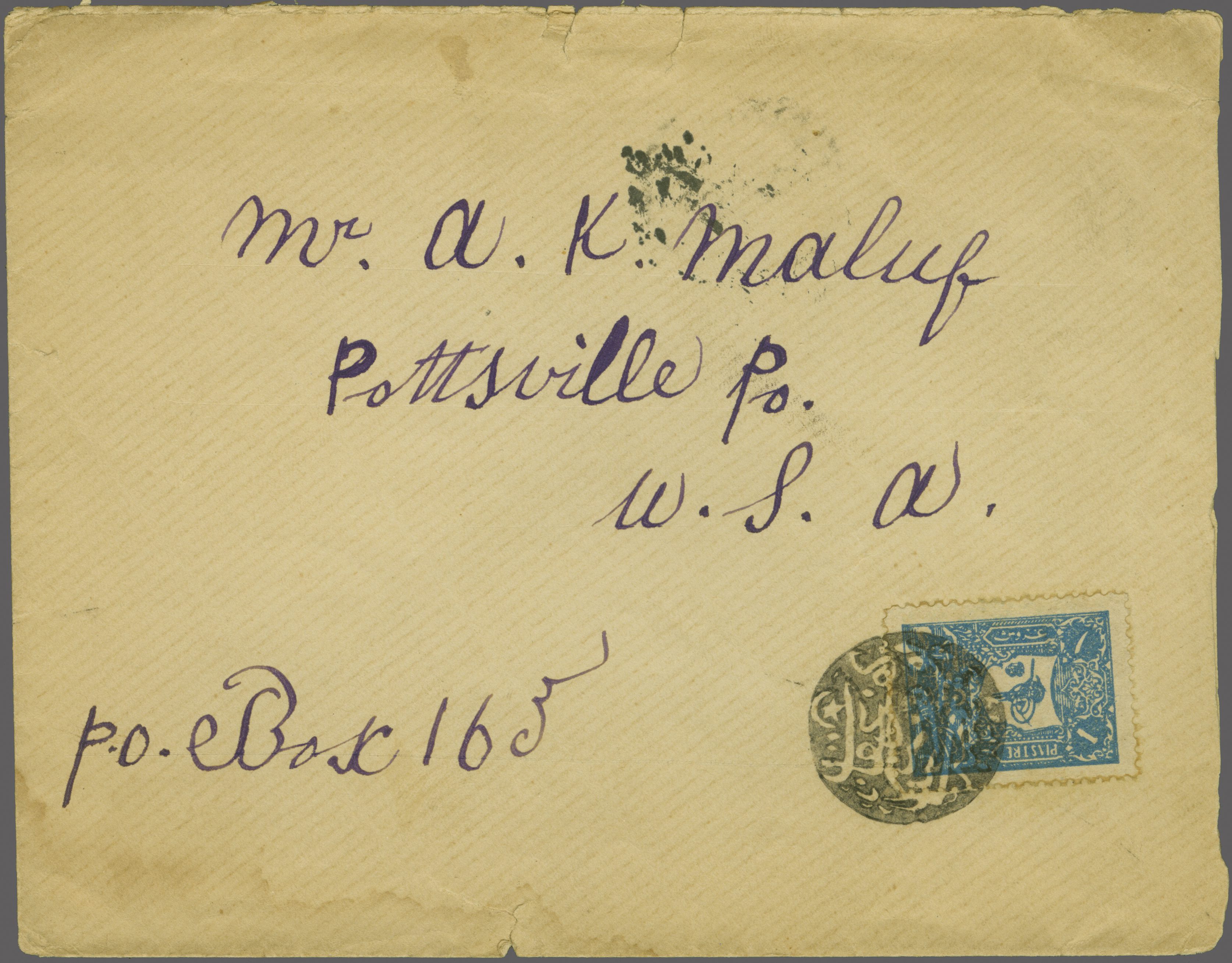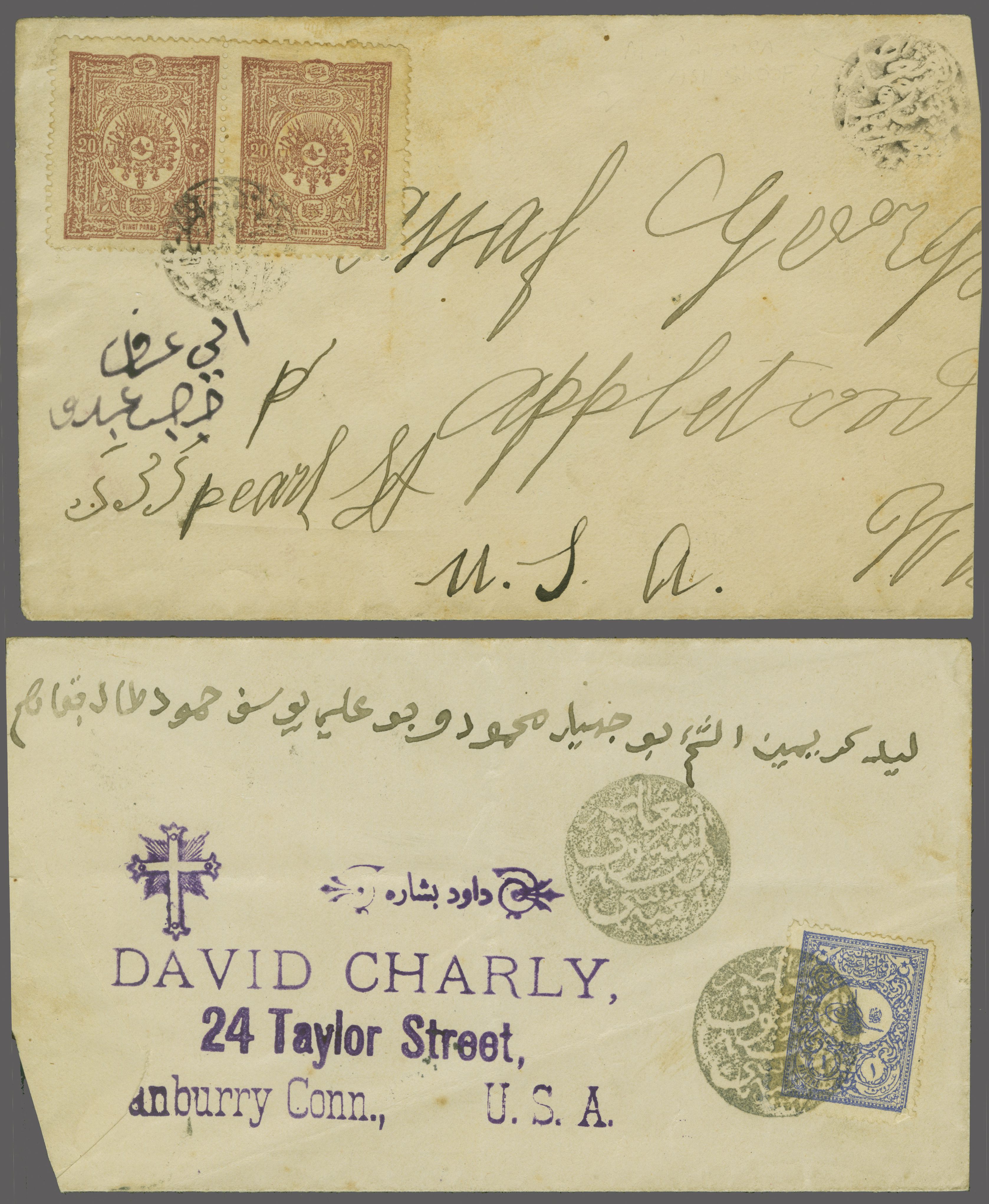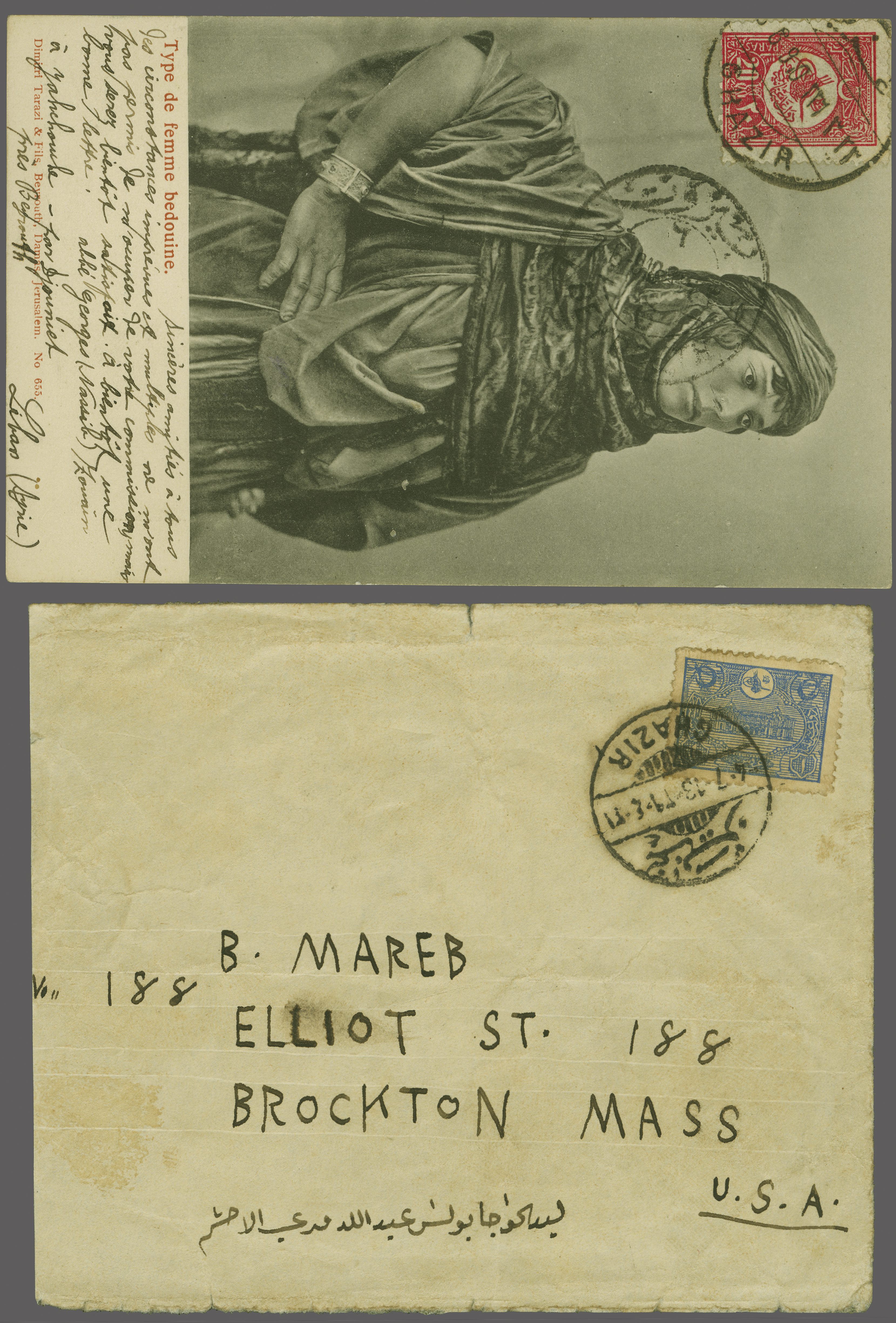 handstamp in black (Coles & Walker unlisted, Ziya fig. 1 - rated 'RRR'), with Appleton arrival cds (June 25) on reverse; twinned with 1902 cover to USA franked by 1901 1 pi. blue tied by superb larger "MA'ASSIR EL CHOUF POSTA SHUBESI" negative
