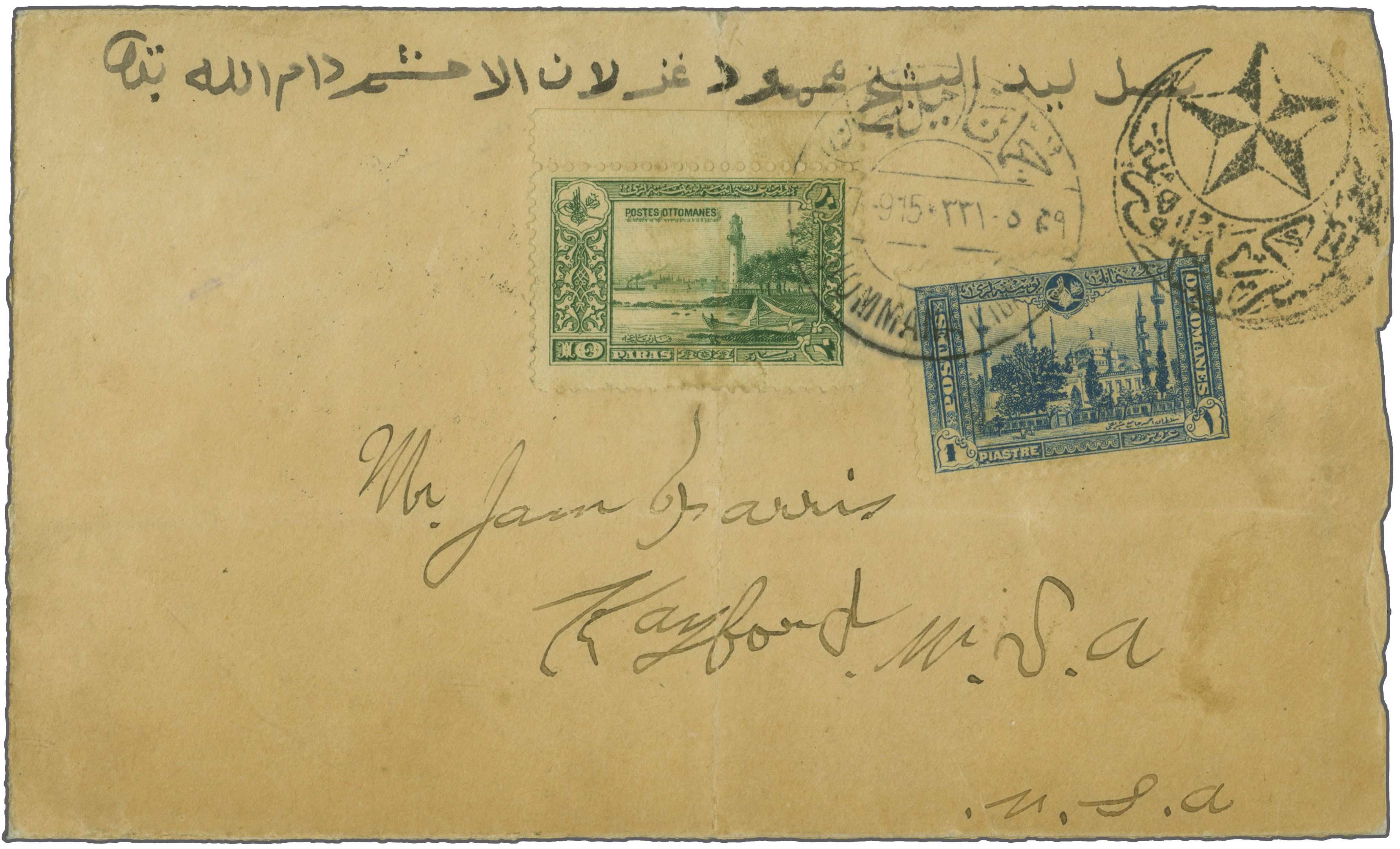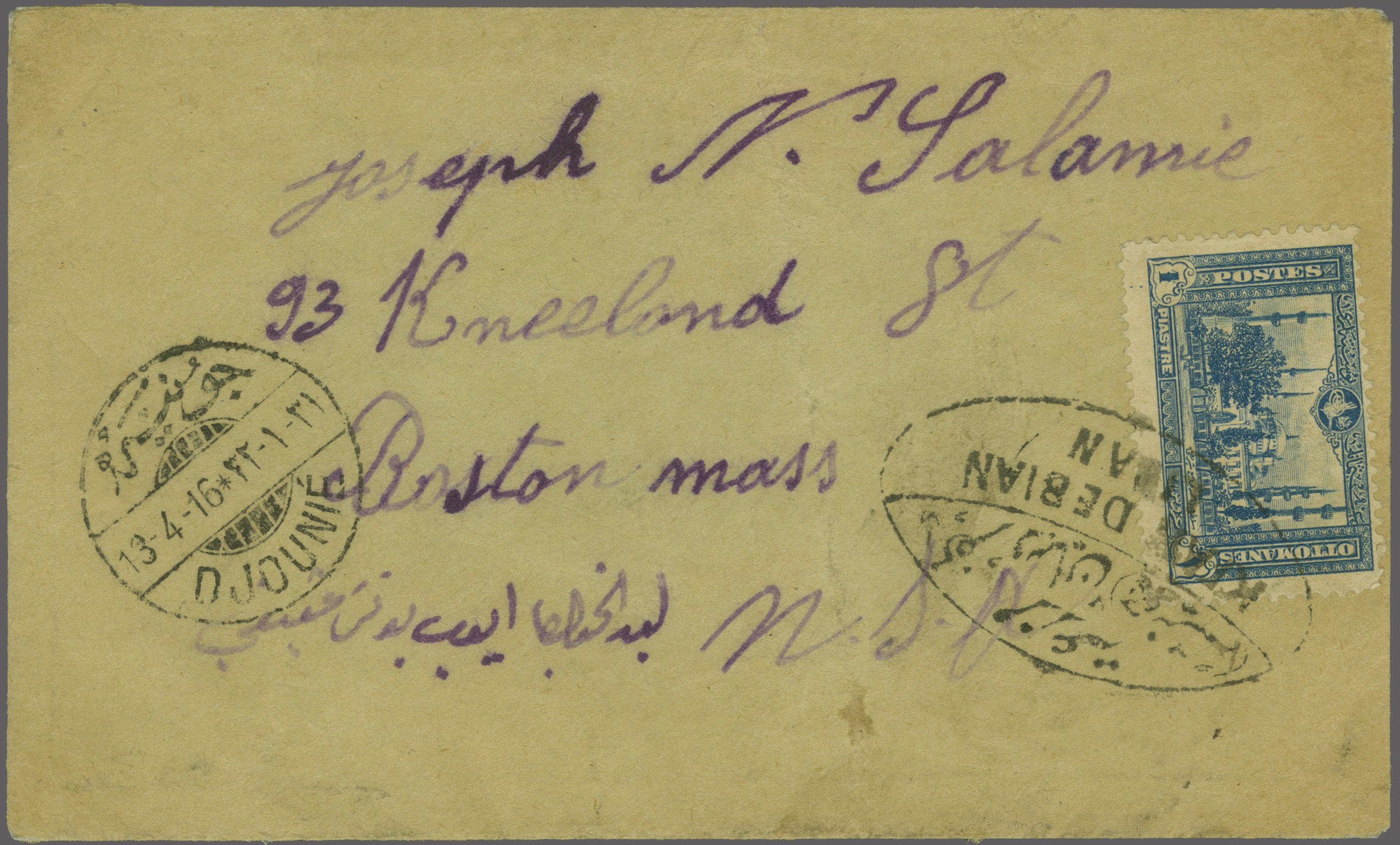 Sanjak of Djebel Lubnan - Mazraat Kfar Debian / Dibyân / Mezraat Kefr Debyan 1914: Turkey: 1 pi. deep blue, a single example used on 1916 cover to Boston, USA tied oval framed bilingual "MAZRAAT KFAR DEBIAN" handstamp in upper