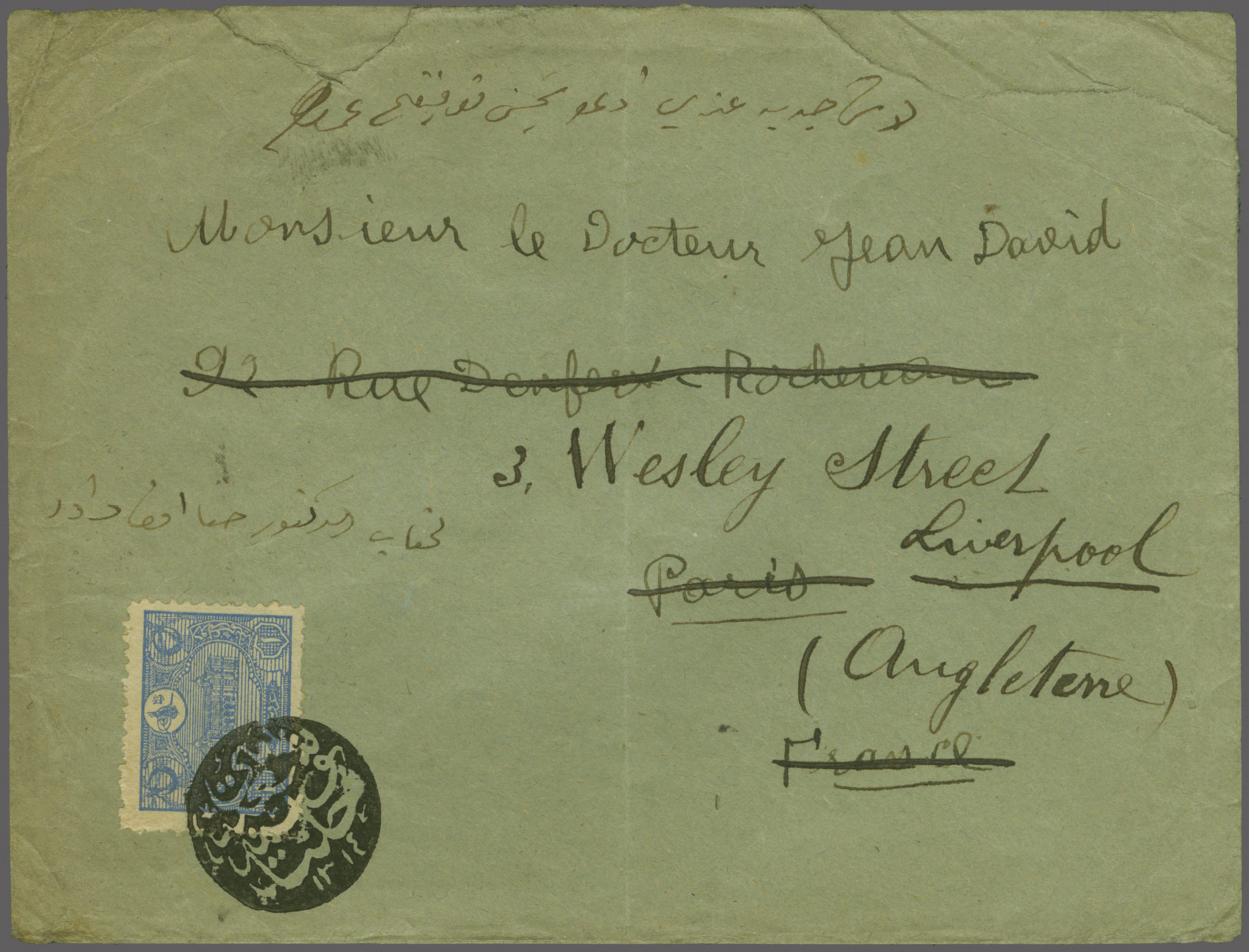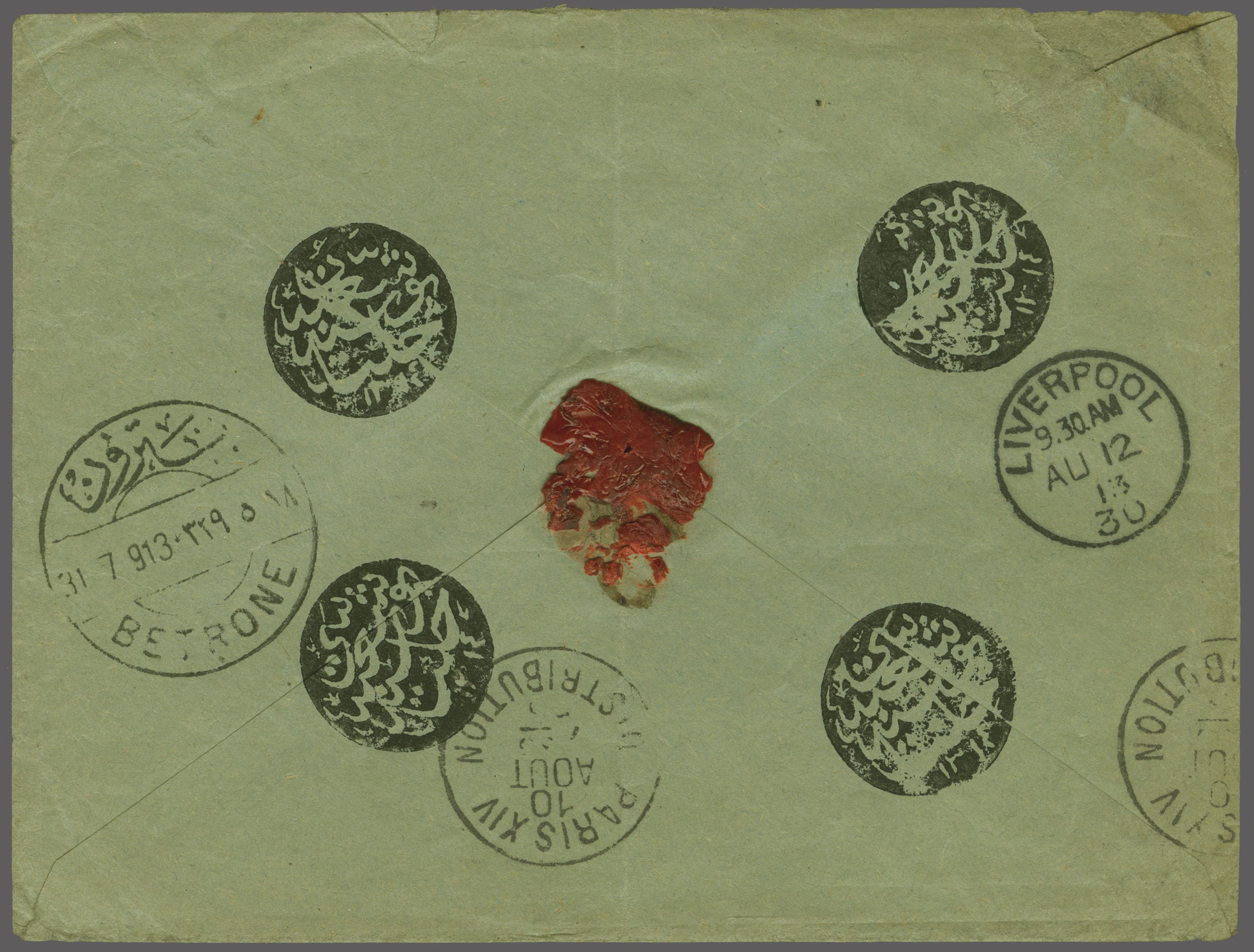 Sanjak of Djebel Lubnan - Halta 1913: Turkey 1 pi. ultramarine, a used example on 1913 cover to Paris, France and readdressed to Liverpool tied by circular "POSTA SHUBESI HALTA - 1314" negative seal handstamp (Halta Postal