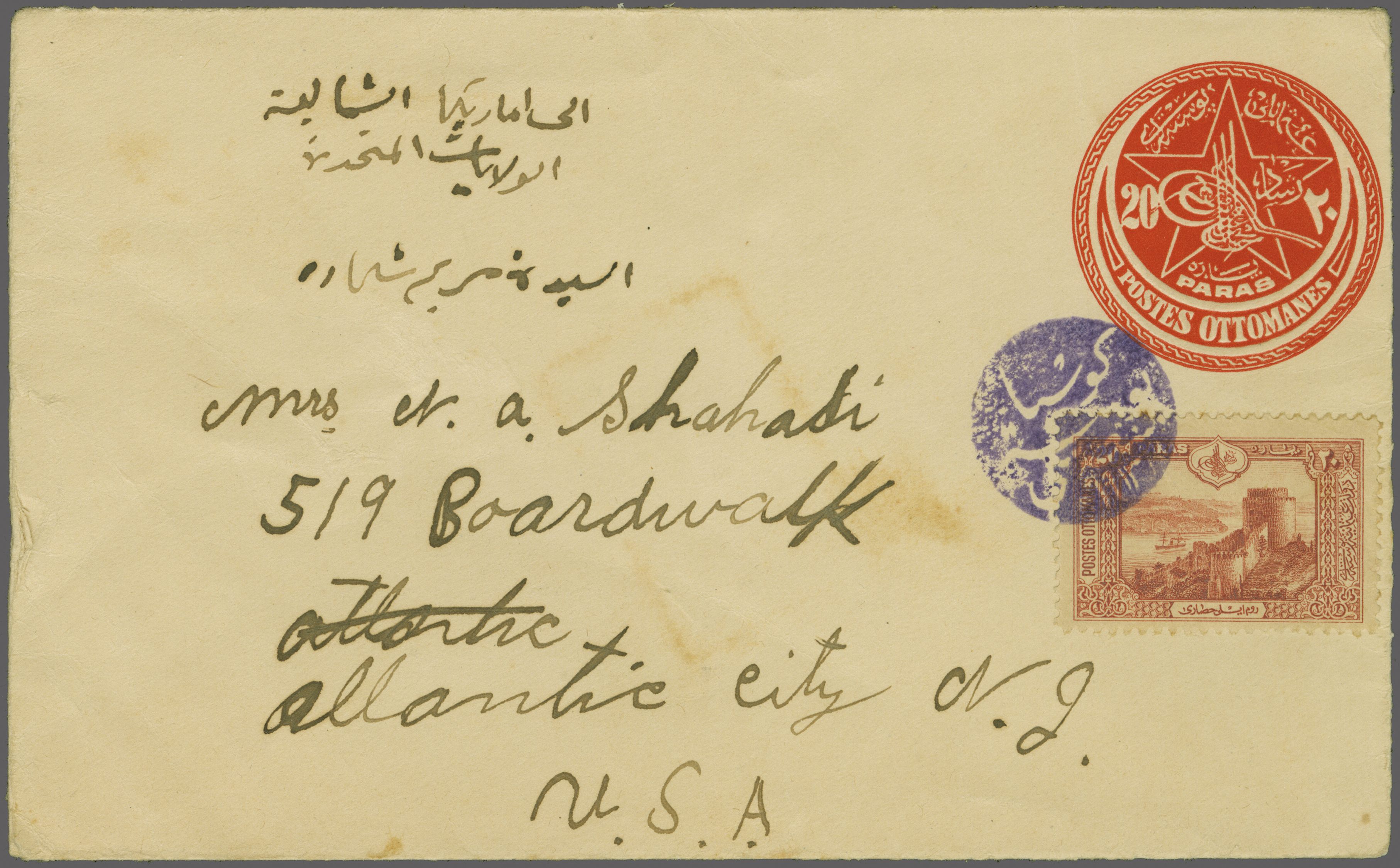 Sanjak of Djebel Lubnan - Kosba / Kûsbâ / Kospa 1914: Turkey 20 pa. red postal stationery envelope up-rated with 1914 20 pa., red and used to Atlantic City, NJ, USA tied by circular "KOSBA POSTA SHUBESI - 1913" negative seal