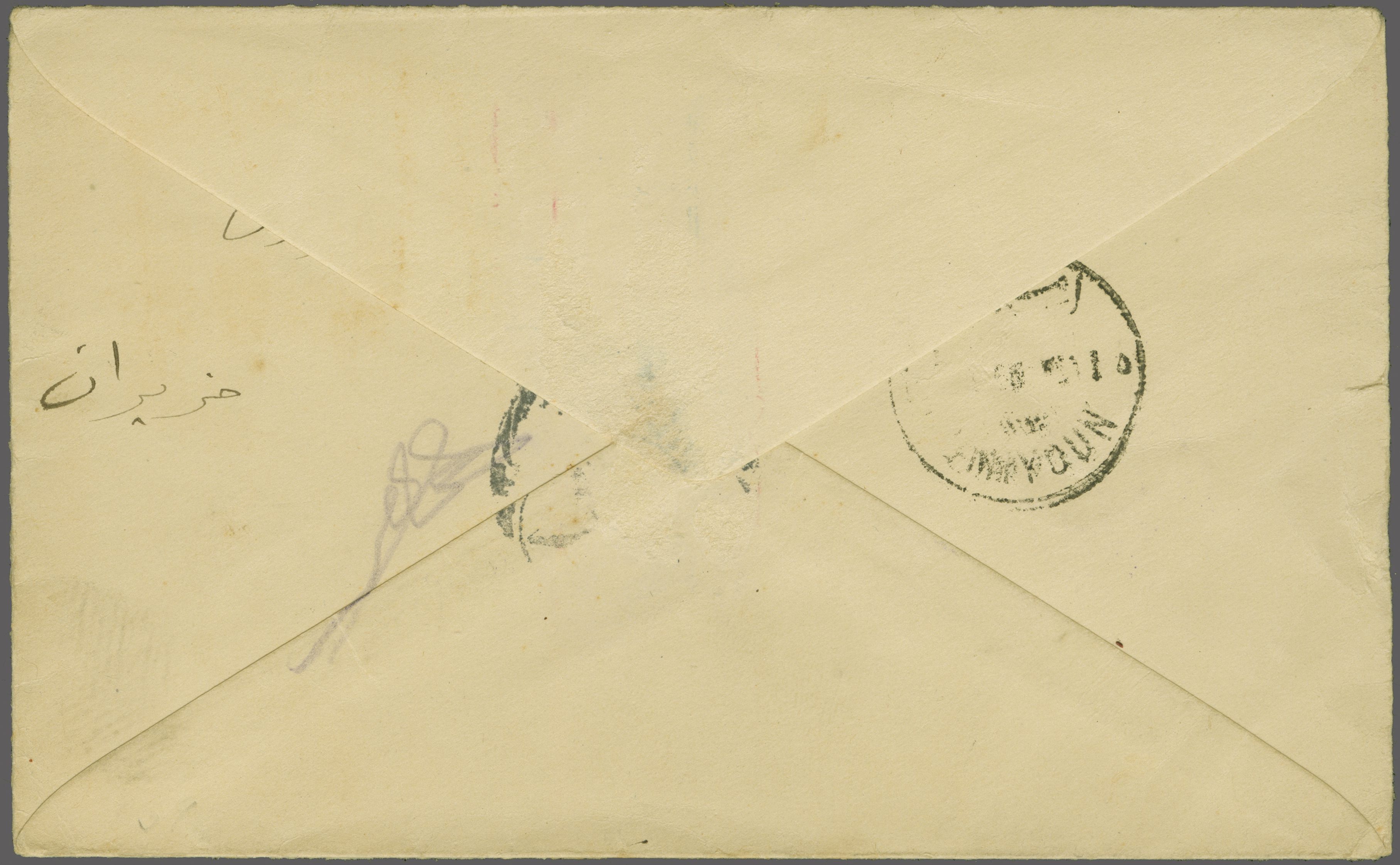 (Hosh el Zeraane Postal Branch) well struck in black (Coles & Walker unlisted, Ziya fig. 1 - rated 'R'). Moutiers St. Jean arrival cds alongside (Jan 22). Slight toning otherwise scarce and fine. Note: This cover is illustrated in the Ziya