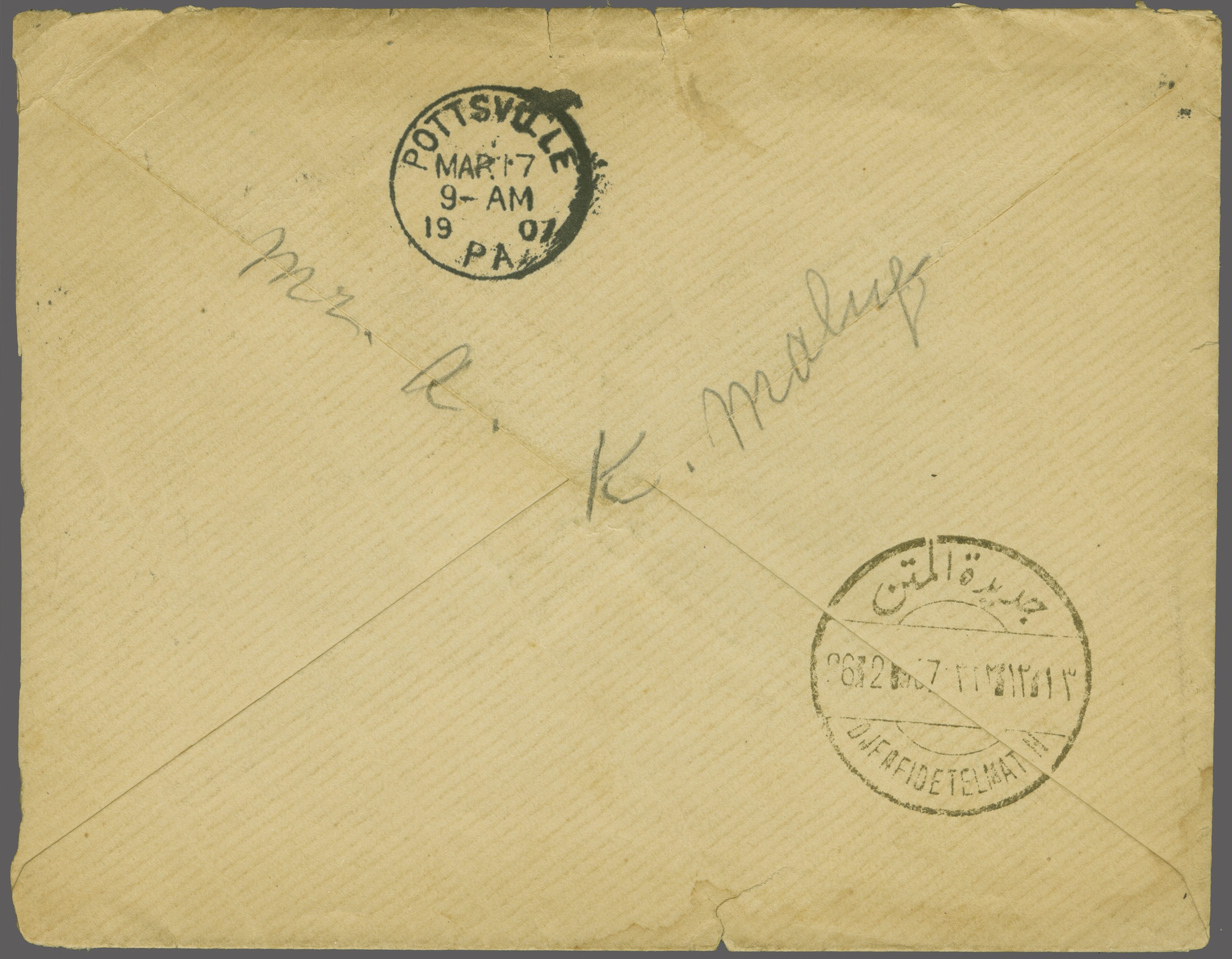 handstamp (Kafr Akkab Postal Branch 1890) superbly struck in black (Coles & Walker unlisted, Ziya fig. 1 - rated 'RRR*'). Reverse with "Djedidet el-Matn" transit (Feb 26) cds (Ziya fig. 1 - rated 'RRR') and Pottsville arrival cds (March 17) in