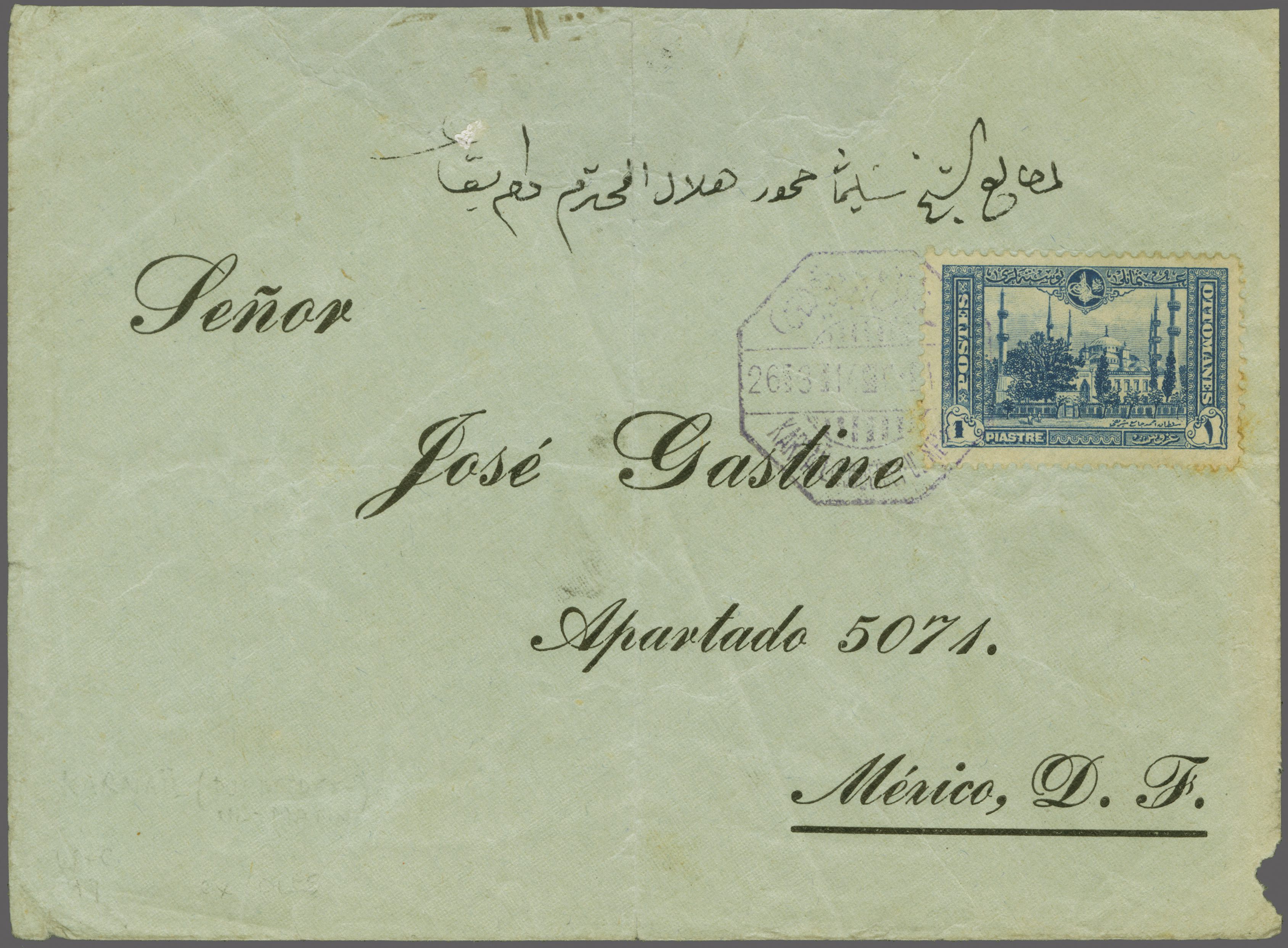 Sanjak of Djebel Lubnan - Karnail / Qarnayel 1914: Turkey 1pi. deep blue, a used example on 1914 cover to Mexico City tied by bilingual octagonal "KARNAΪL (DJEDEIDET-UL-METN)" datestamp (March 26) struck in violet (Coles &