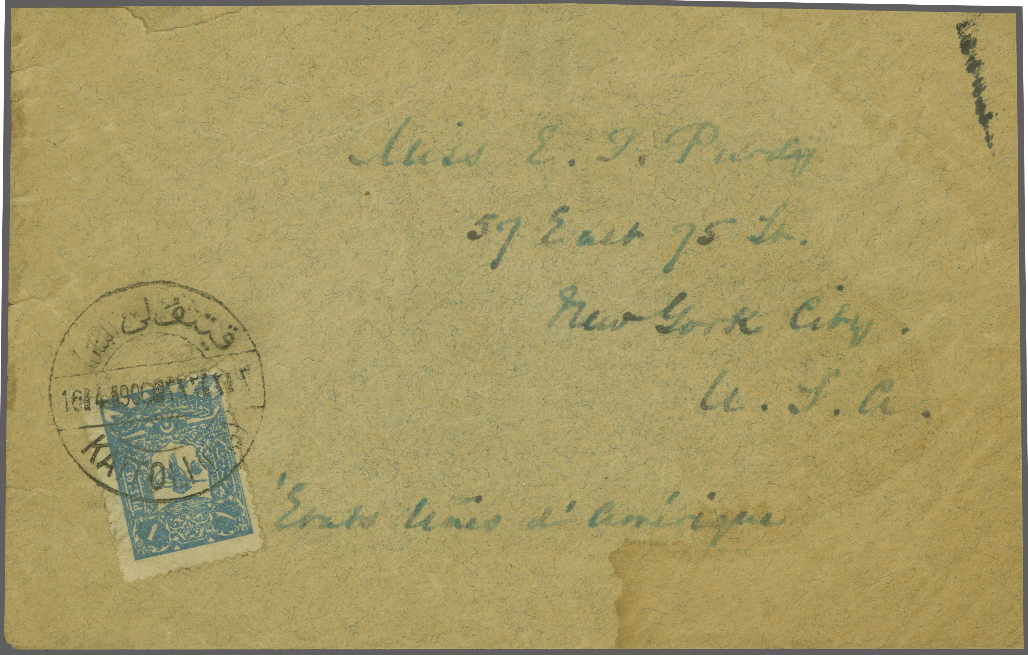 Sanjak of Djebel Lubnan - Kaitoli / Kaytuli / Qêtûli 1905: Turkey 1 pi. blue, a single example used on 1906 cover to New York, USA tied by bold strike of bilingual circular "KAITOLI (LIBAN)" datestamp (April 16) in black