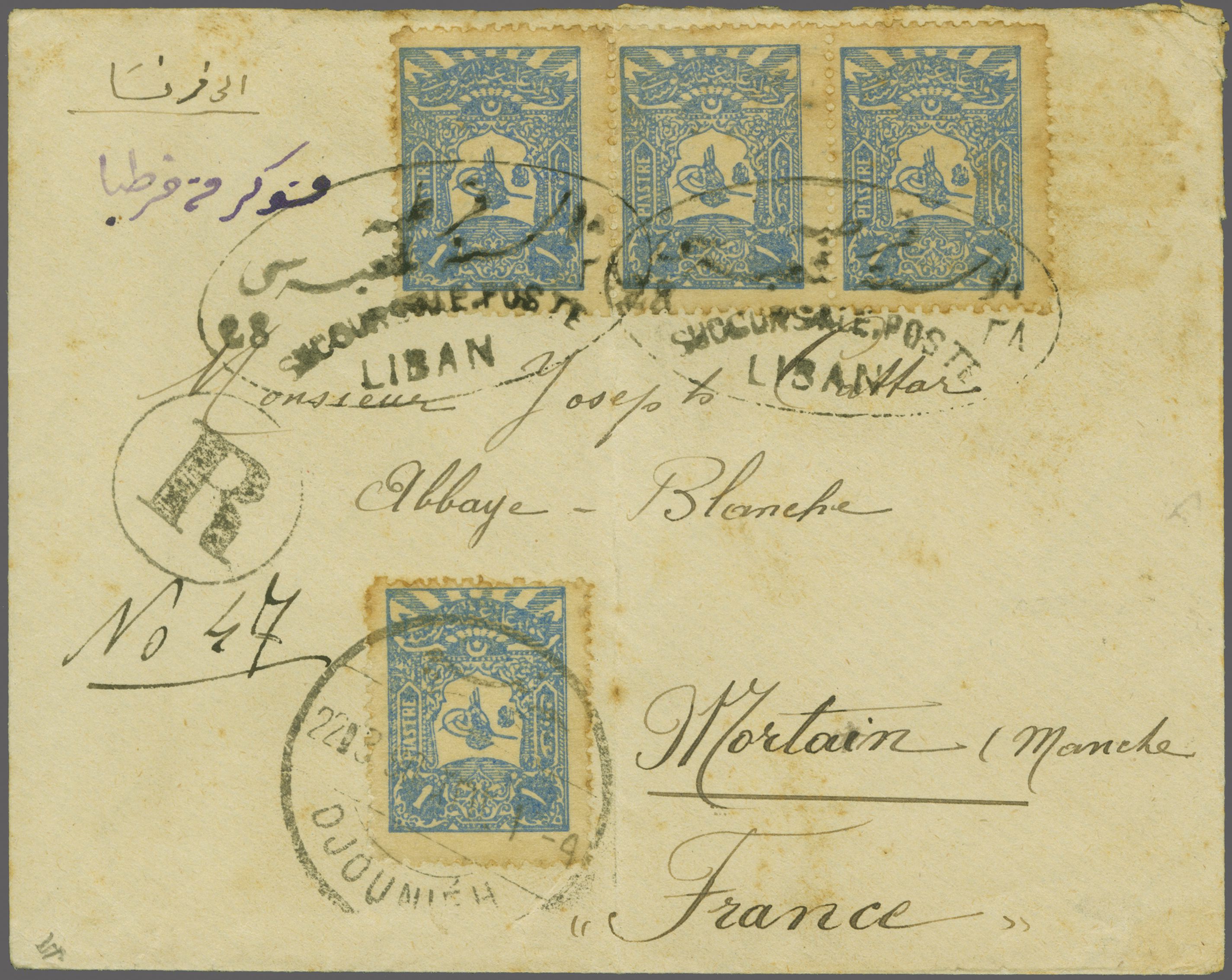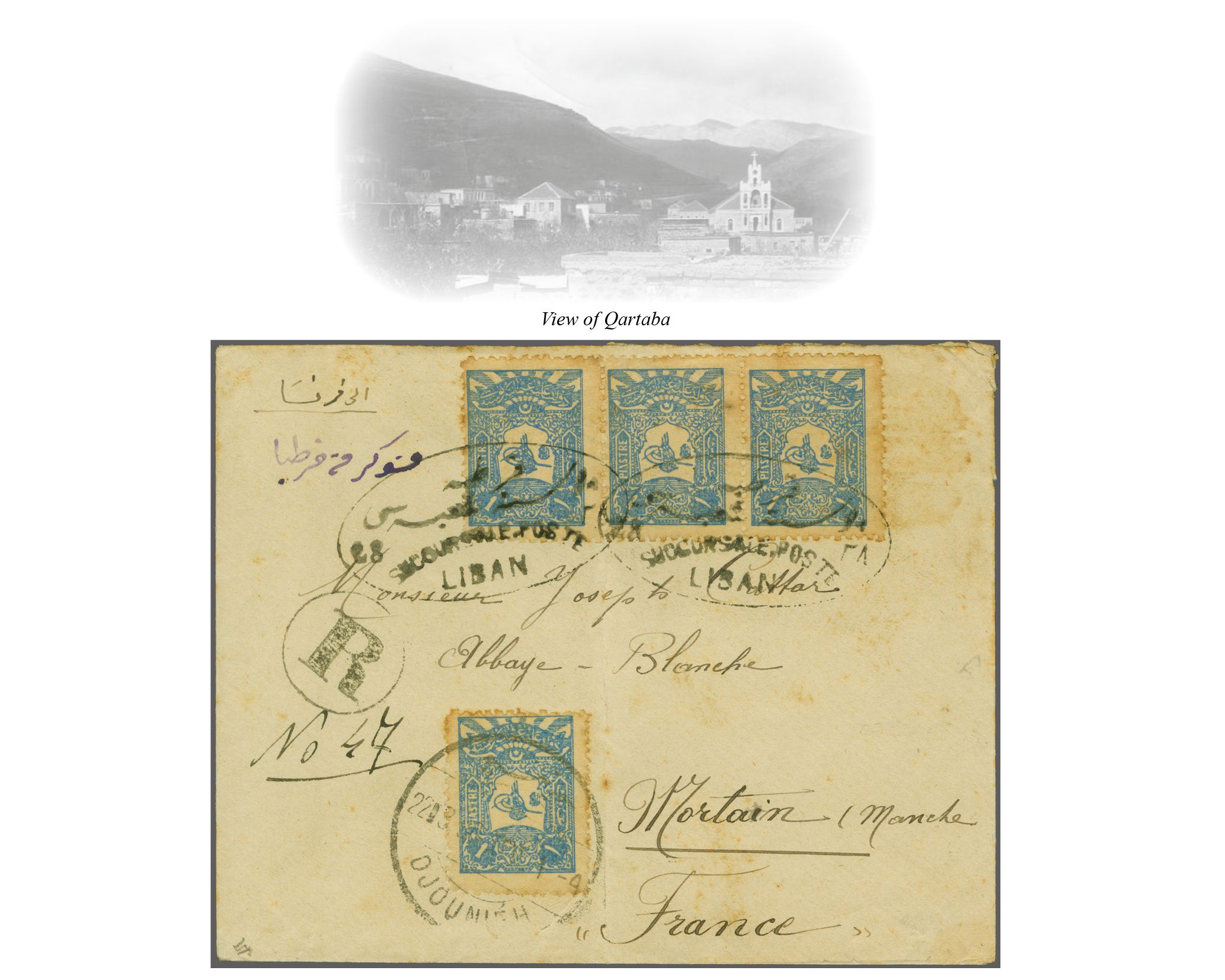 Sanjak of Djebel Lubnan - Kartaba / Kirtaba / Qartaba 1905: Turkey 1 pi. blue, a single example and a horizontal strip of three, used on 1906 triple rate registered cover to Mortain, France; the strip tied by oval framed