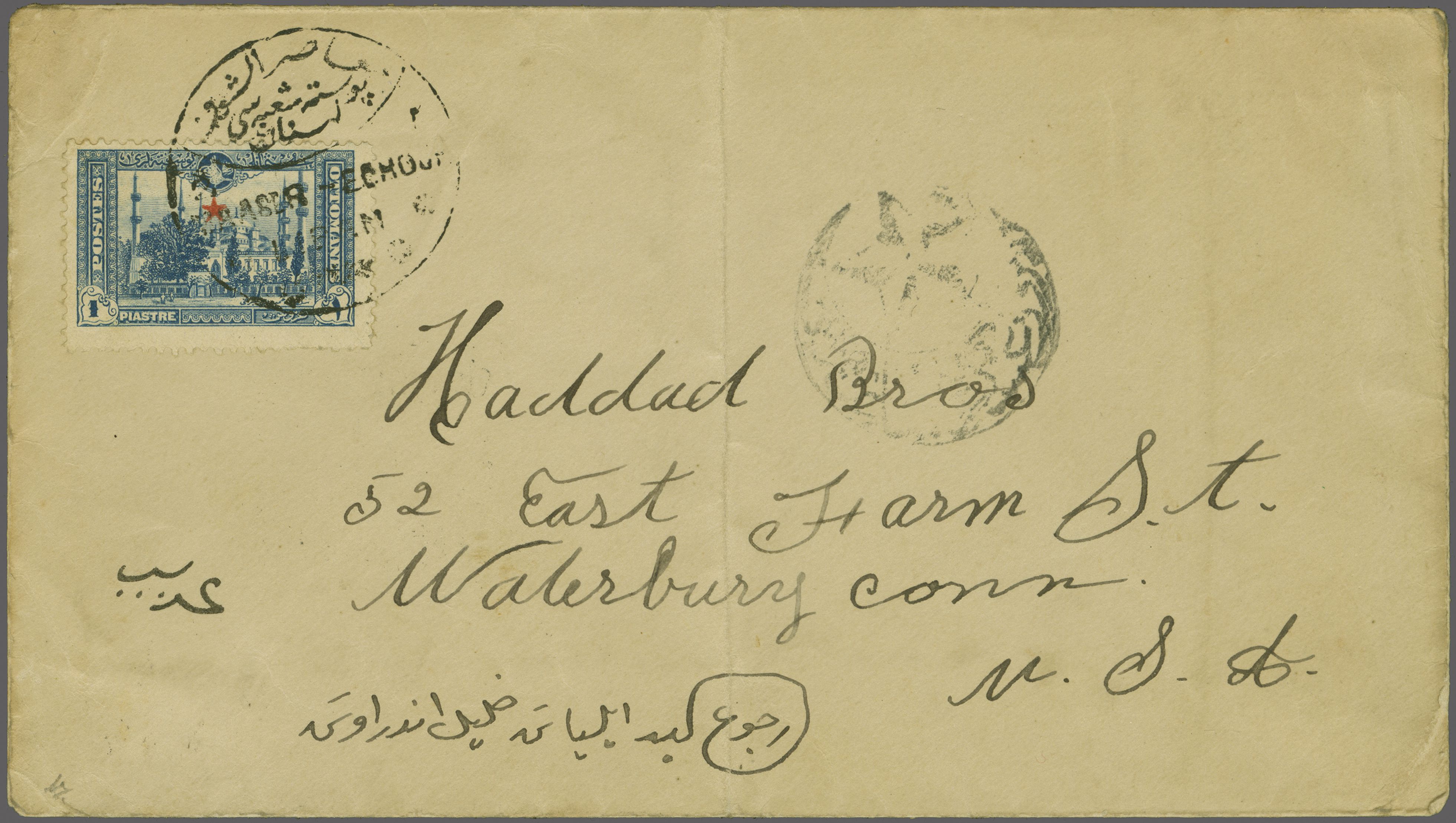 Sanjak of Djebel Lubnan - Ma'assir el Chouf / Muasrü'ş-şuf 1914: Turkey 1 pi. deep blue, a single example used on 1916 cover to Waterbury, Ct., USA tied by circular decorative "MA'ASSIR EL CHOUF LIBAN 2" handstamp (upper