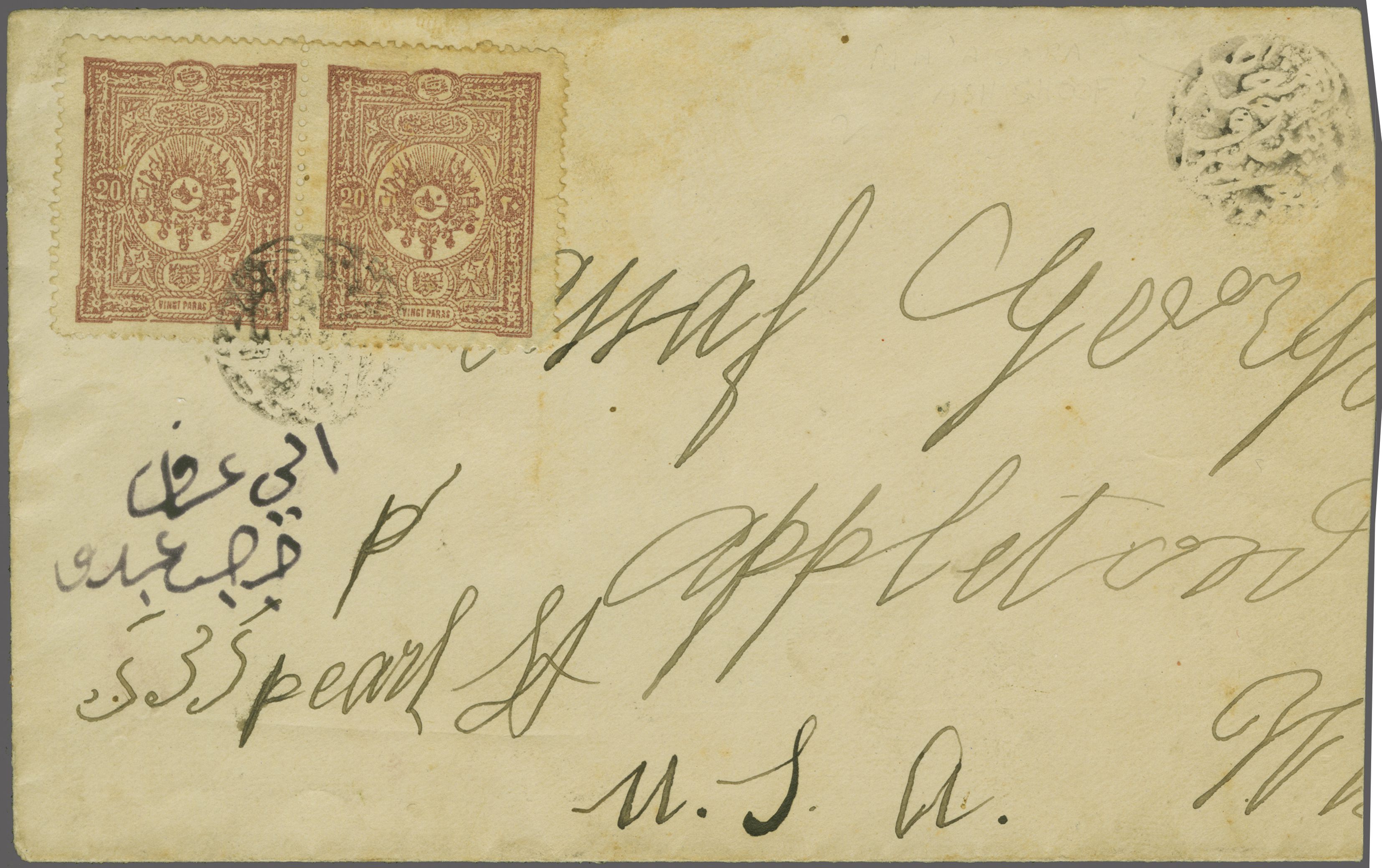 Sanjak of Djebel Lubnan - Ma'assir el Chouf / Muasrü'ş-şuf 1892: Turkey 20 pa. claret in a horizontal pair used on slightly trimmed cover to to Appleton, Wisc., USA tied by small "MA'ASSIR EL CHOUF POSTA SHUBESI" negative seal