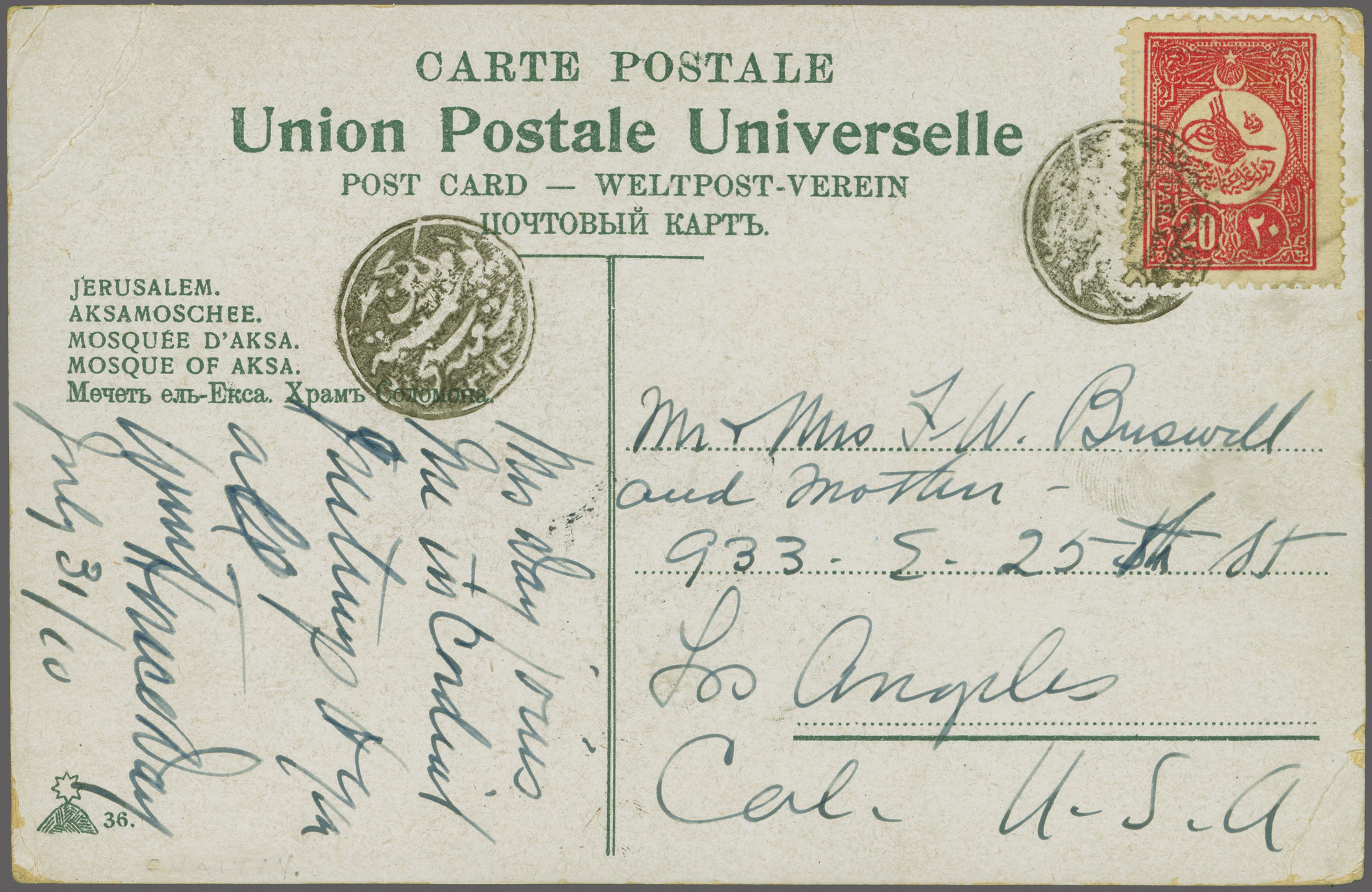 Sanjak of Djebel Lubnan - Mekkin / Mekin / Makain 1909: Turkey 20 pa. red used on 19019 postcard to Los Angeles, USA tied by small circular "MEKKIN POSTA SHUBESI - 1313" negative seal handstamp in black (Mekkin Postal Branch