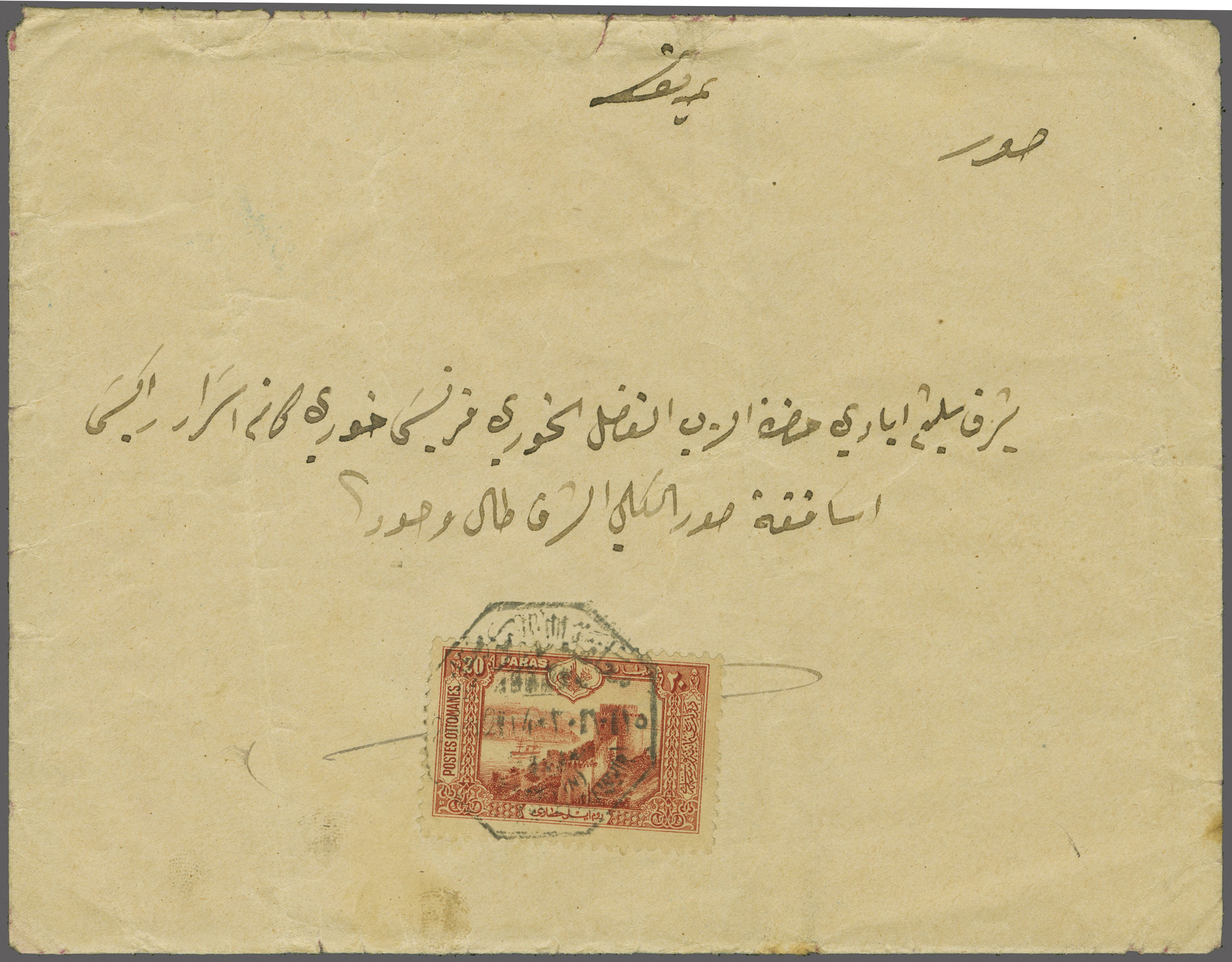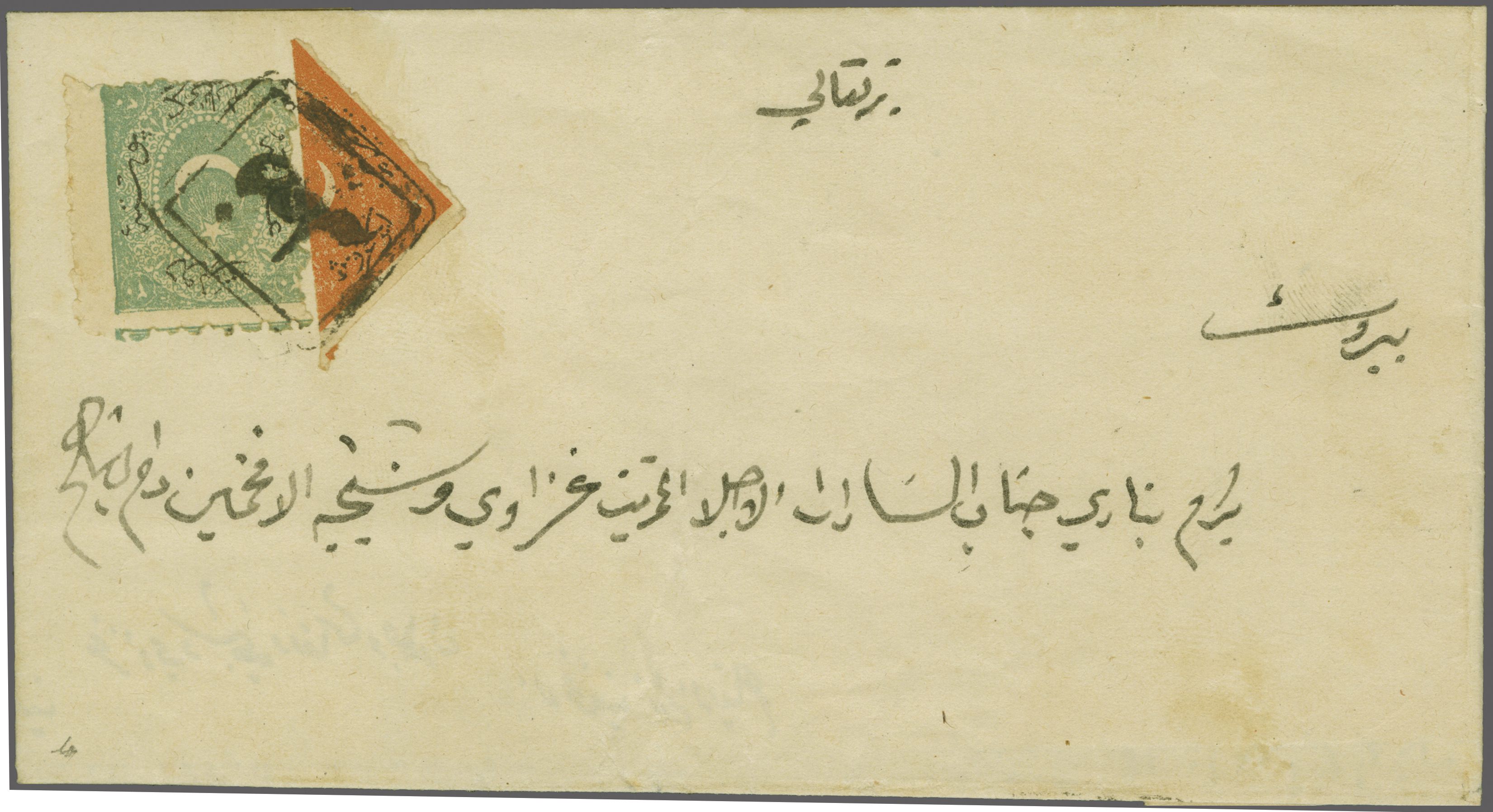 weight, tied by fine strike of double framed all arabic "ZAHLE" handstamp in black (Coles & Walker fig. 140, Ziya fig. 1 - rated 'RR'). A fine and very rare entire (Image 1)