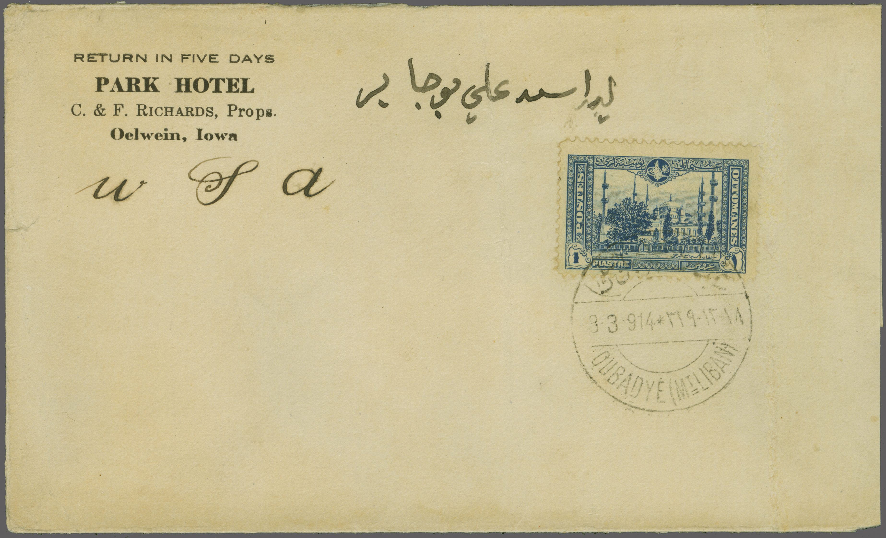 Sanjak of Djebel Lubnan - Oubadyé / Abadiye / Ebadie 1914: Turkey 1 pi. deep blue, a used example on 1914 cover to Oelwein, Iowa, USA tied by bilingual circular "OUBADYÉ (MT. LIBAN)" circular datestamp (March 3) in black