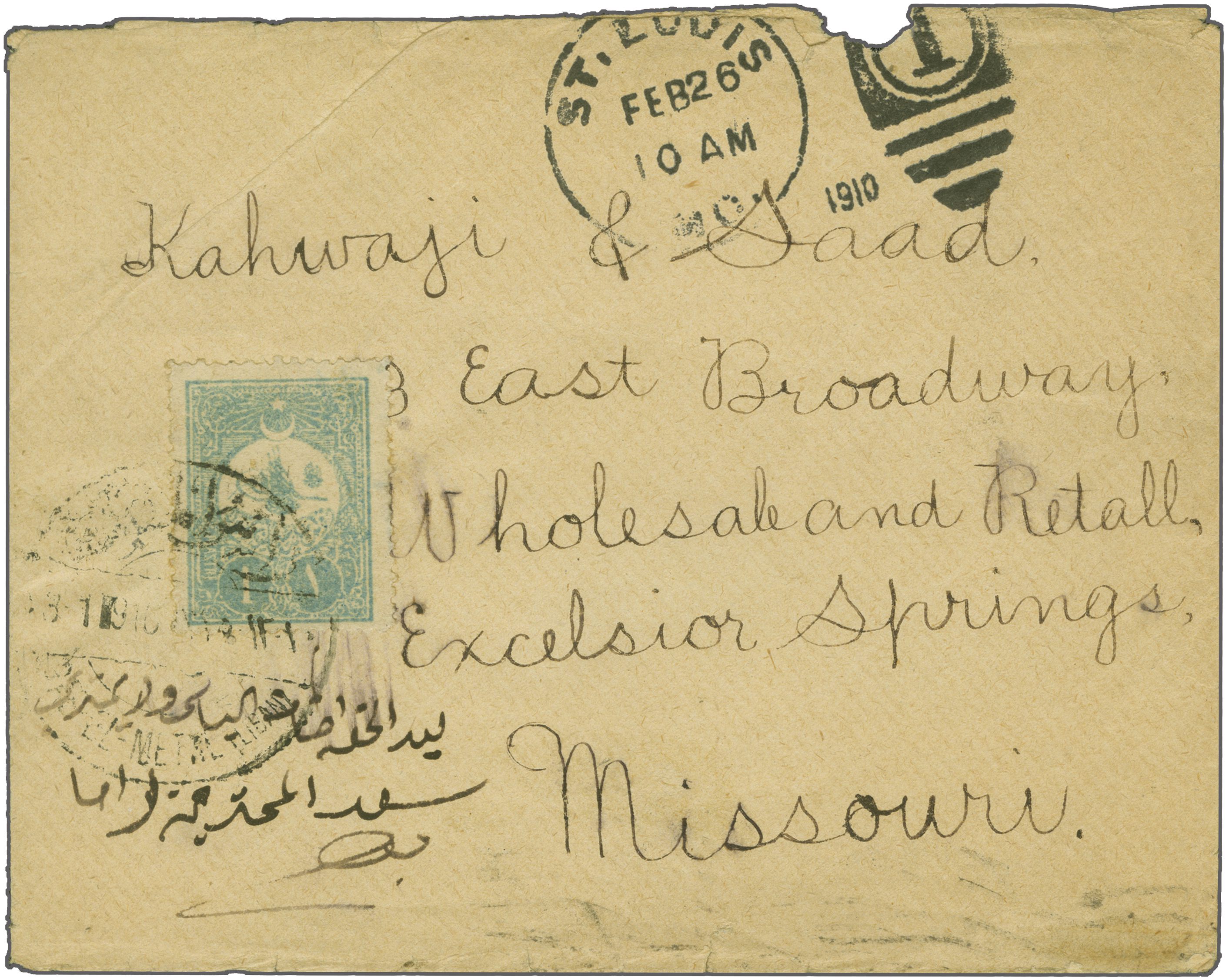 Sanjak of Djebel Lubnan - Ras-el-Metne / Re's Ülmetin 1908: Turkey 1 pi. pale blue, a used example on 1910 cover to Excelsior Springs, Missouri, USA tied by bilingual circular "RAS-EL-METN (LIBAN)" datestamp (Jan 23) in black