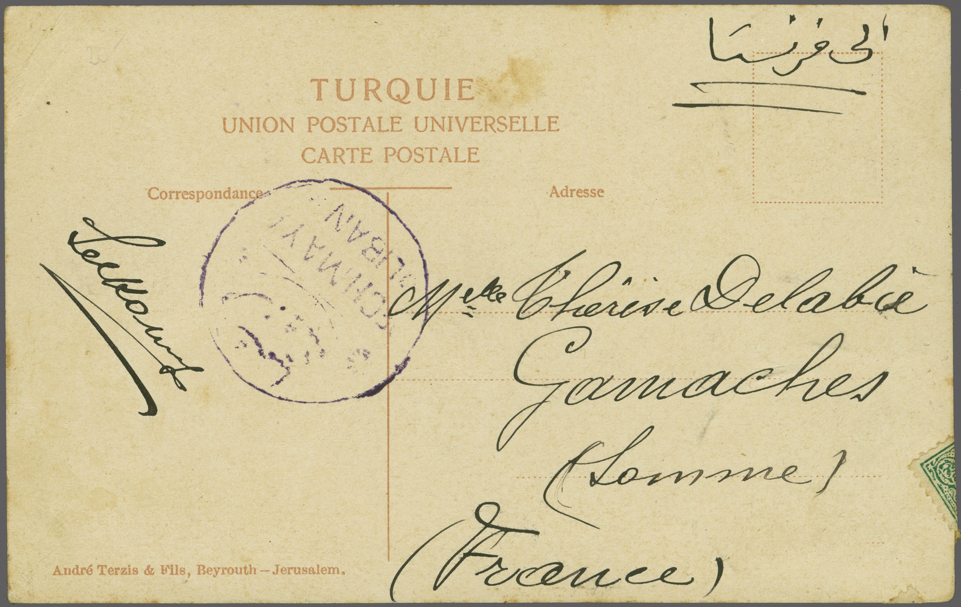Sanjak of Djebel Lubnan - Tannourine / Tennureyn / Tannûrîn 1905: 20 pa. red used on 1908 postcard to St. Junien, France tied by circular "TANNOURINE POSTA SHUBESI" negative seal handstamp in black (Coles & Walker
