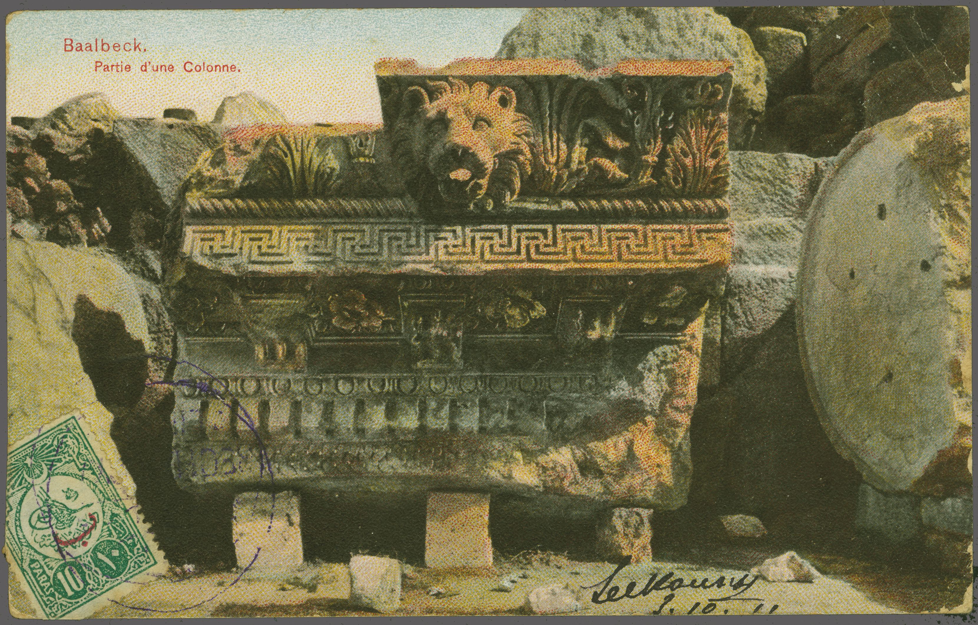 Sanjak of Djebel Lubnan - Rechmaya / Reşmaya - Reşima / Rişmayyâ 1909/11: 10 pa. green used on picture side of postcard to France with reverse showing decorative circular bilingual "RECHMAYA / LIBAN" handstamp with upper half