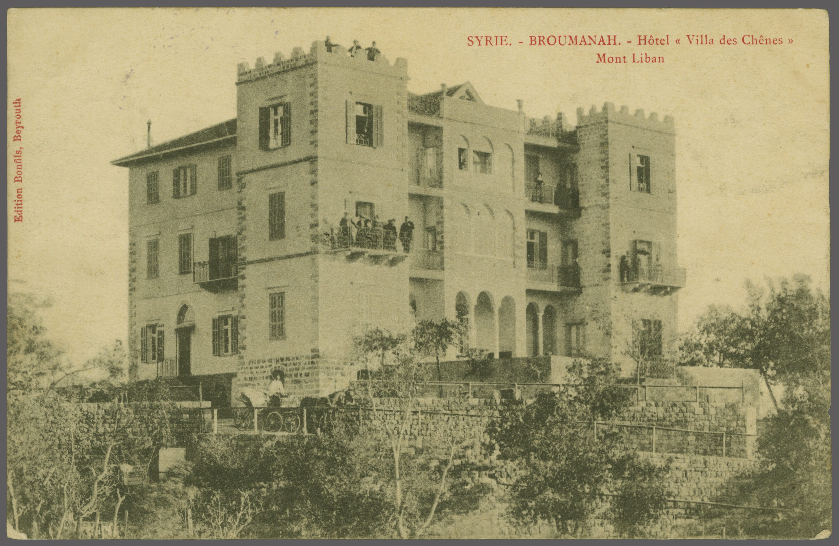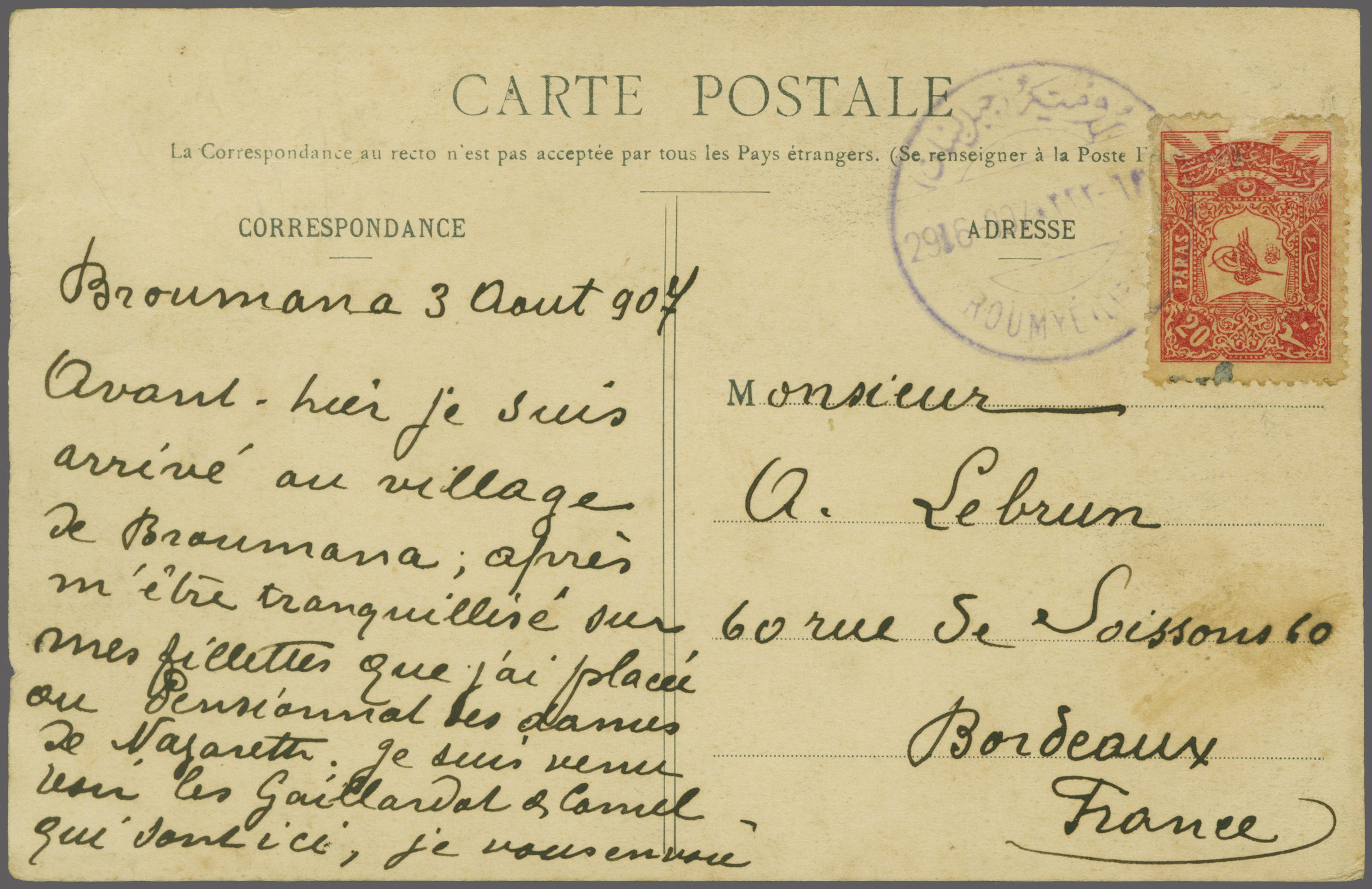Sanjak of Djebel Lubnan - Roumye / Rumye 1905: Turkey 20 pa. red, slight faulty used example on 1907 postcard written from Broumana to France tied by circular "ROUMYÉ (LIBAN)" datestamp (June 29) well struck in violet (Coles