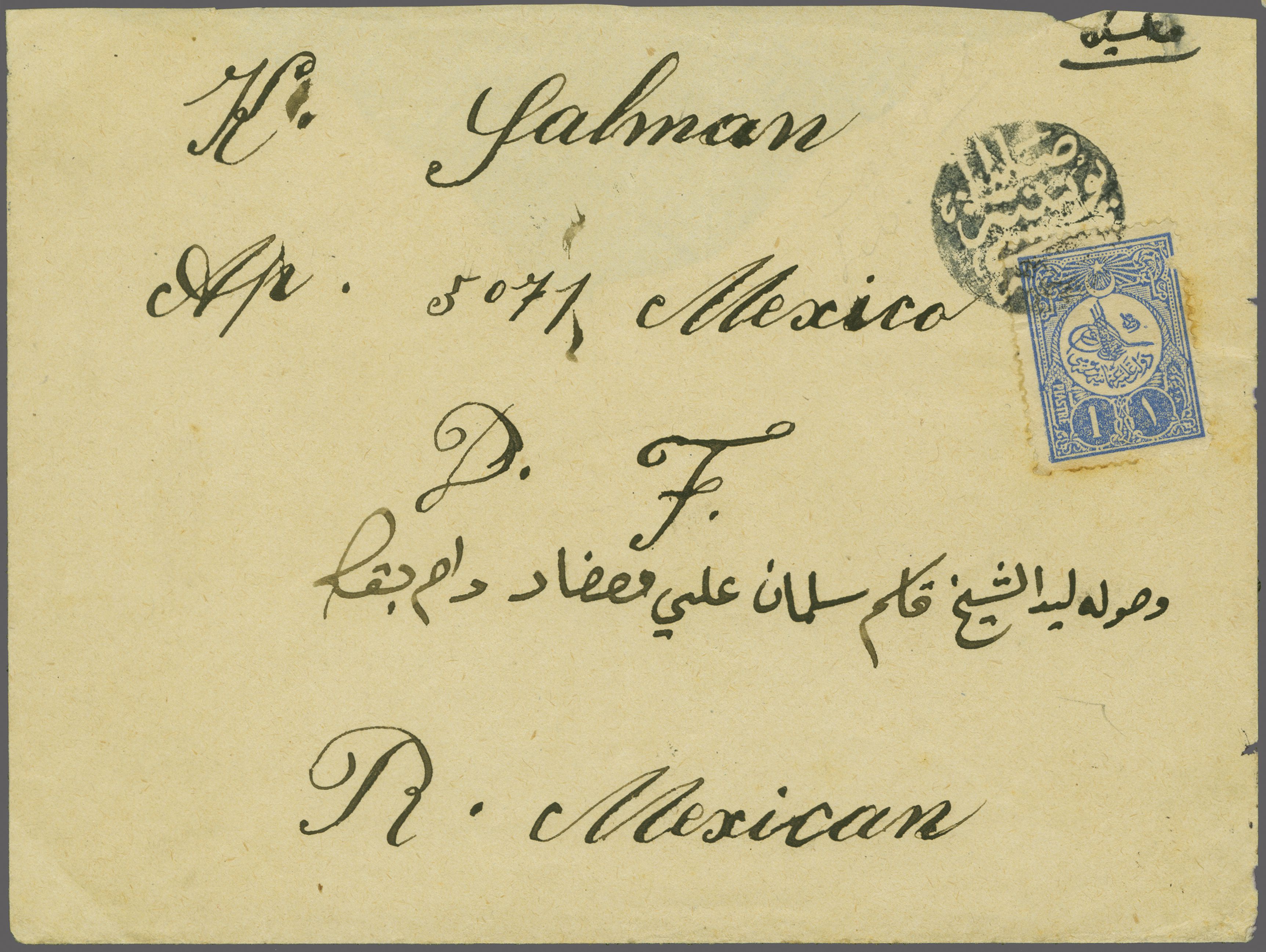 Sanjak of Djebel Lubnan - Salima / Salîma 1909: Turkey 1 pi. blue, a used example, small perf. fault, on circa 1910 cover to Mexico City, tied by circular negative SALIMA POSTA SHUBESI" negative seal handstamp (Salima Postal