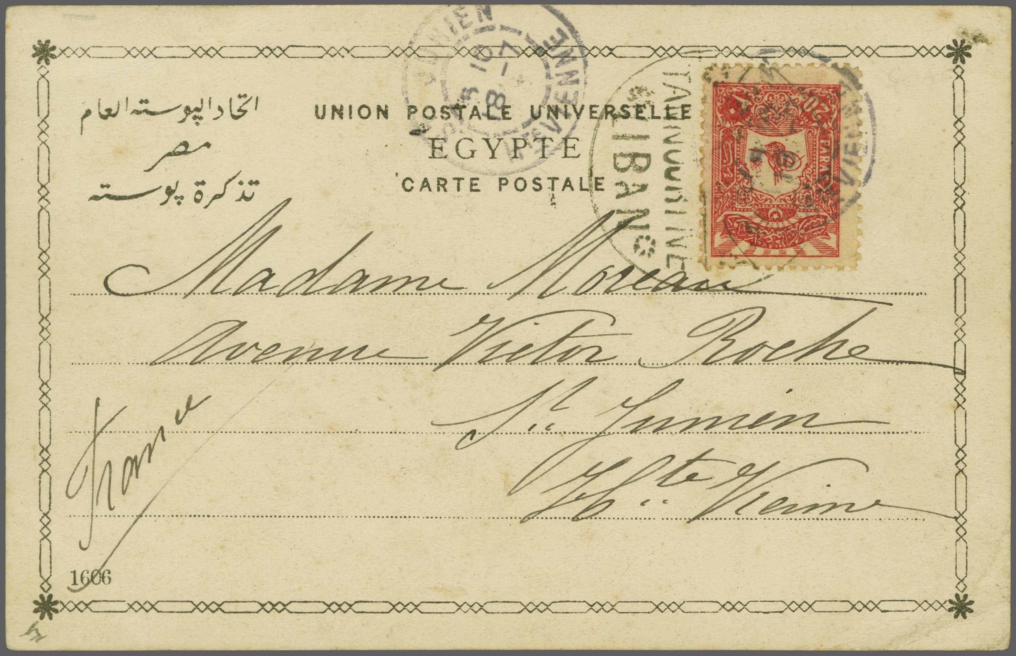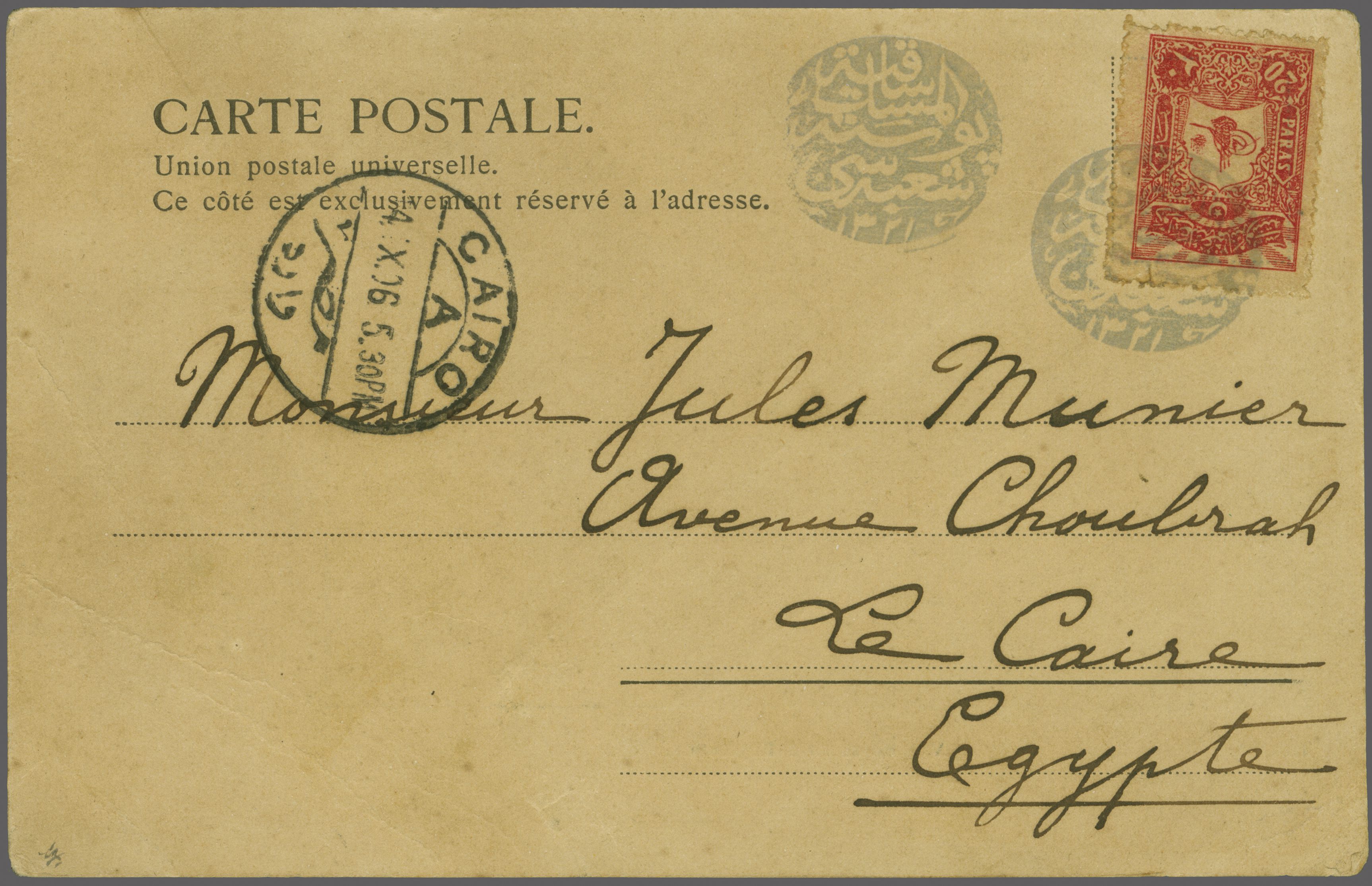 black with repeated information strike alongside (Coles & Walker unlisted, Ziya unlisted). Cairo arrival cds (Oct 4) at left. Superb and believed unique (Image 1)