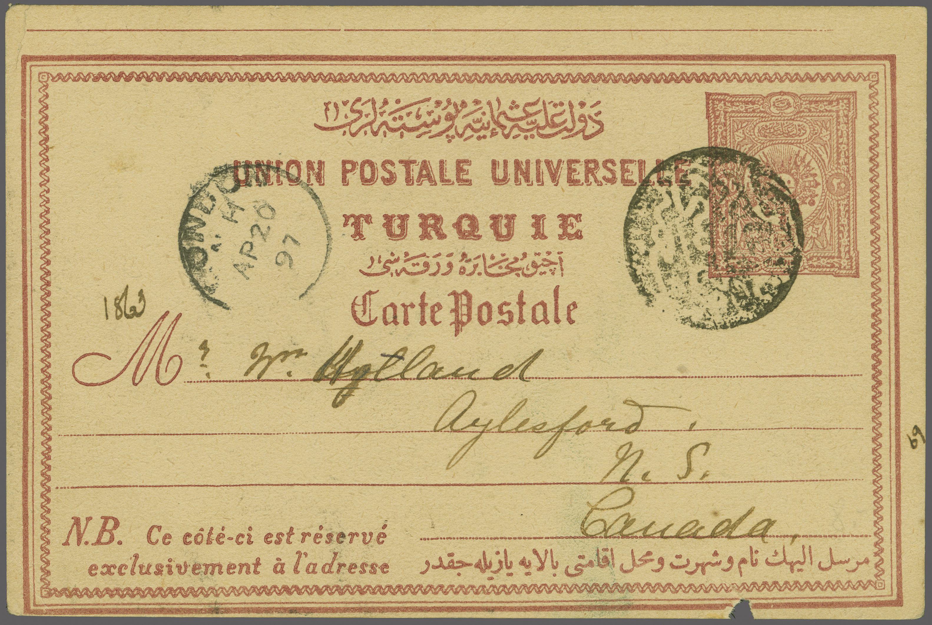 Sanjak of Djebel Lubnan - Shevir / Shuwair / Şeviyr 1892: Turkey 20 pa. claret postal stationery card used in 1897 to Aylesford, Nova Scotia, Canada cancelled by fine strike of circular "SHEVIR POSTA SHUBESI - 1308" negative