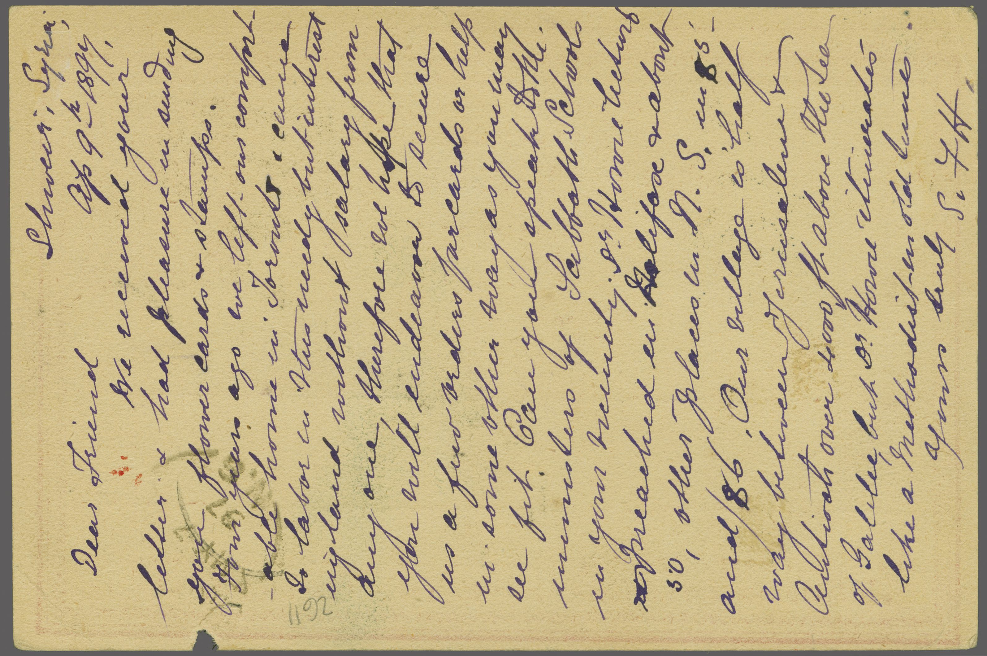 seal handstamp (Shevir Postal Branch 1892) in black (Coles & Walker fig. 199, Ziya fig. 1 - rated 'RRR'). Interesting message from missionary "Our village is half way between Jerusalem and Antioch, 4'000 feet above the Sea of Galilee". Small nick