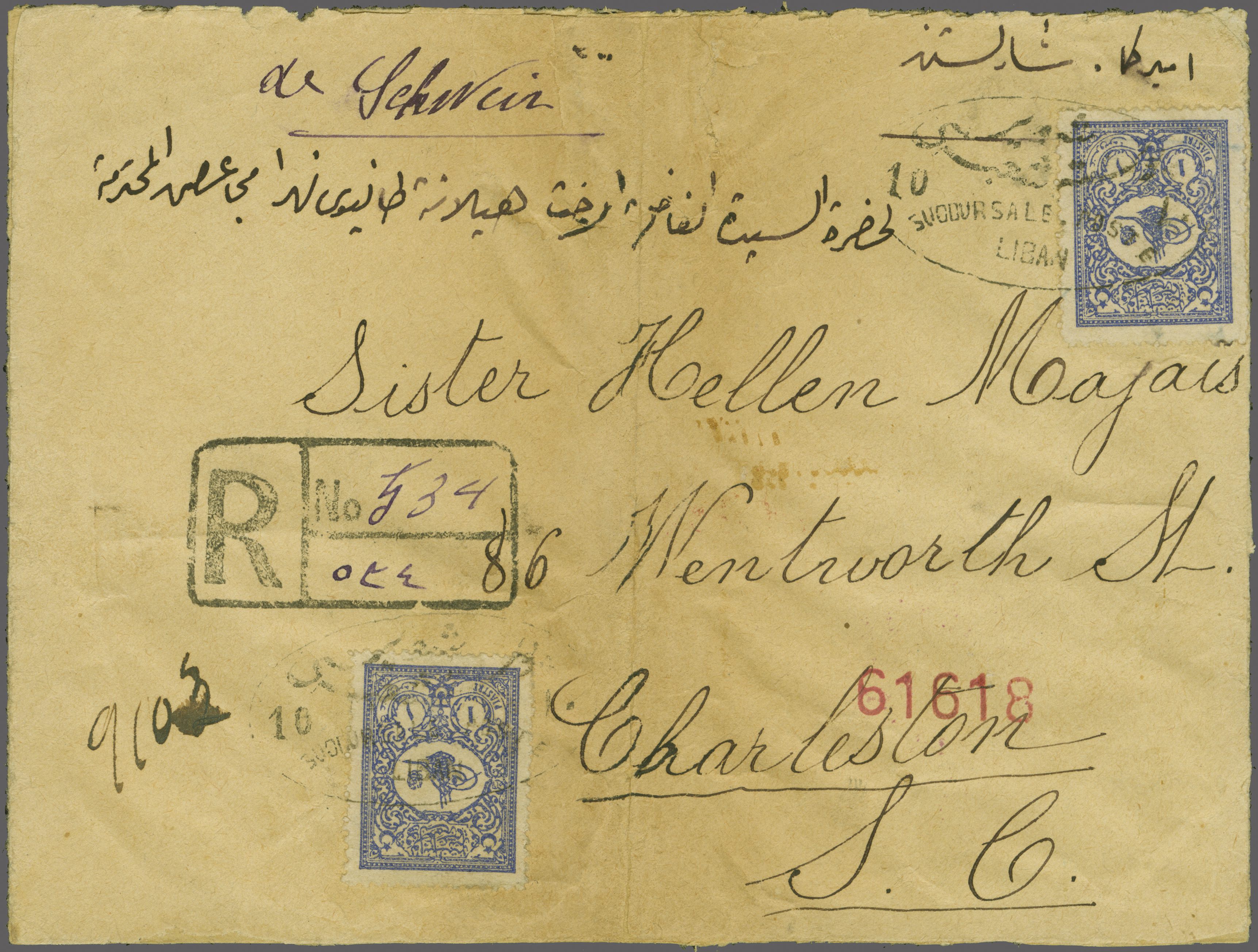 Sanjak of Djebel Lubnan - Shevir / Shuweir / Şeviyr 1901: Turkey 1 pi. violet-blue, two examples used to pay the registered rate on cover front to Charleston, SC, USA endorsed "de Schweir" each tied by oval framed bilingual