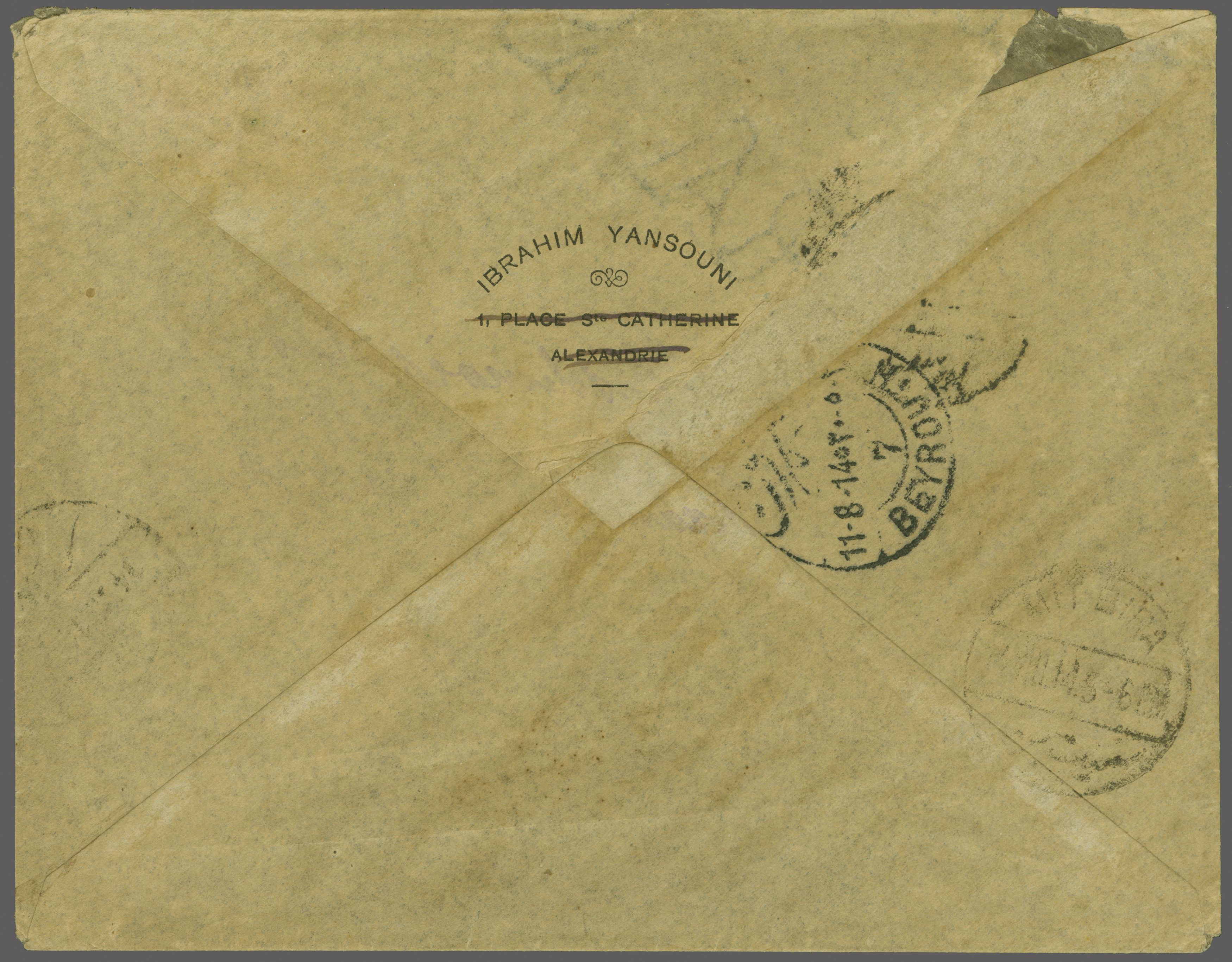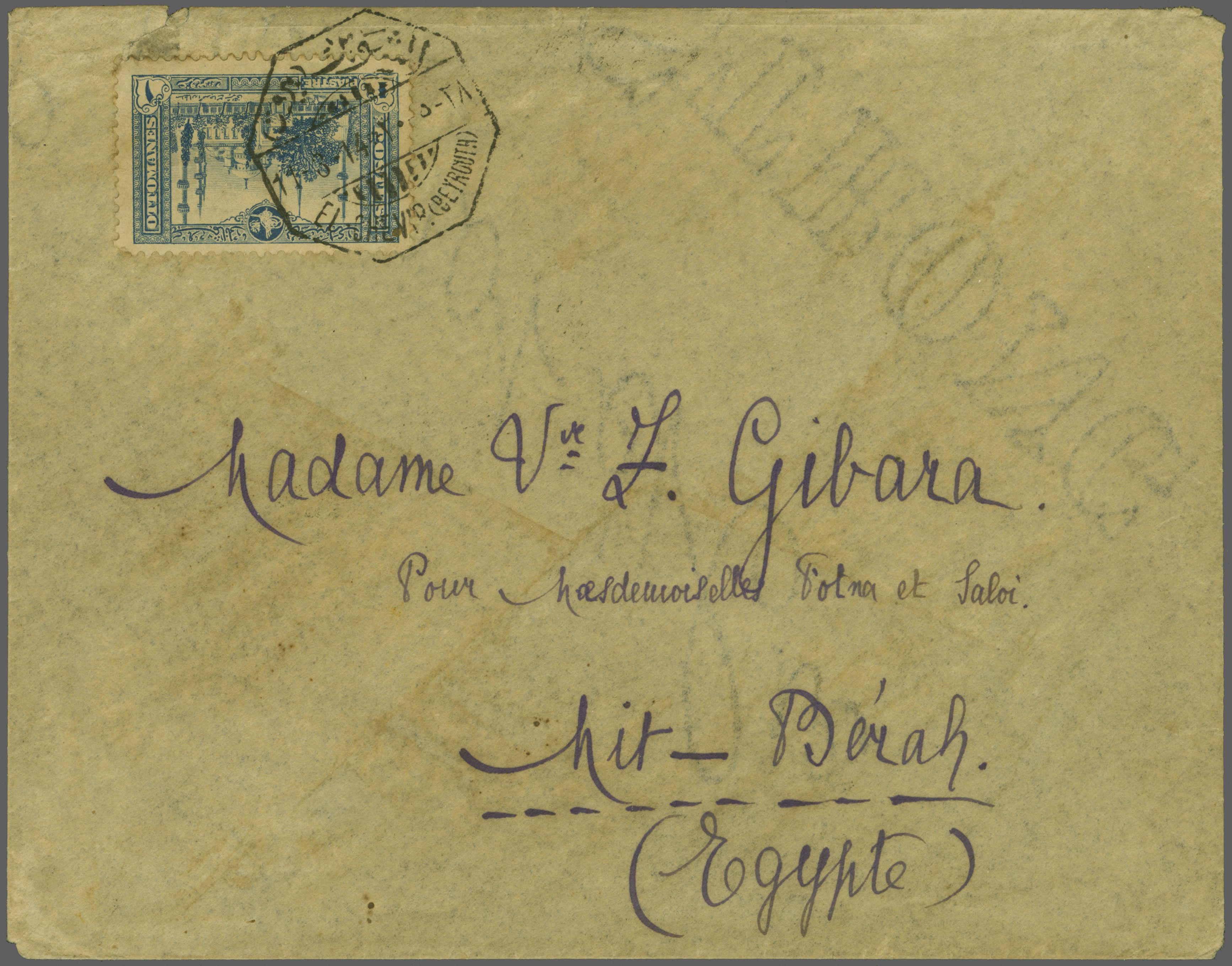 unlisted, Ziya fig. 3 - rated 'RRR'). Reverse with "Beyrouth / 7" transit cds and Mit-Bira arrival. Small nick at top of envelope but just one card and this cover recorded (Image 1)