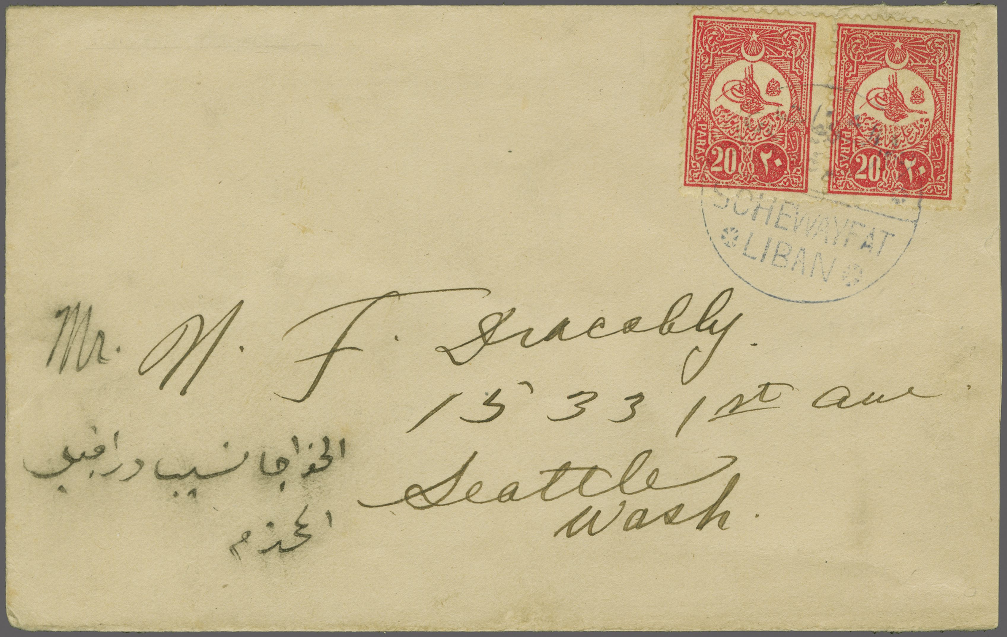 Sanjak of Djebel Lubnan - Schewayfat / Şuveyfat 1909: Turkey 20 pa. rose-red horizontal pair used on cover to Seattle, WA, USA tied by bold strike of decorative circular "SCHEAWAYFAT POSTA SHUBESI" handstamp in blue (Coles